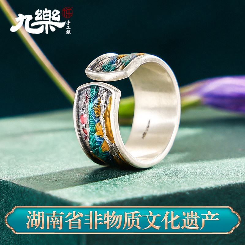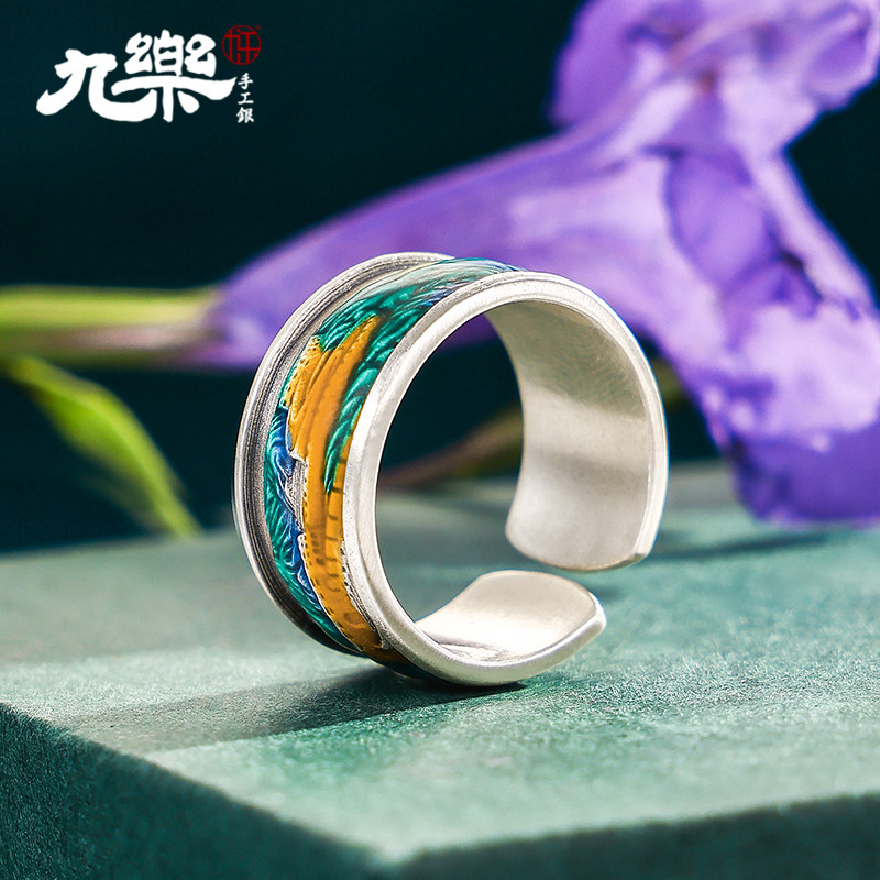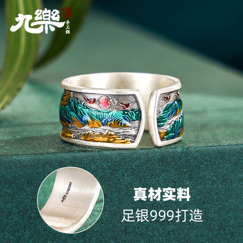 九乐足银999银戒指女原创国潮风万里江山彩绘开口纯银指环送女友