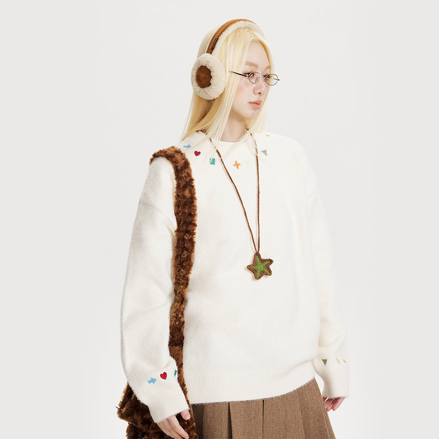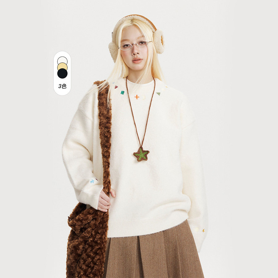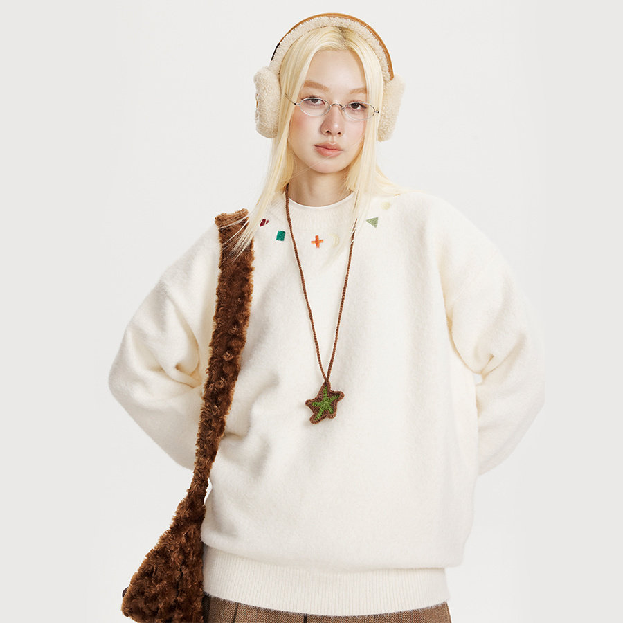美式复古奶油风复古刺绣圆领毛衣男女情侣款宽松针织衫保暖上衣09