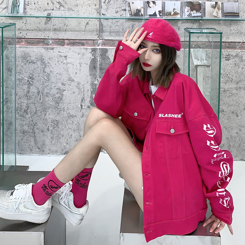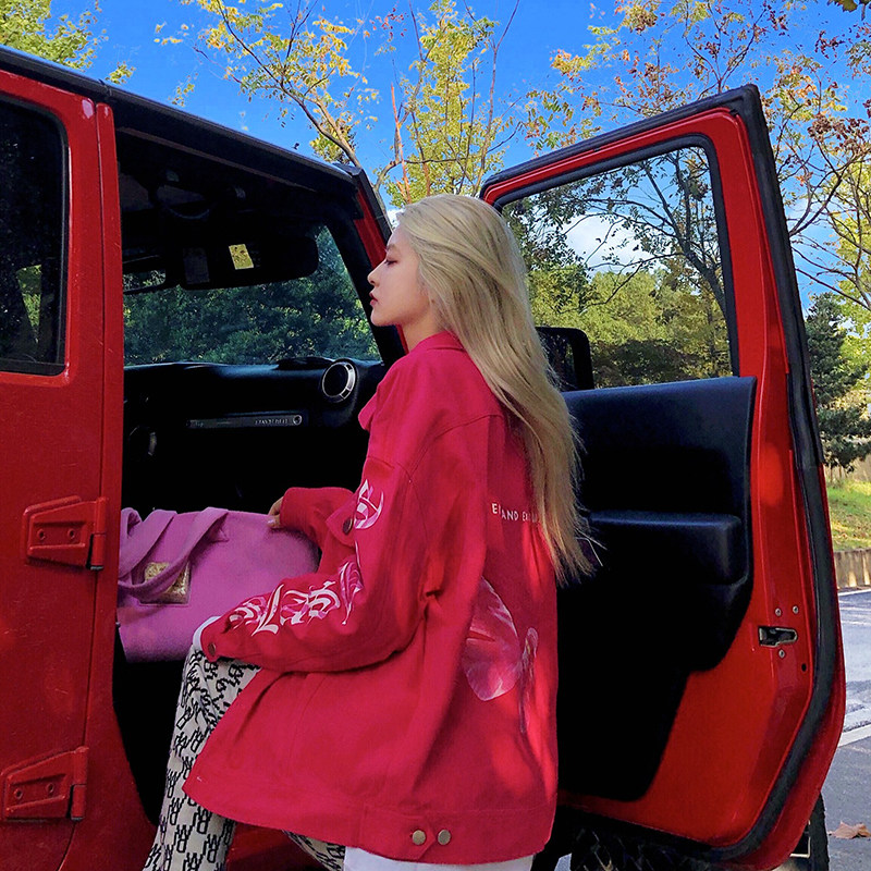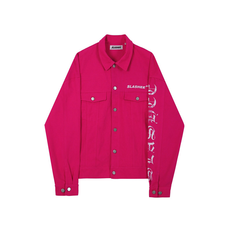 SLASHEE原创潮牌玫红色牛仔印花夹克情侣秋冬国潮秋季外套男高街