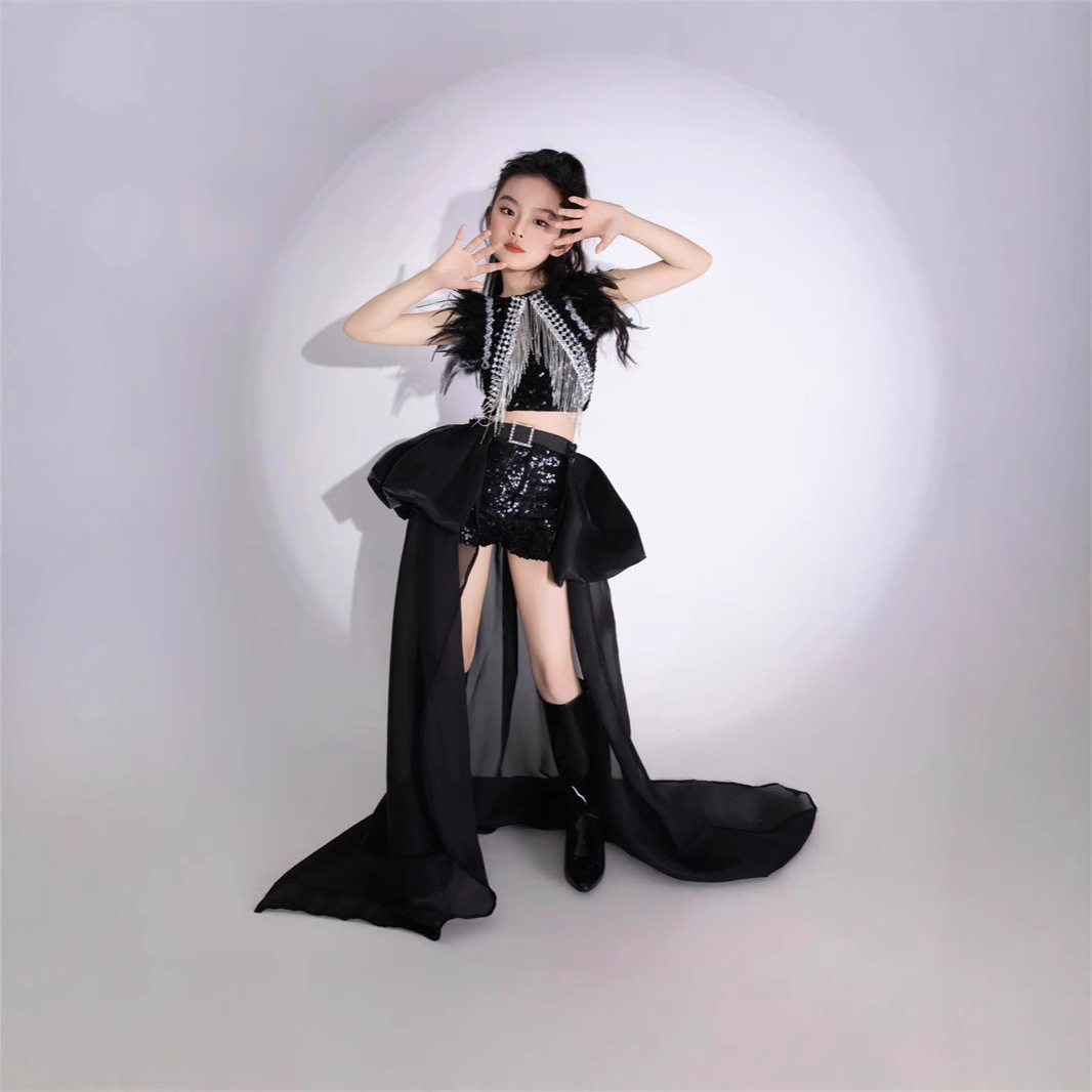儿童T台模特走秀服黑色亮片拖尾潮服PK赛服疾风运动酷帅套装拍摄