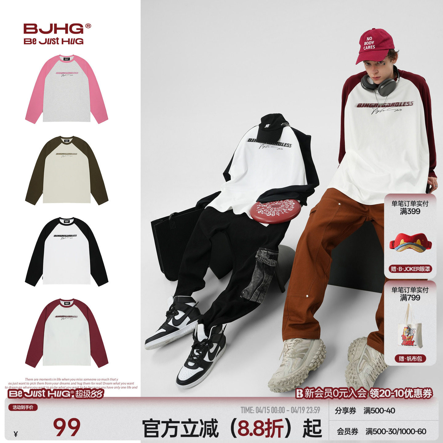 BJHG不计后果 美式插肩长袖t恤男款春季打底衫纯棉内搭拼色卫衣女