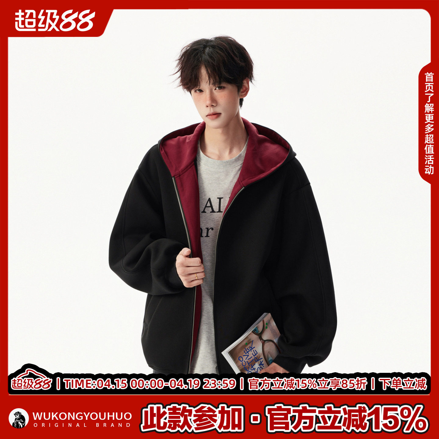 --------------------- 悟空有货潮牌美式重磅开衫连帽卫衣男女秋季宽松百搭撞色情侣外套 【原售价】216元 【现售价】91元 【推荐理由】