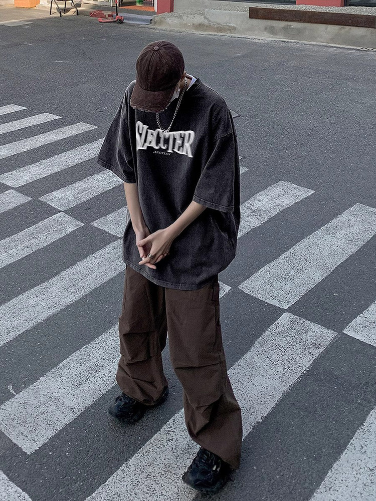 wassup happy美式水洗短袖t恤男夏季2025新款上衣宽松半袖打底衫