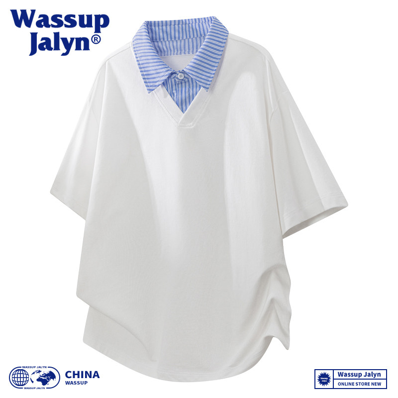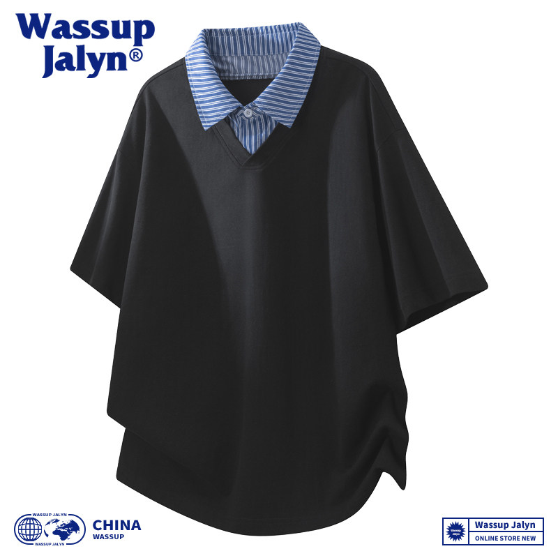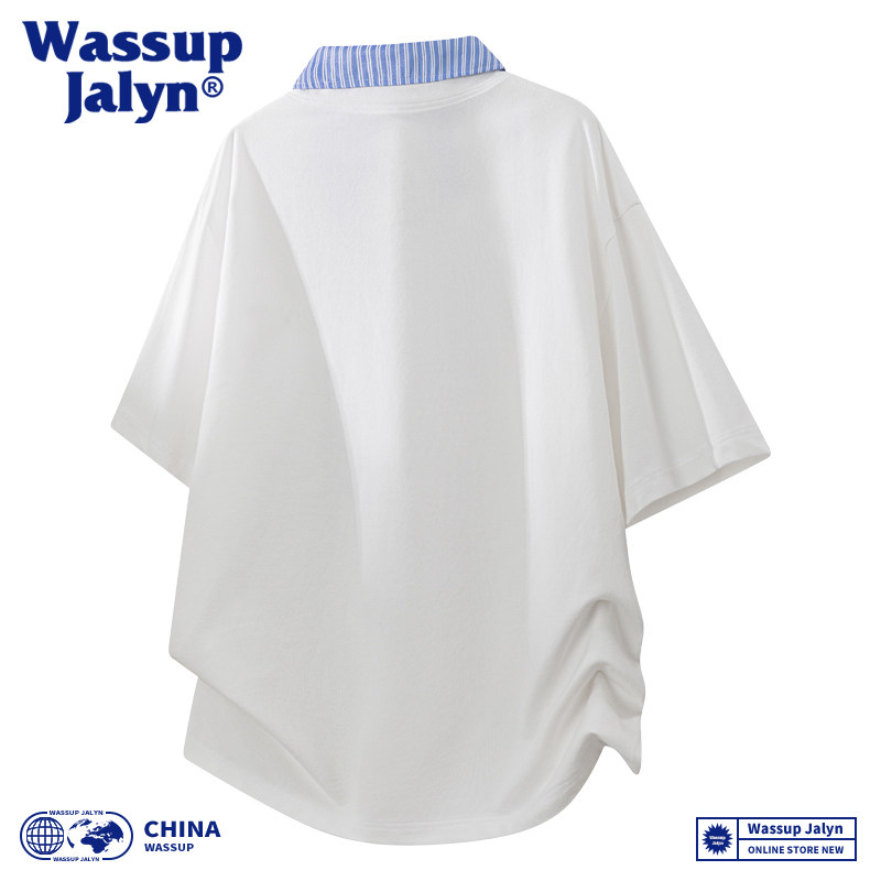 WASSUP JALYN夏季拼接假两件短袖POLO衫男女潮牌宽松情侣百搭T恤