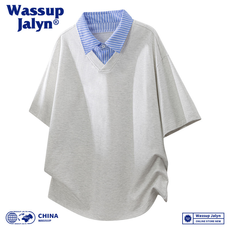 --------------------- WASSUP JALYN夏季拼接假两件短袖POLO衫男女潮牌宽松情侣百搭T恤 【原售价】70.47元 【现售价】59.87元 【推荐理由】