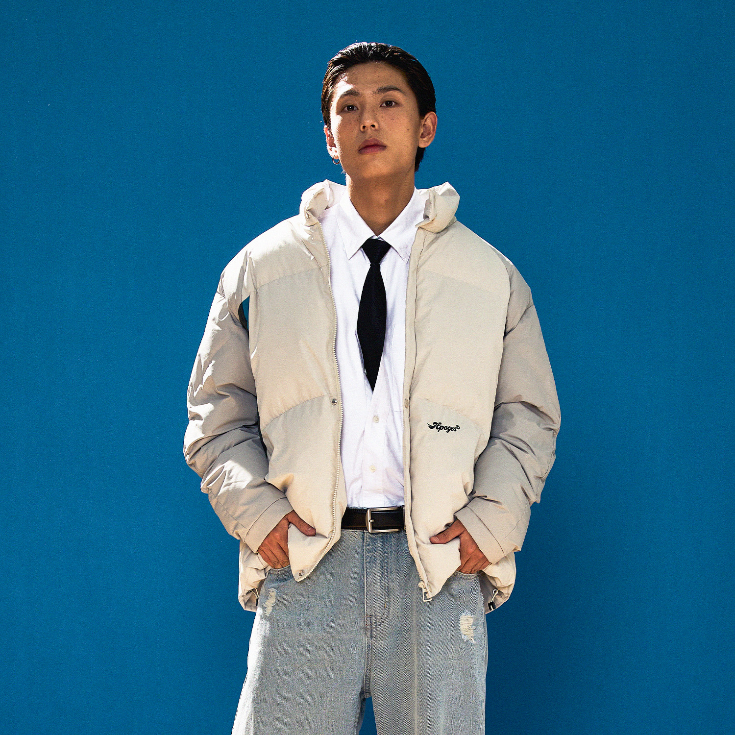 APOGE3阿保机 哈灵顿拼色羽绒服男宽松休闲潮牌外套白鸭绒美式