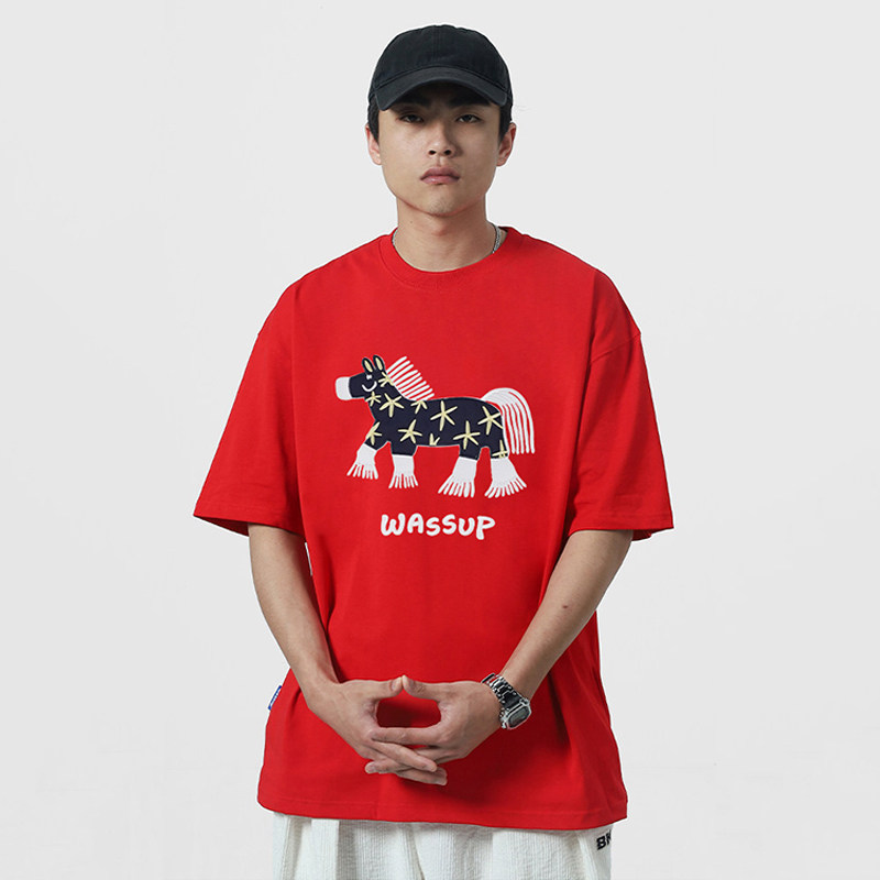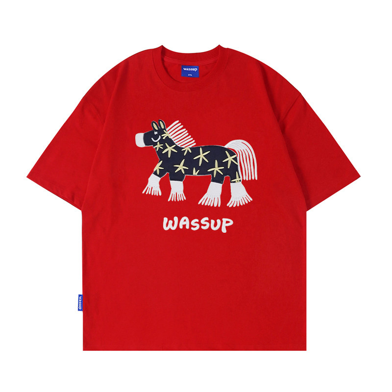 WASSUP中国红马年贴片绣花短袖T恤男夏季2026新款情侣体恤衫上衣