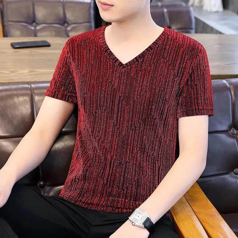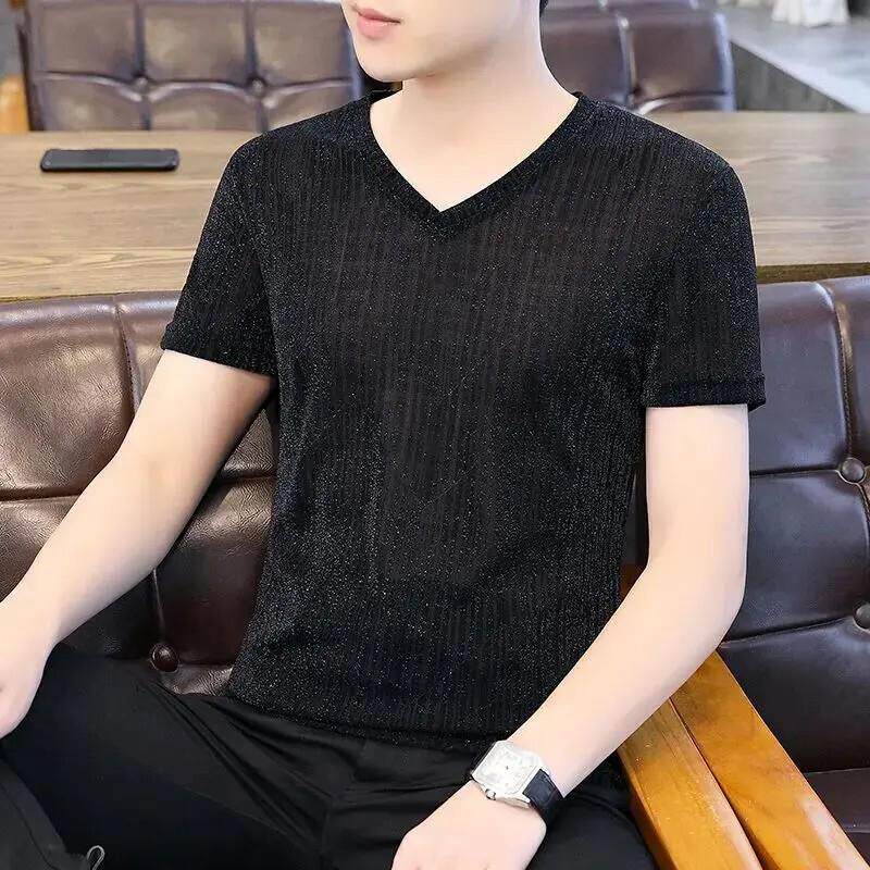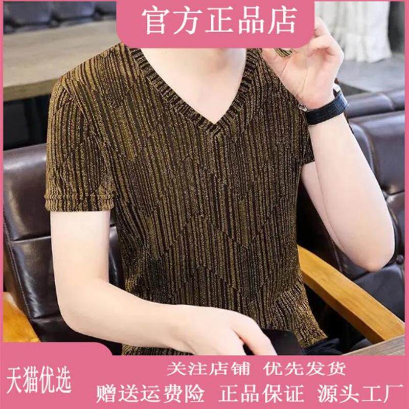 淘宝伯乐轻奢Amphelisia夏款短袖t恤男V领冰丝薄款韩修身网纱镂空亮丝