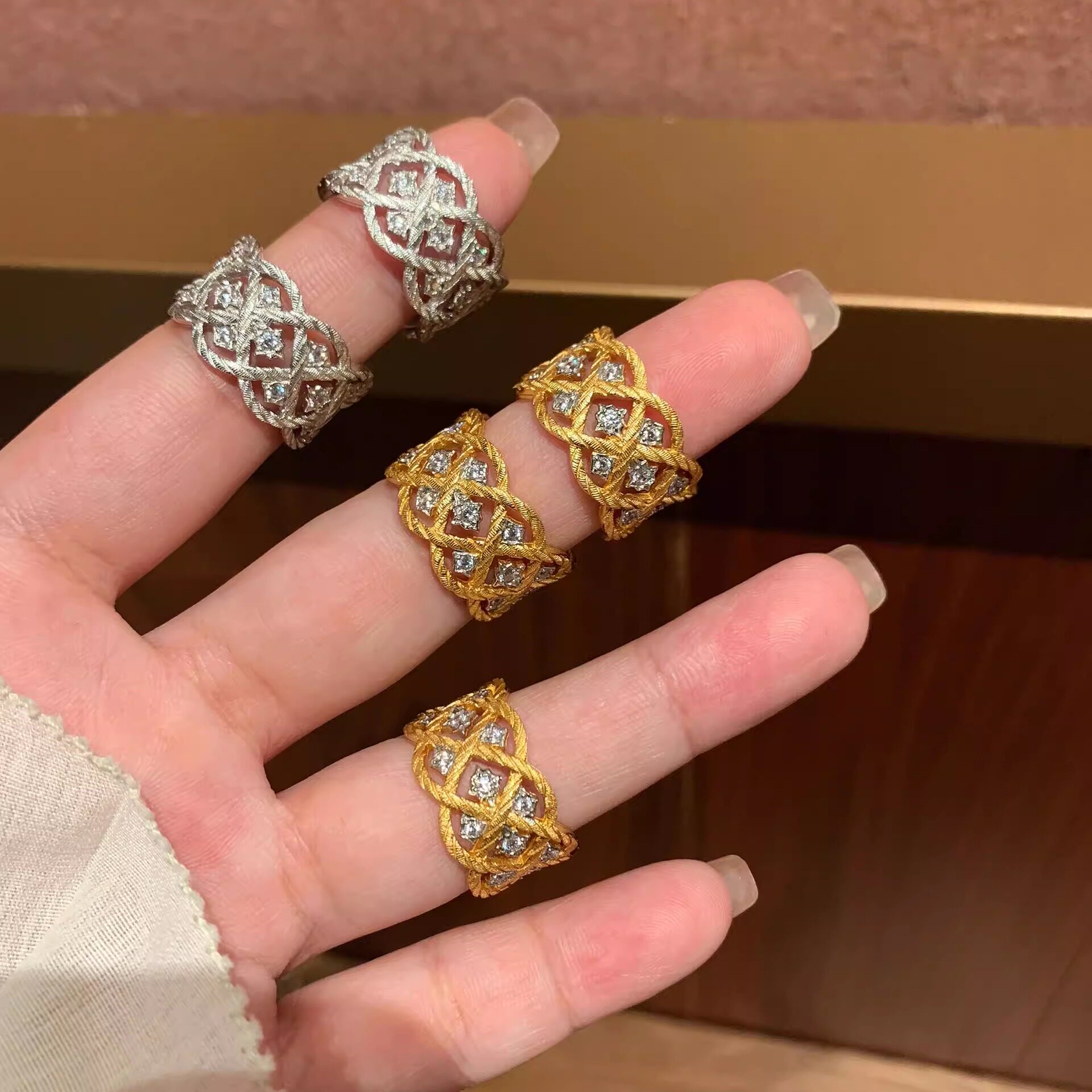 S925纯银!意式中古拉丝工艺菱格戒指轻奢小众高级珠宝感高碳钻