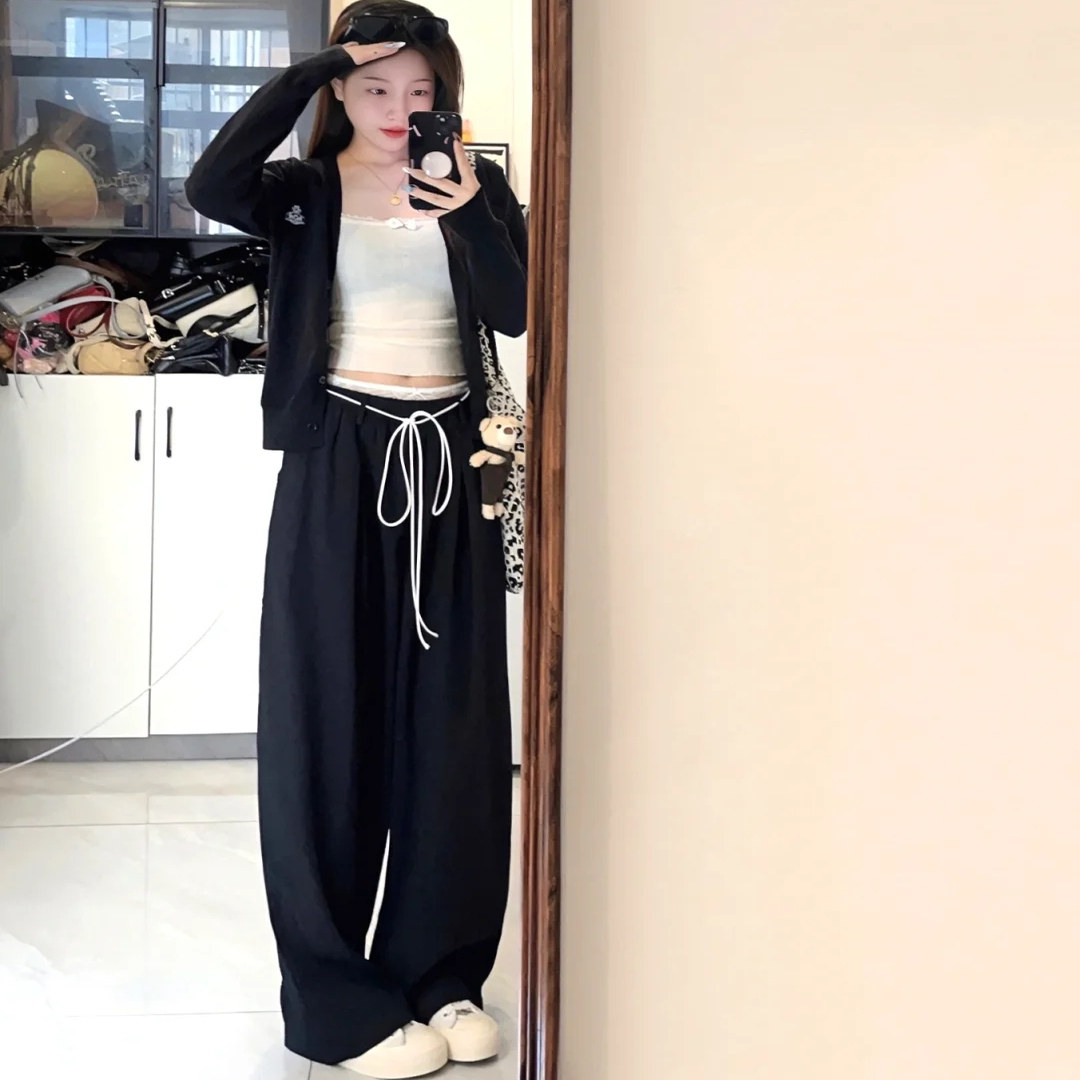 【Aaisup~】黑色绑带弯刀裤女早秋季宽松阔腿蕾丝拼接爵士舞长裤