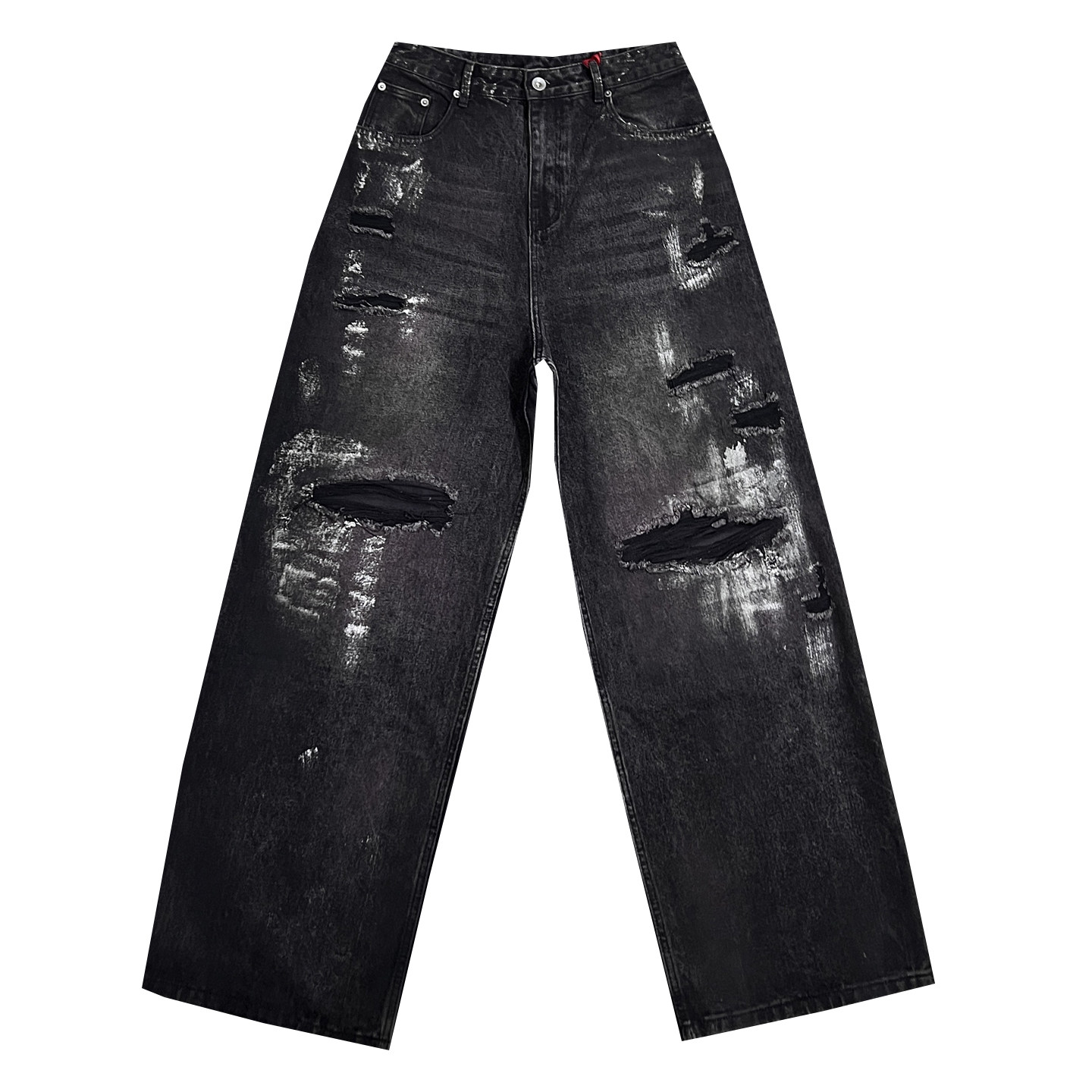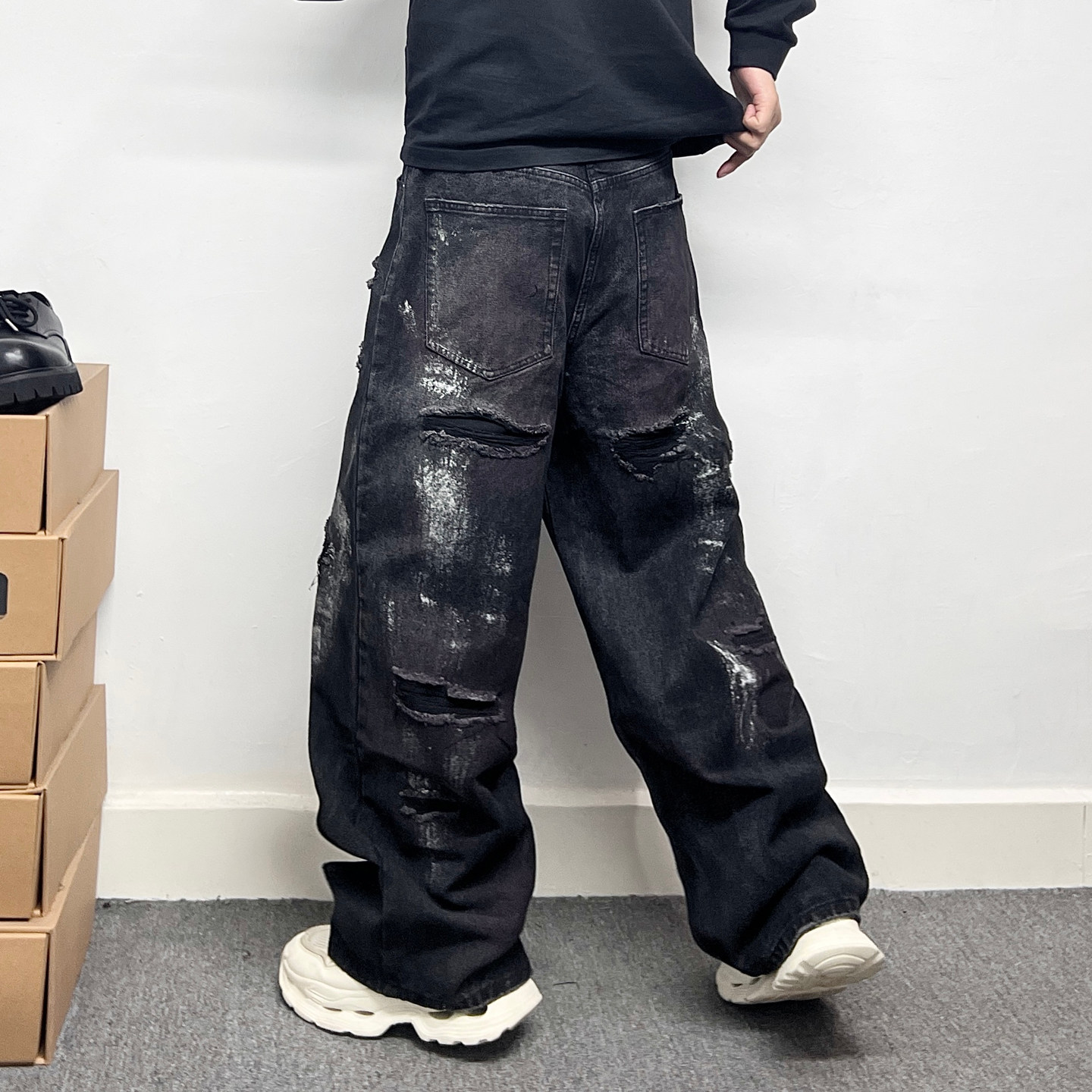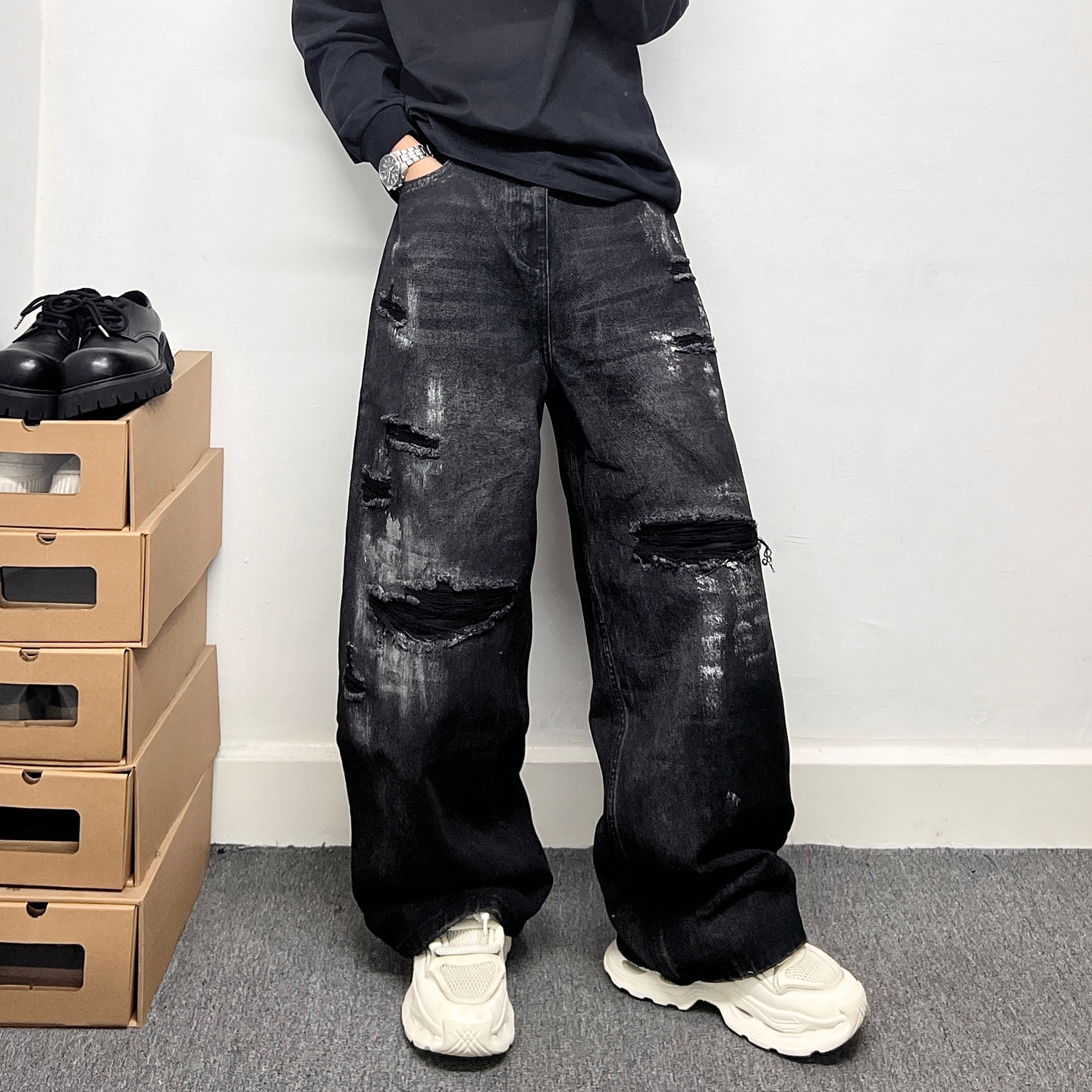 美式小众设计感款假破洞贴布泼漆黑色牛仔裤男街头vibe风阔腿长裤