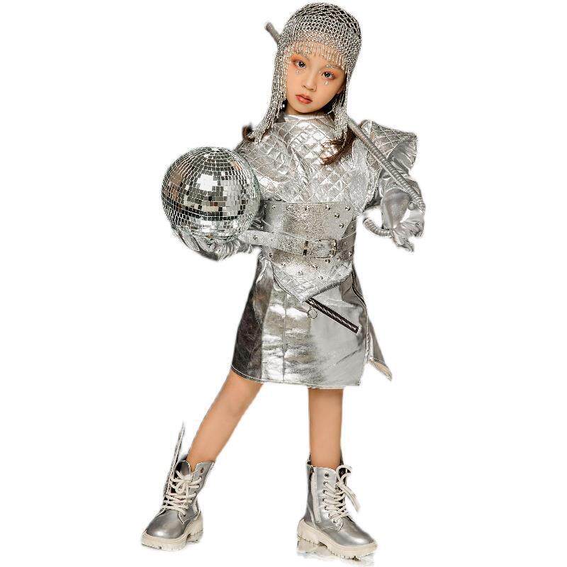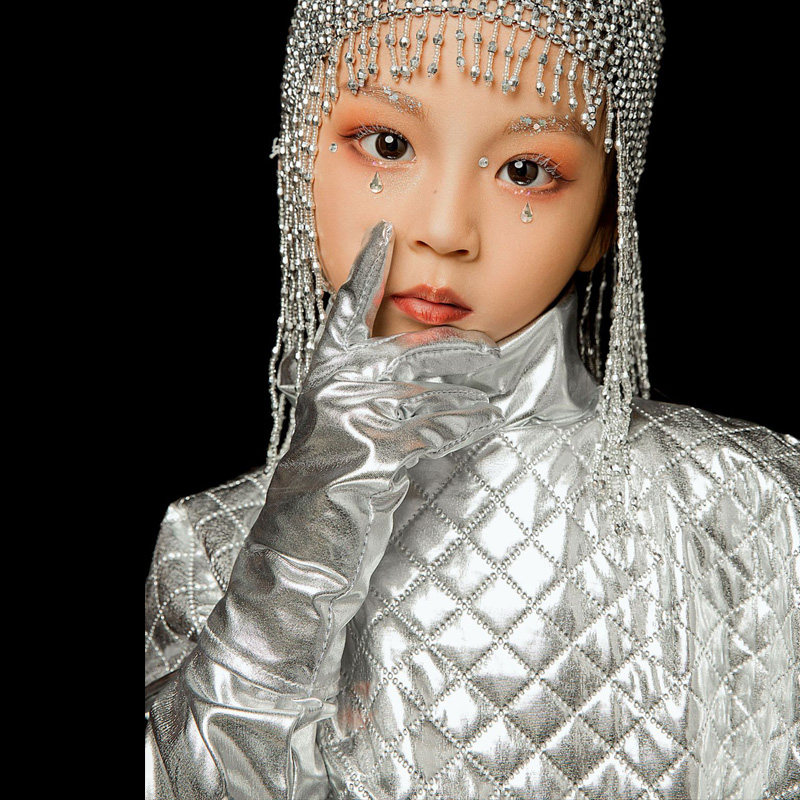 银色儿童走秀潮服未来科技风模卡演出服元宇宙创意主题舞台服装