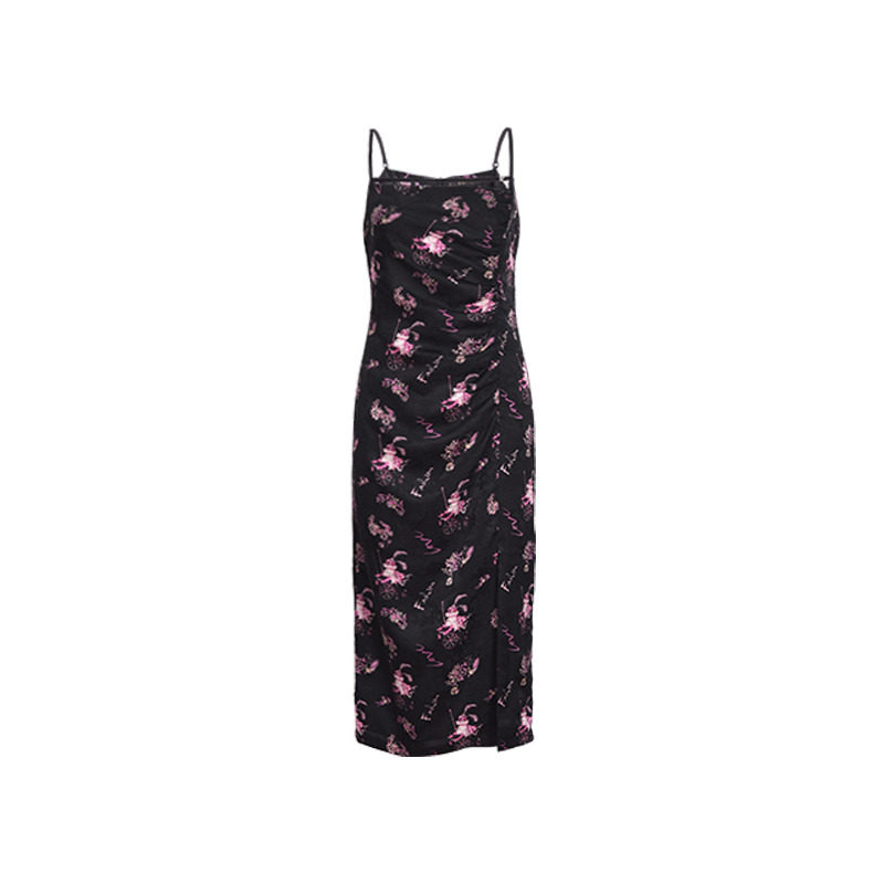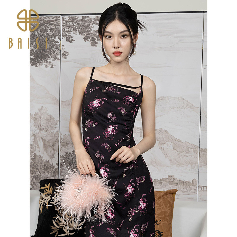 2025秋季新品百丝长裙国潮图案无袖吊带收腰复古显瘦开叉连衣裙女