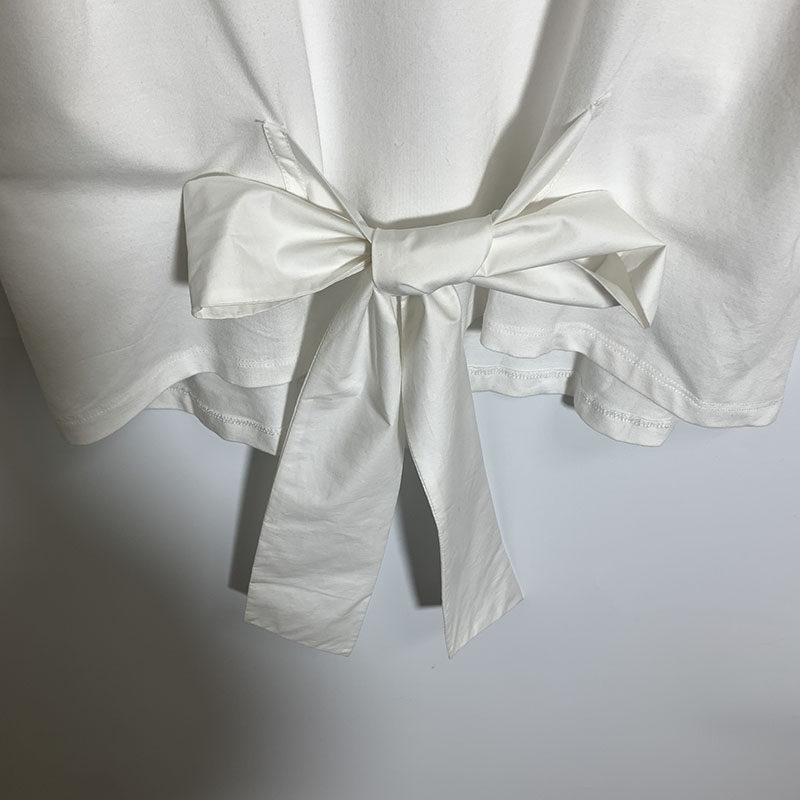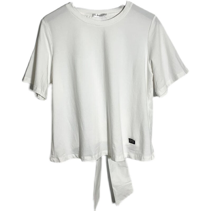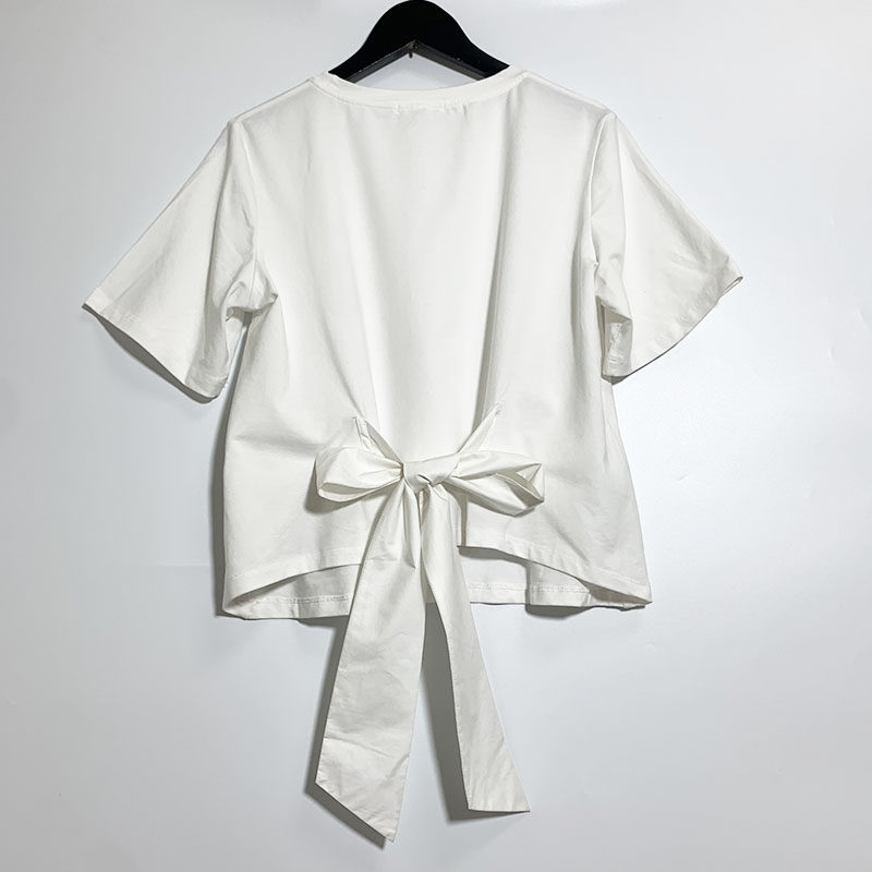 圣迪家女士圆领飘带蝴蝶结装饰短袖T恤0131