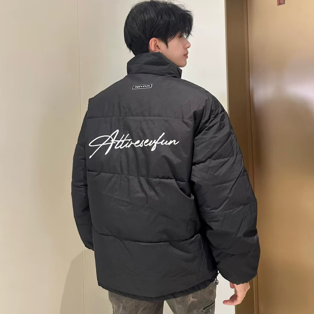 淘宝美式复古高街潮流花体字印花宽松休闲通勤防风立领百搭面包棉服