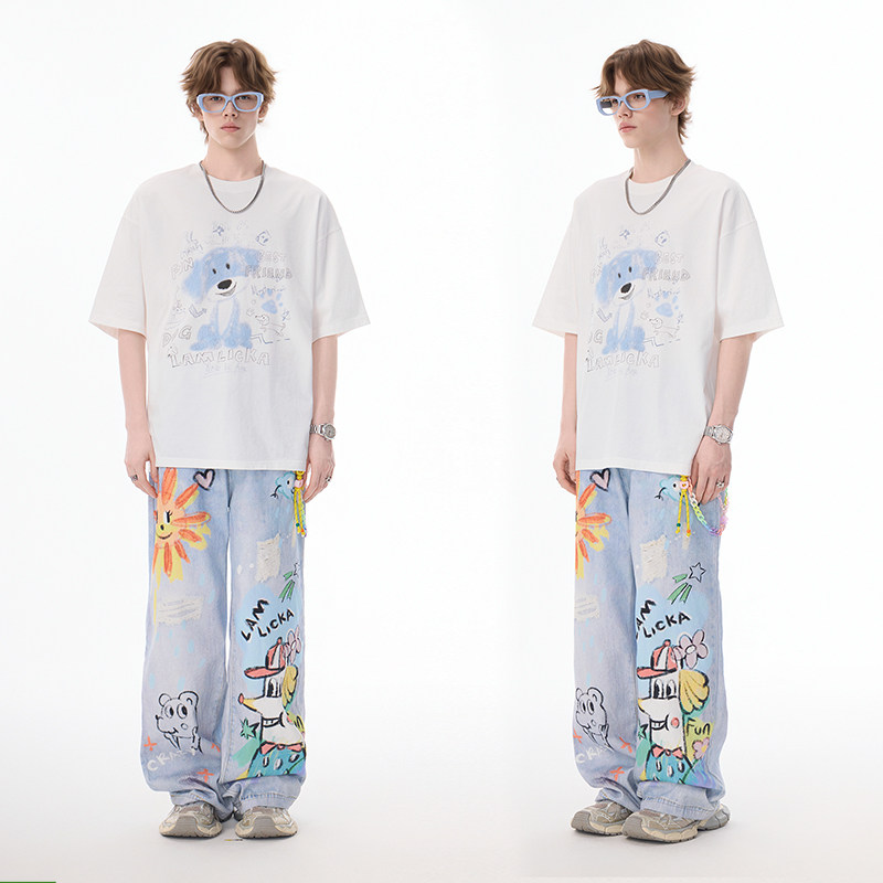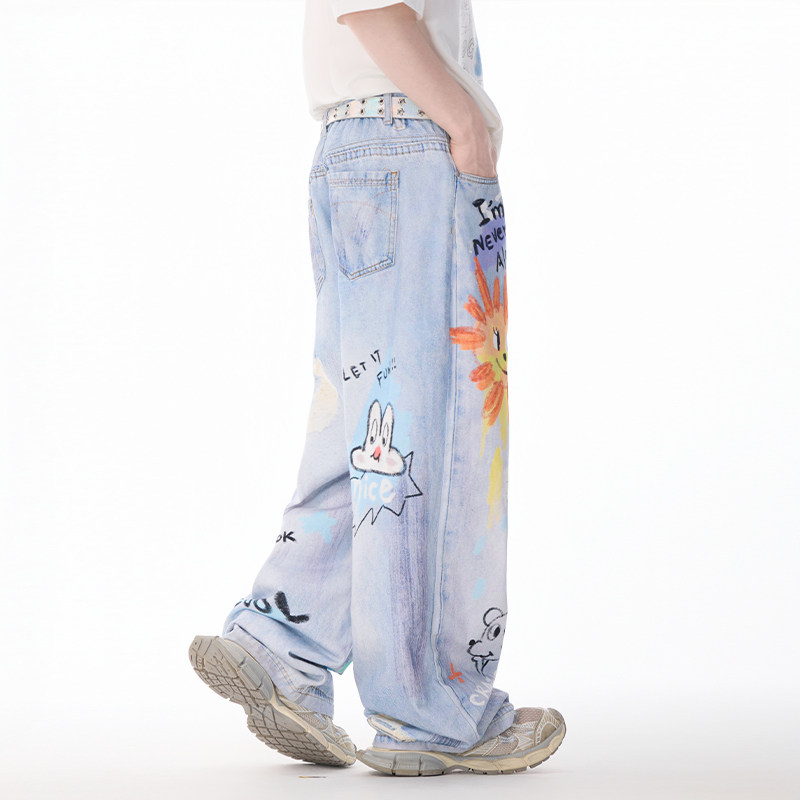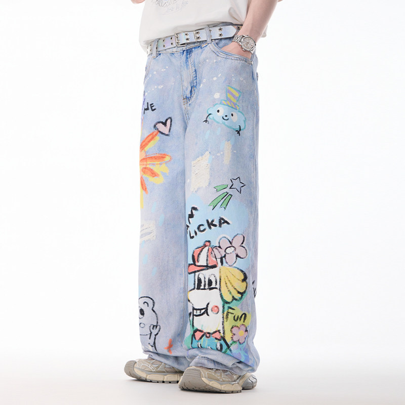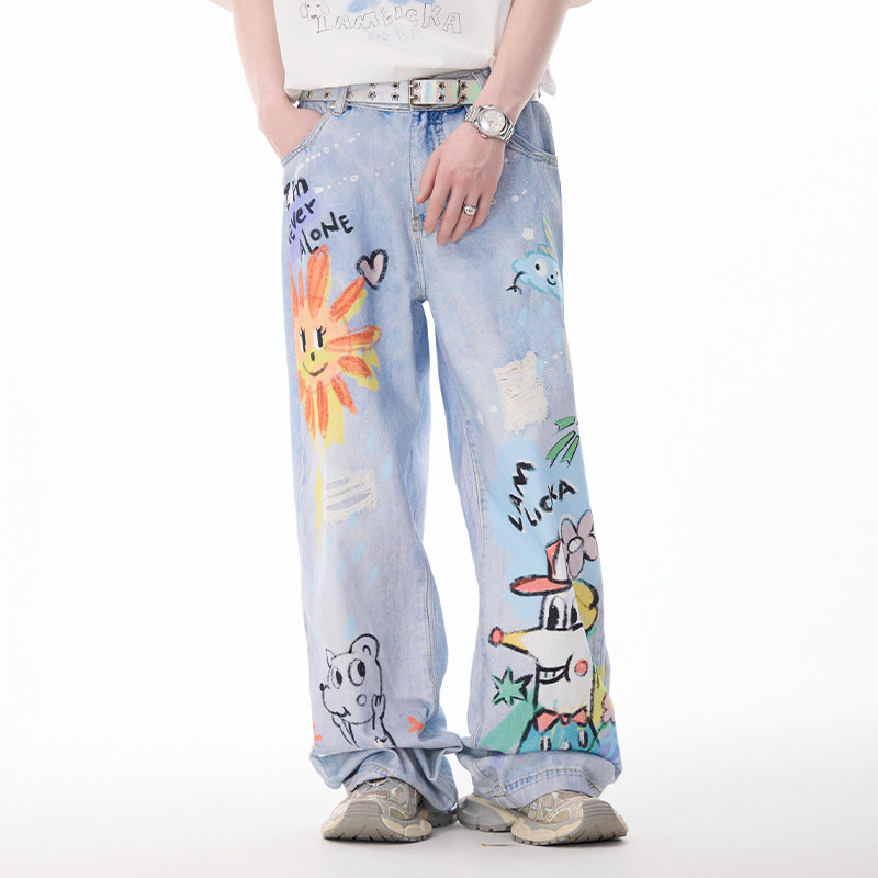 LAMLICKA蓝色涂鸦水洗直筒仿牛仔裤春秋美式复古宽松阔腿休闲长裤