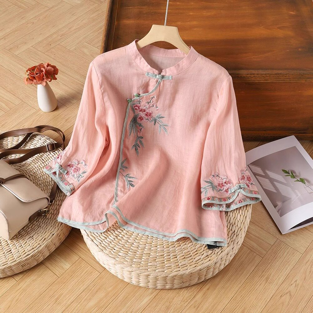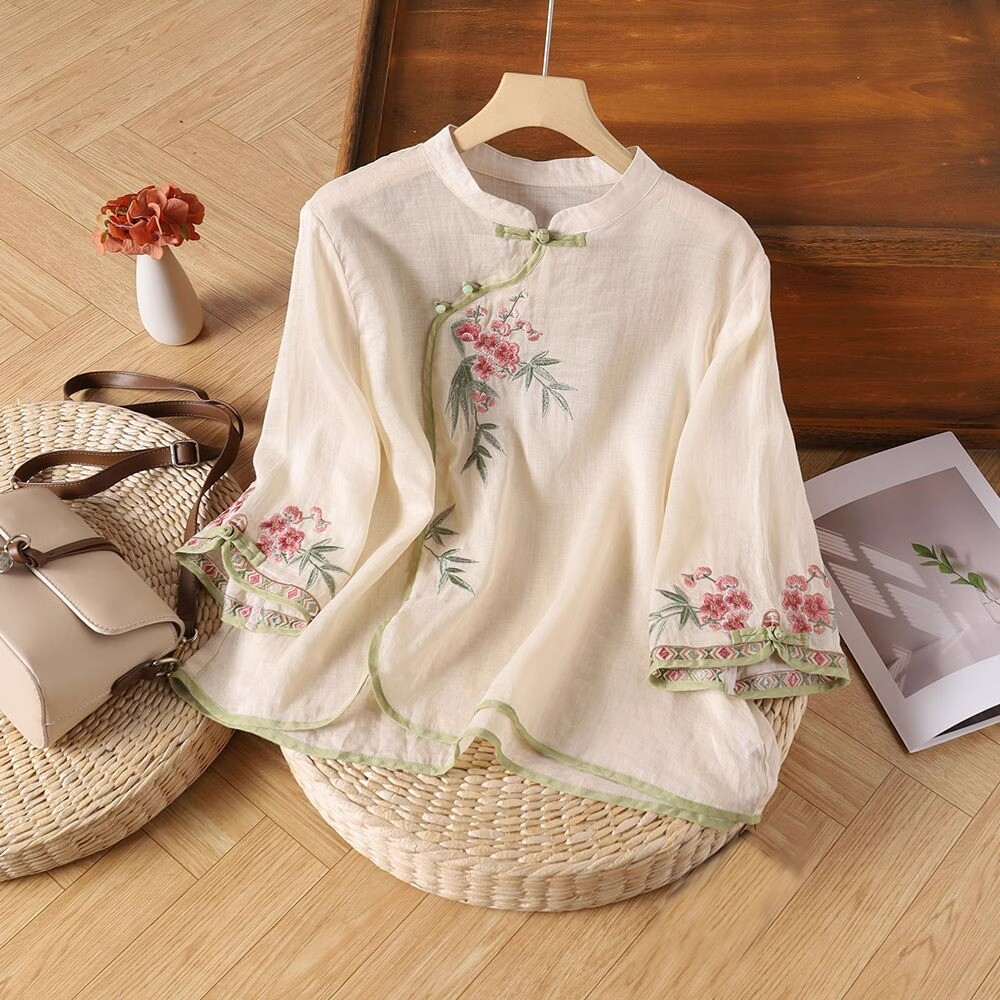 中老年新款复古盘扣宽松立领斜襟民族风绣花妈妈款七分袖衬衫上衣