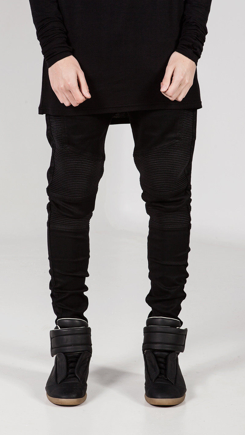 欧美街头演出机车男皱褶拼接修身小脚微弹大码牛仔裤韩版男长靴裤
