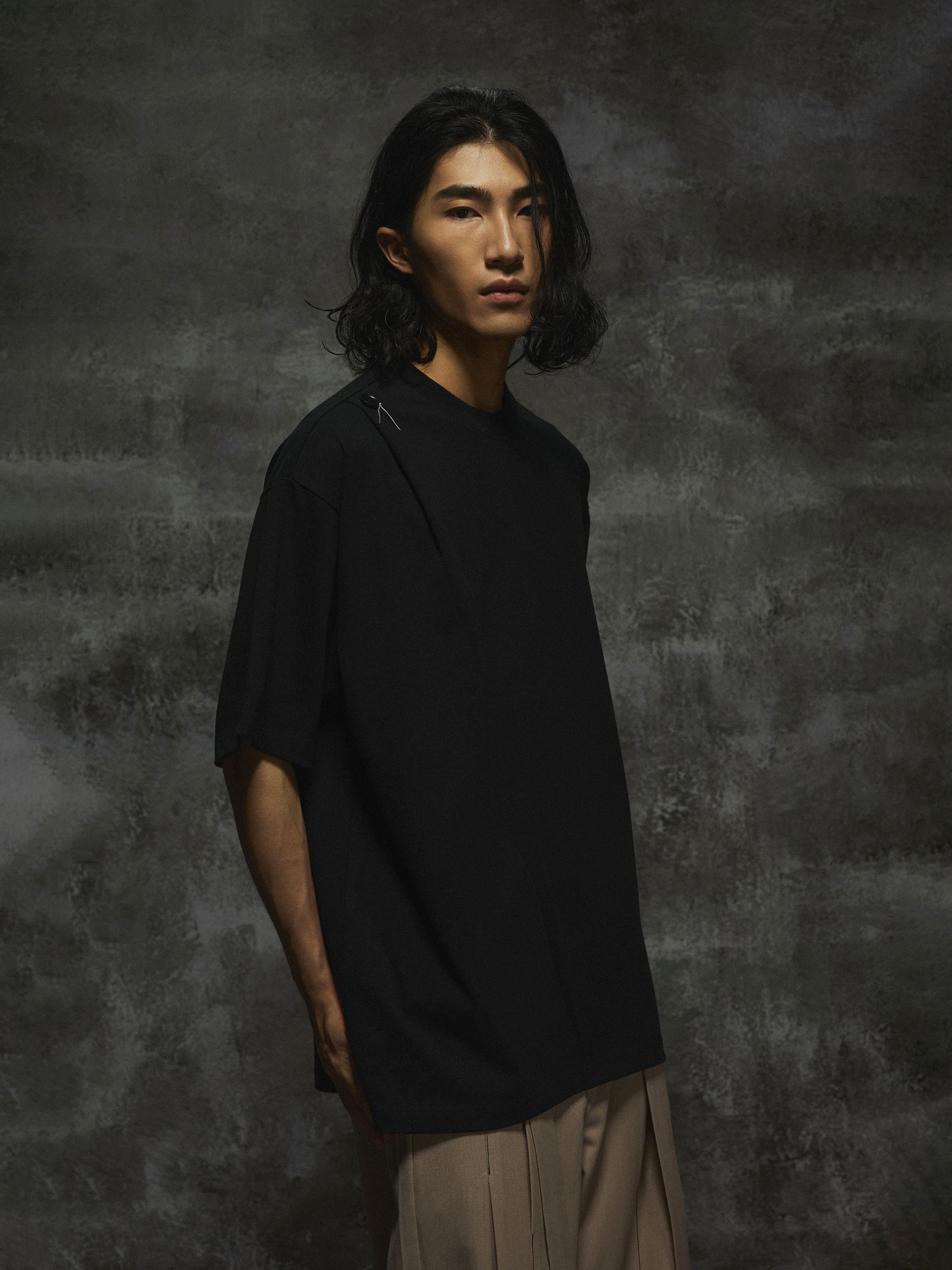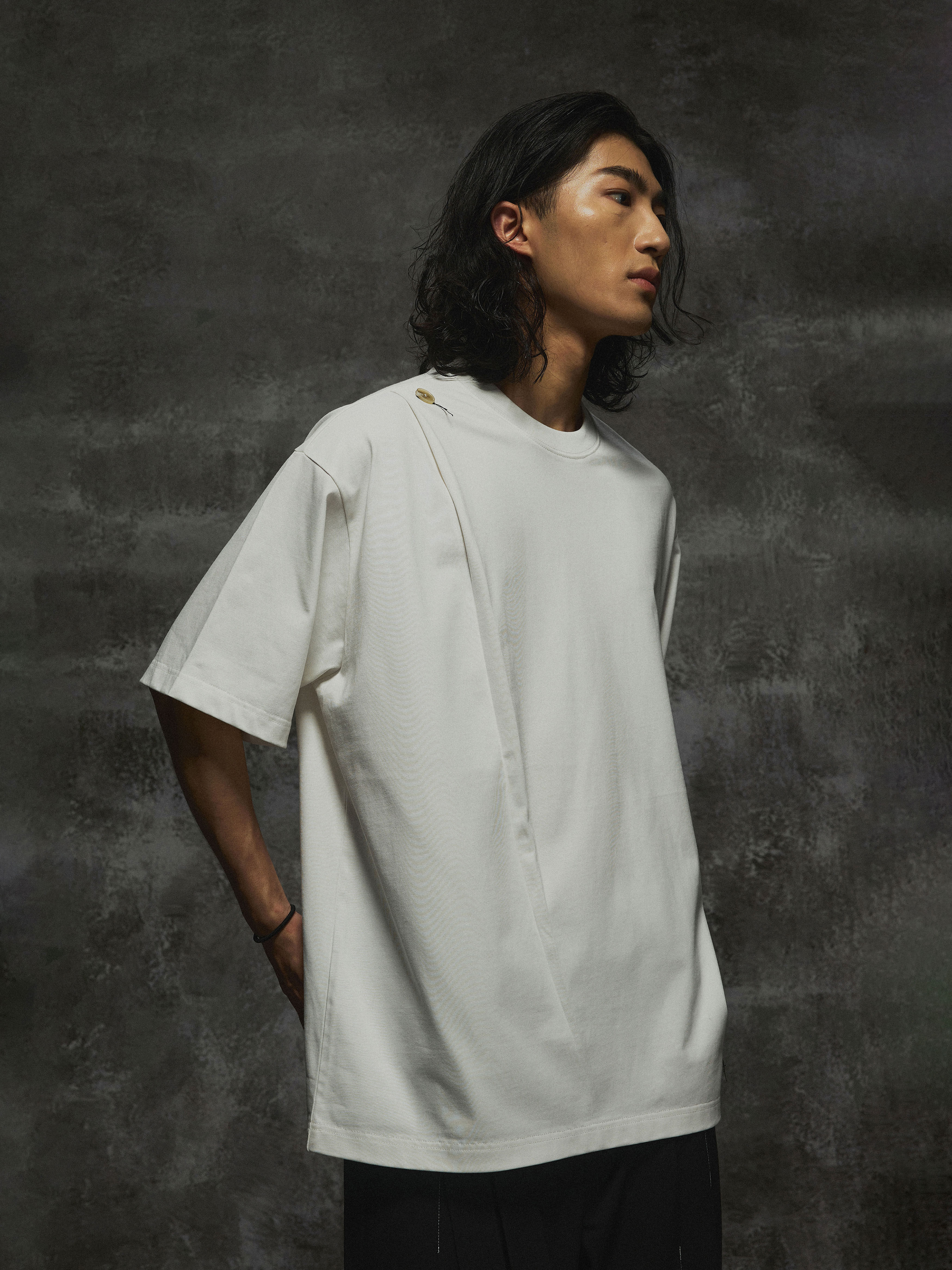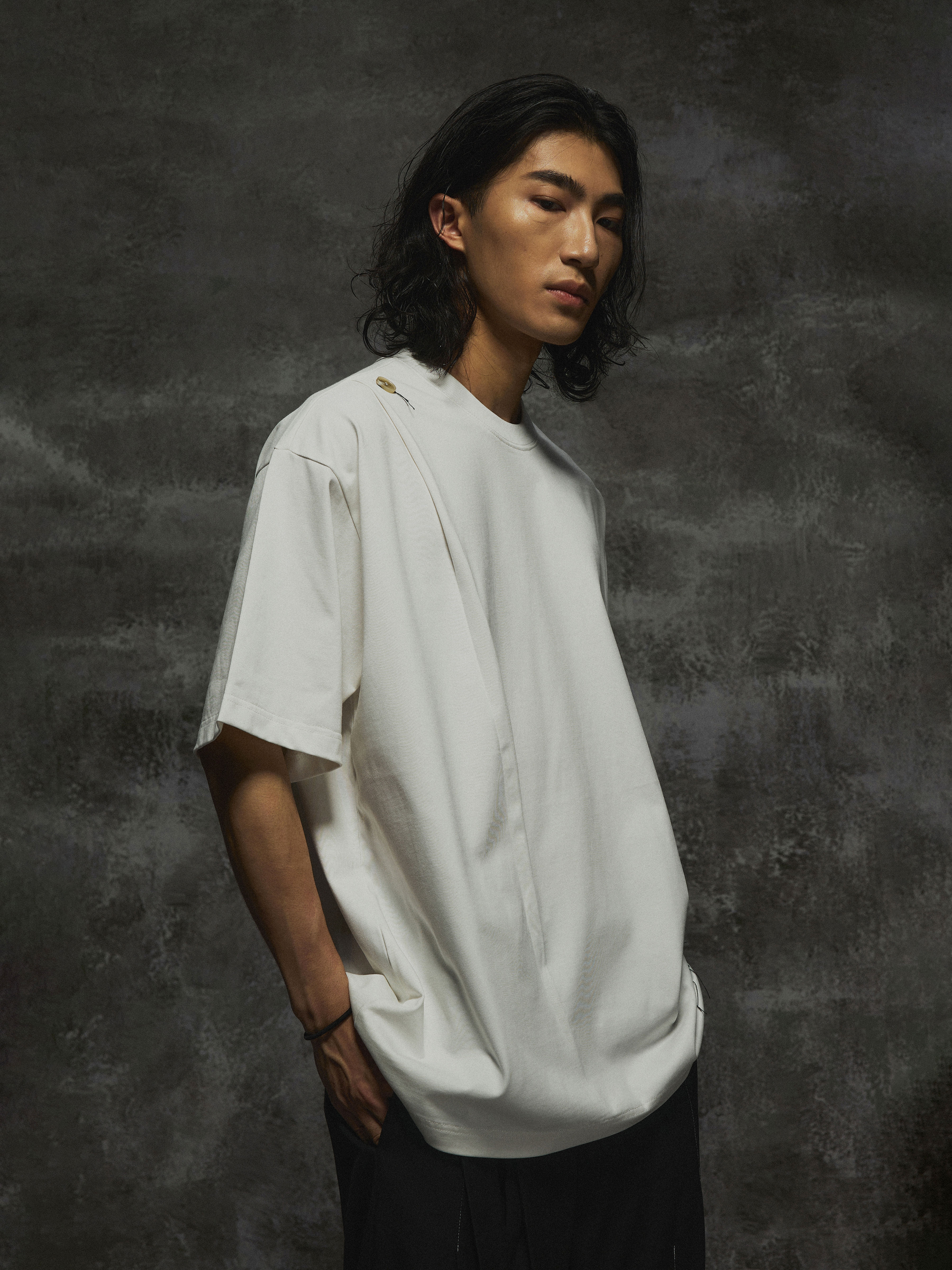 THOS 24SS立体夏季纯棉捏褶凤眼飘尾设计感小众纽扣短袖男短袖T恤