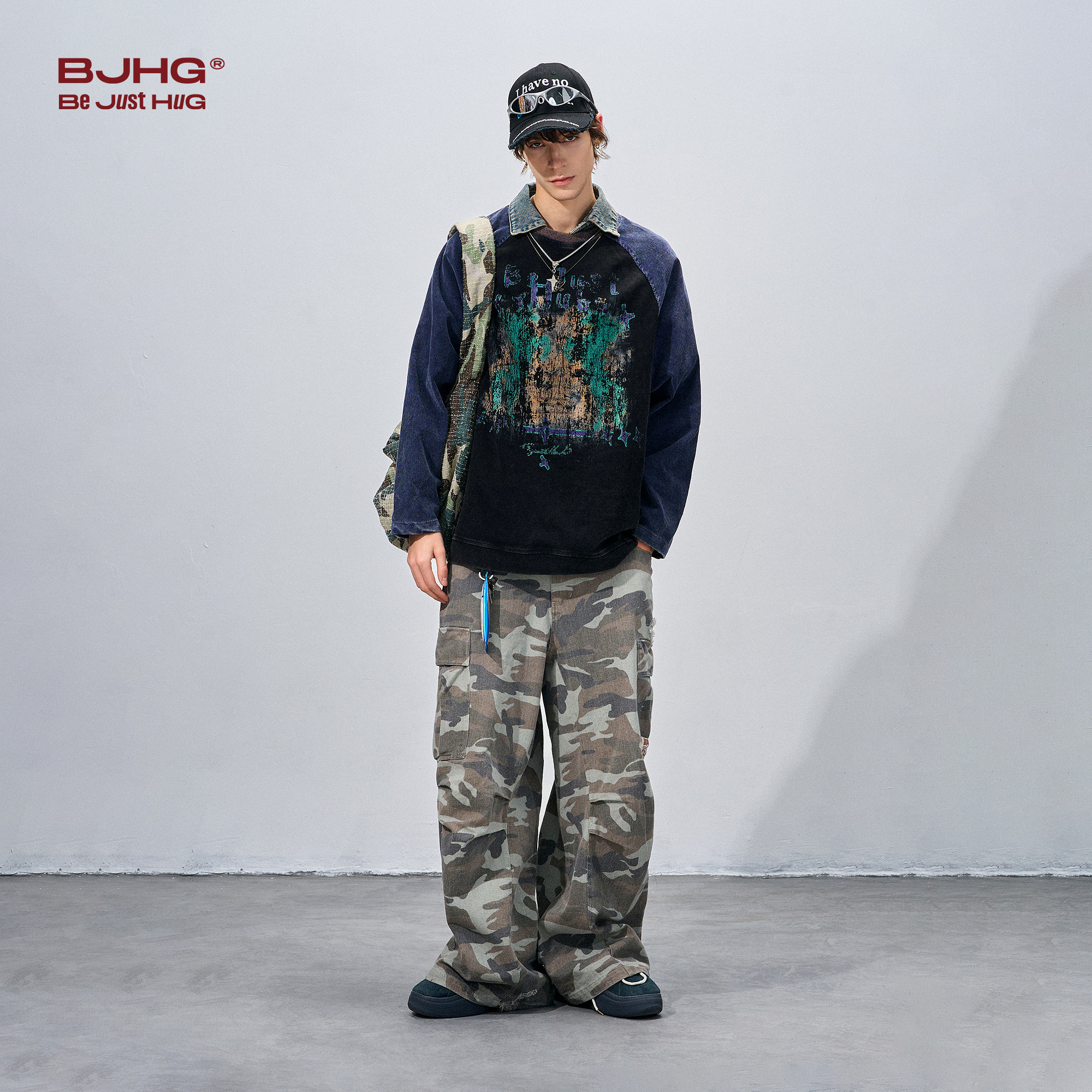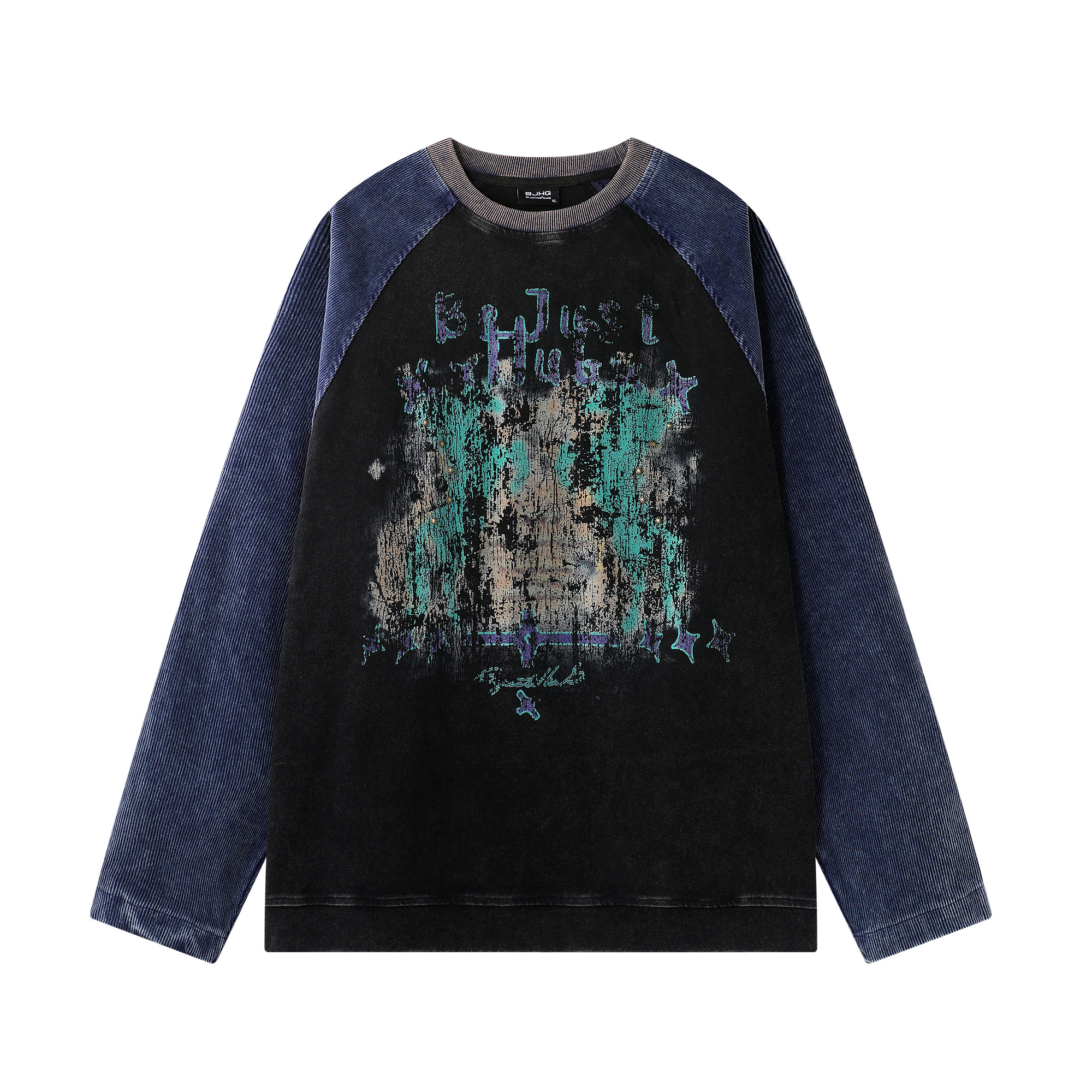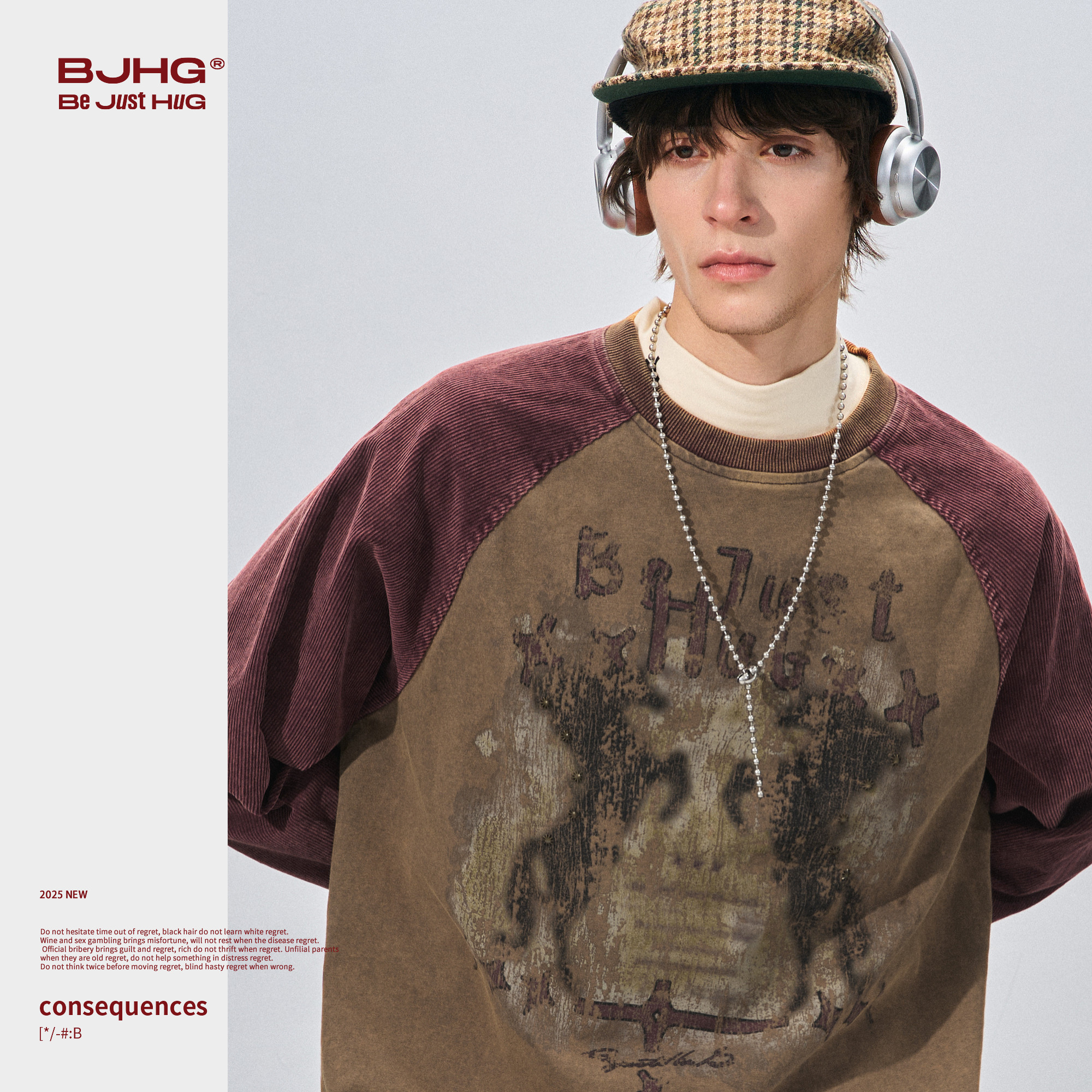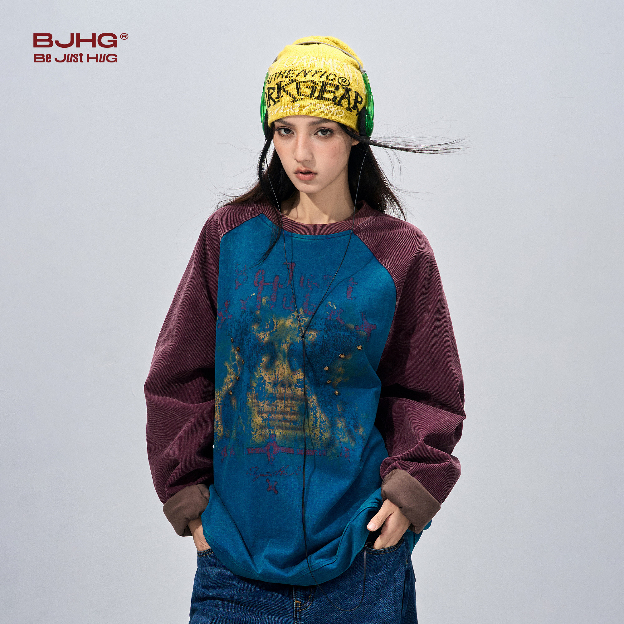BJHG不计后果 美式复古斑驳印花长袖T恤男款早春撞色插肩袖卫衣女