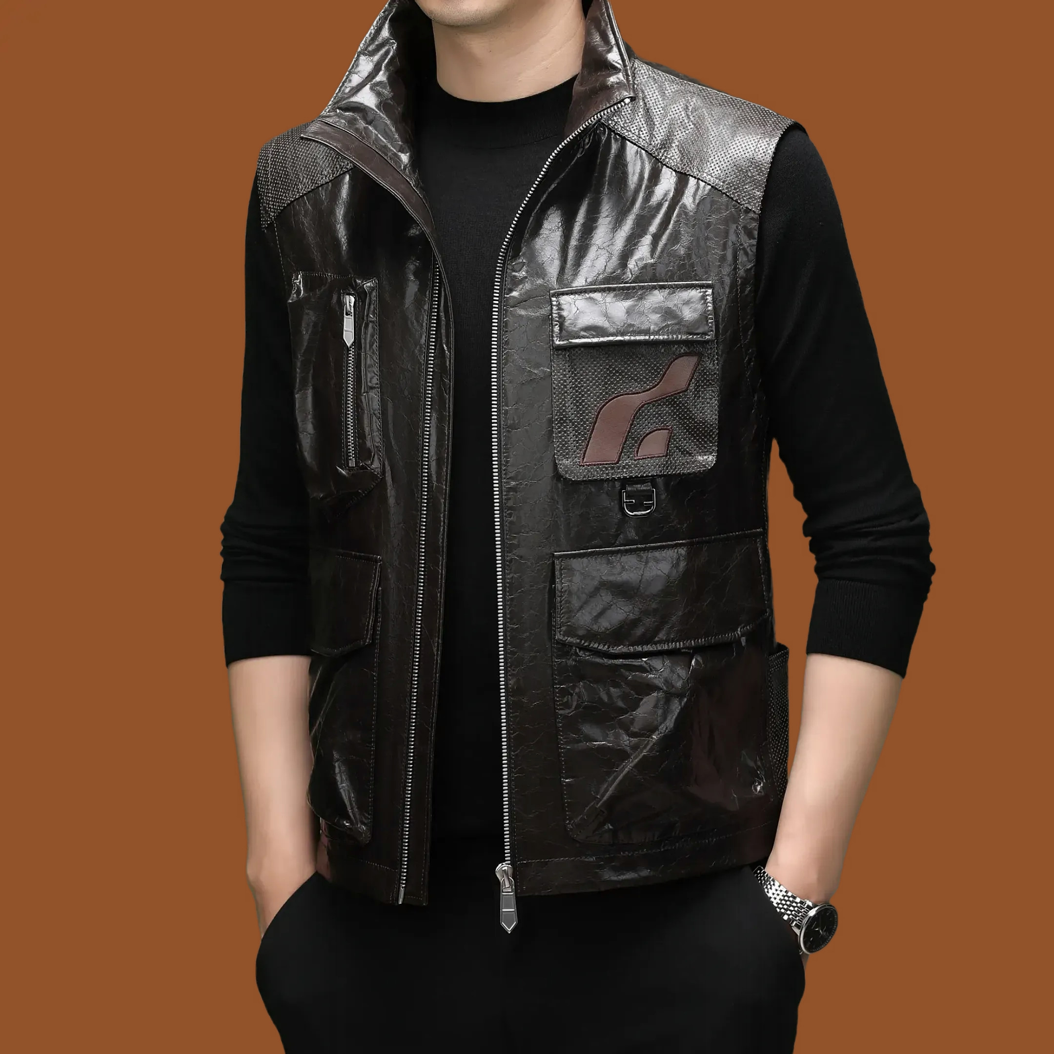 狄斯仑真皮马甲男立领头层牛皮商务休闲拉链背心时尚潮流百搭外套