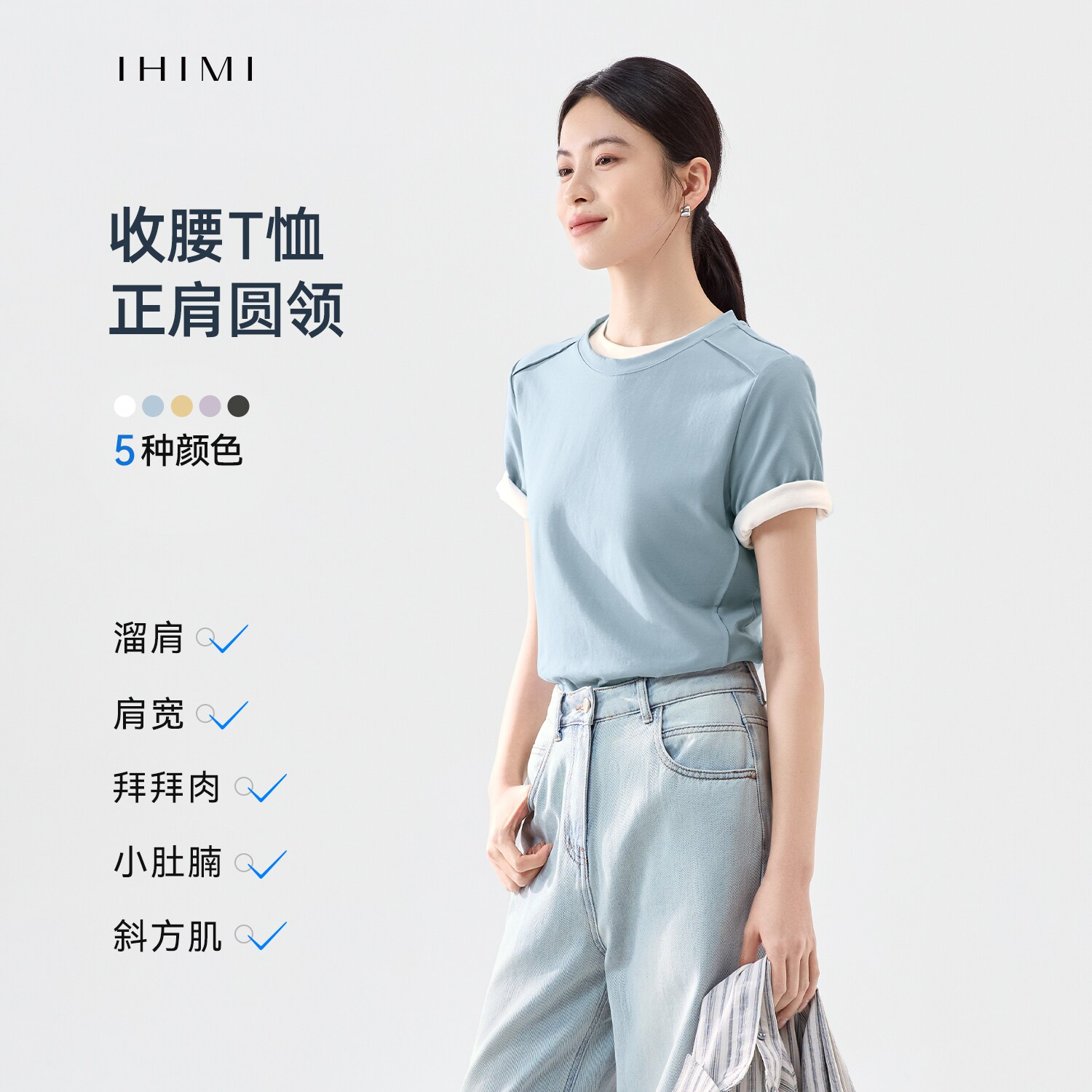 IHIMI海谧简约圆领纯色棉T恤女2026夏季新款修身短袖显瘦百搭上衣