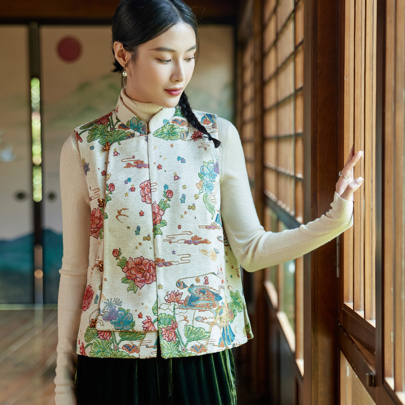 --------------------- 新中式国潮复古改良提花面料斜襟百搭圆领中式宽松铜扣马夹女上衣 【原售价】368元 【现售价】323元 【推荐理由】