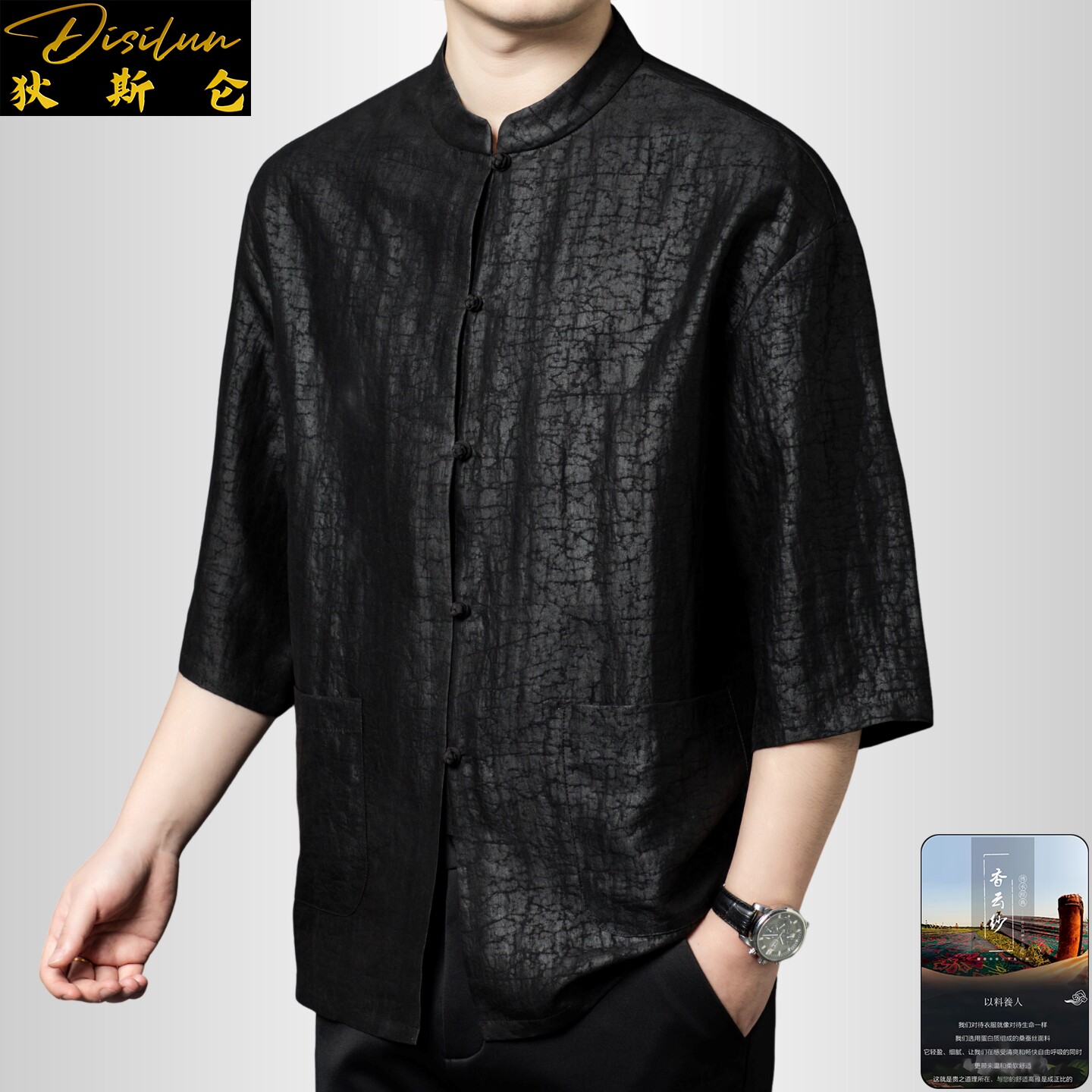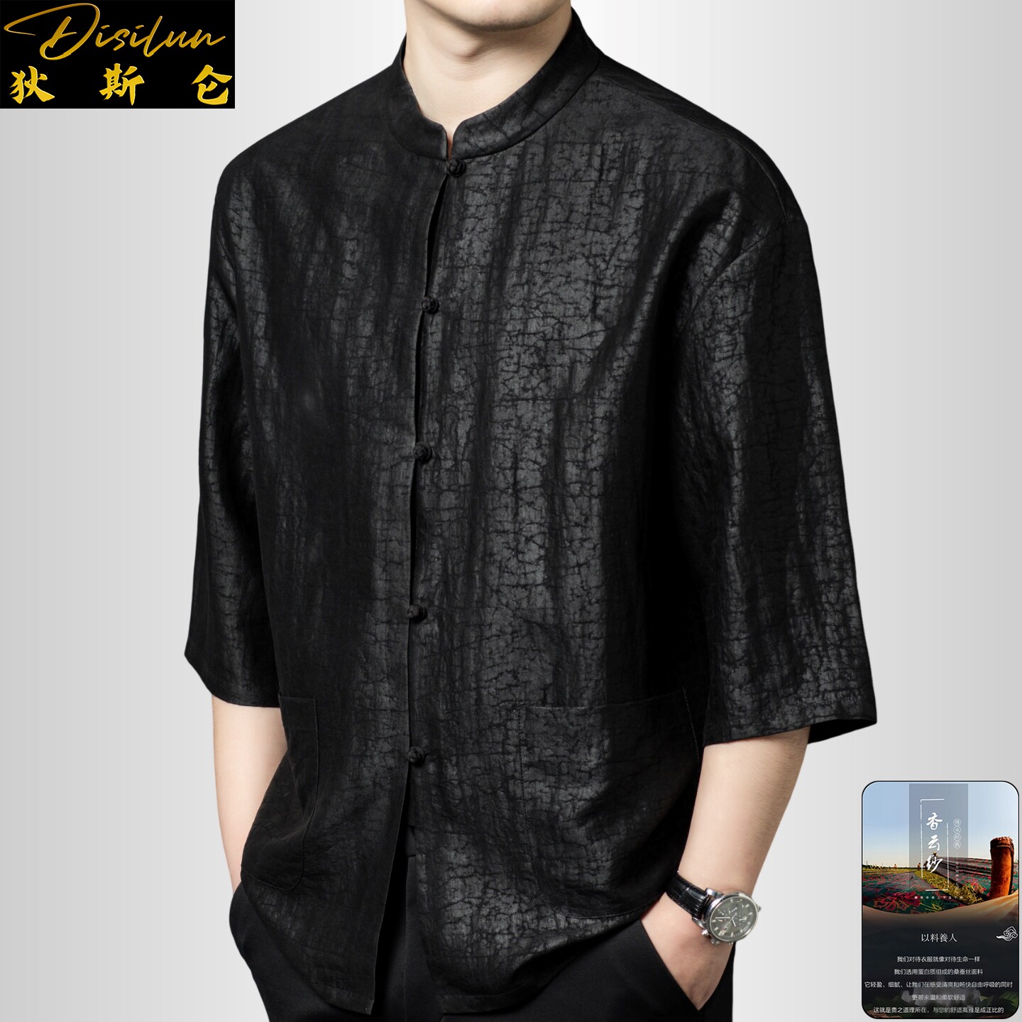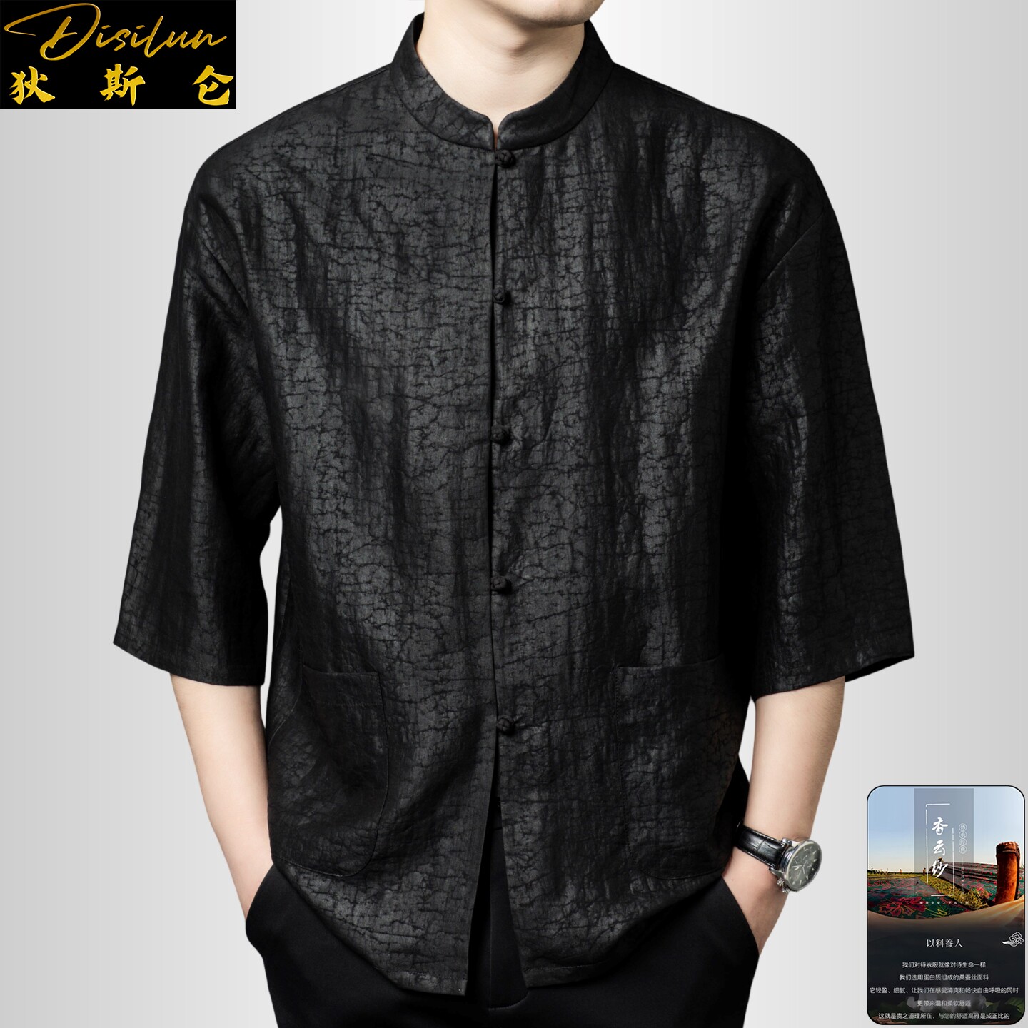 --------------------- 狄斯仑高端香云纱龟裂纹立领半袖唐装男士纯桑蚕丝新中式纯色上衣 【原售价】1590元 【现售价】1431元 【推荐理由】
