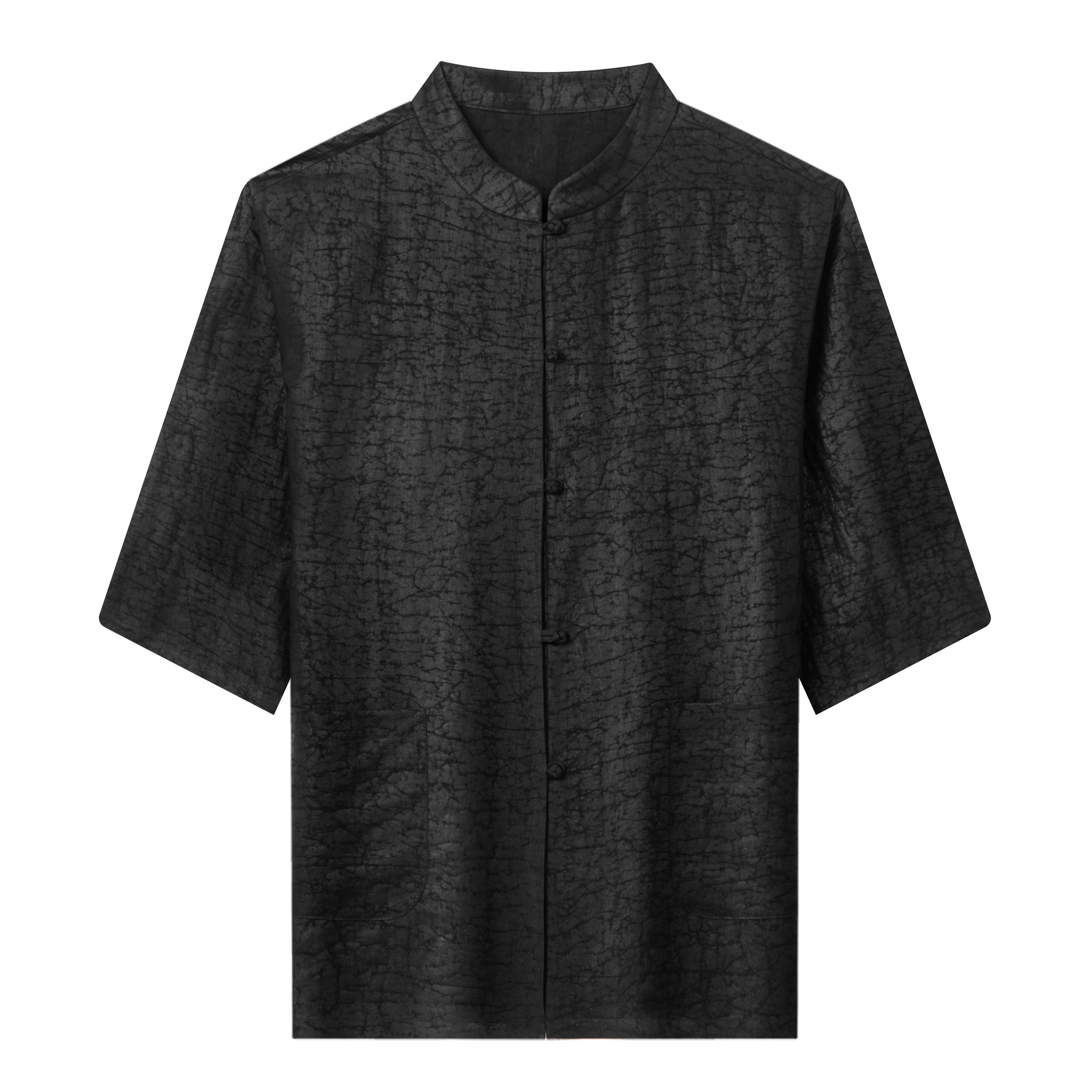 狄斯仑高端香云纱龟裂纹立领半袖唐装男士纯桑蚕丝新中式纯色上衣