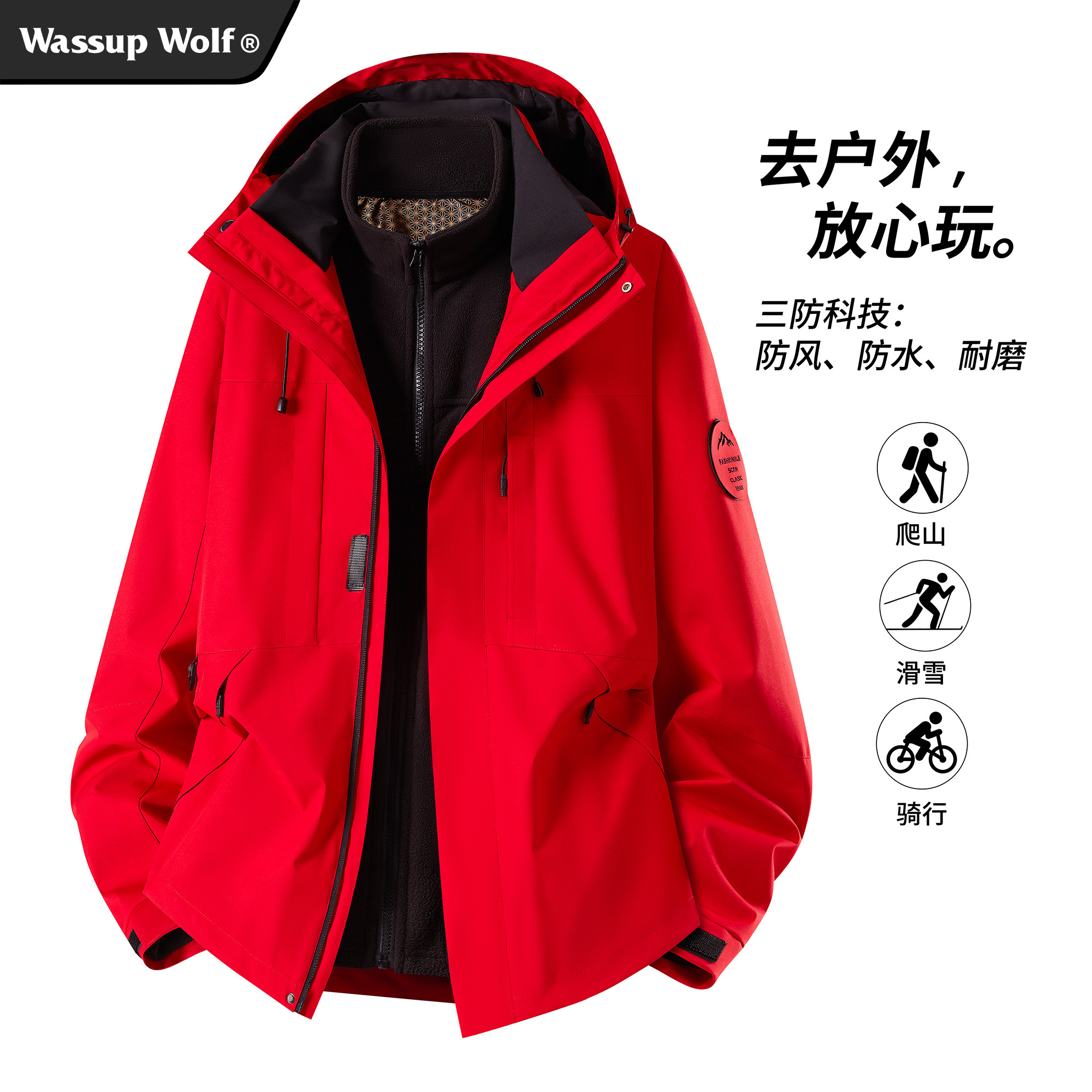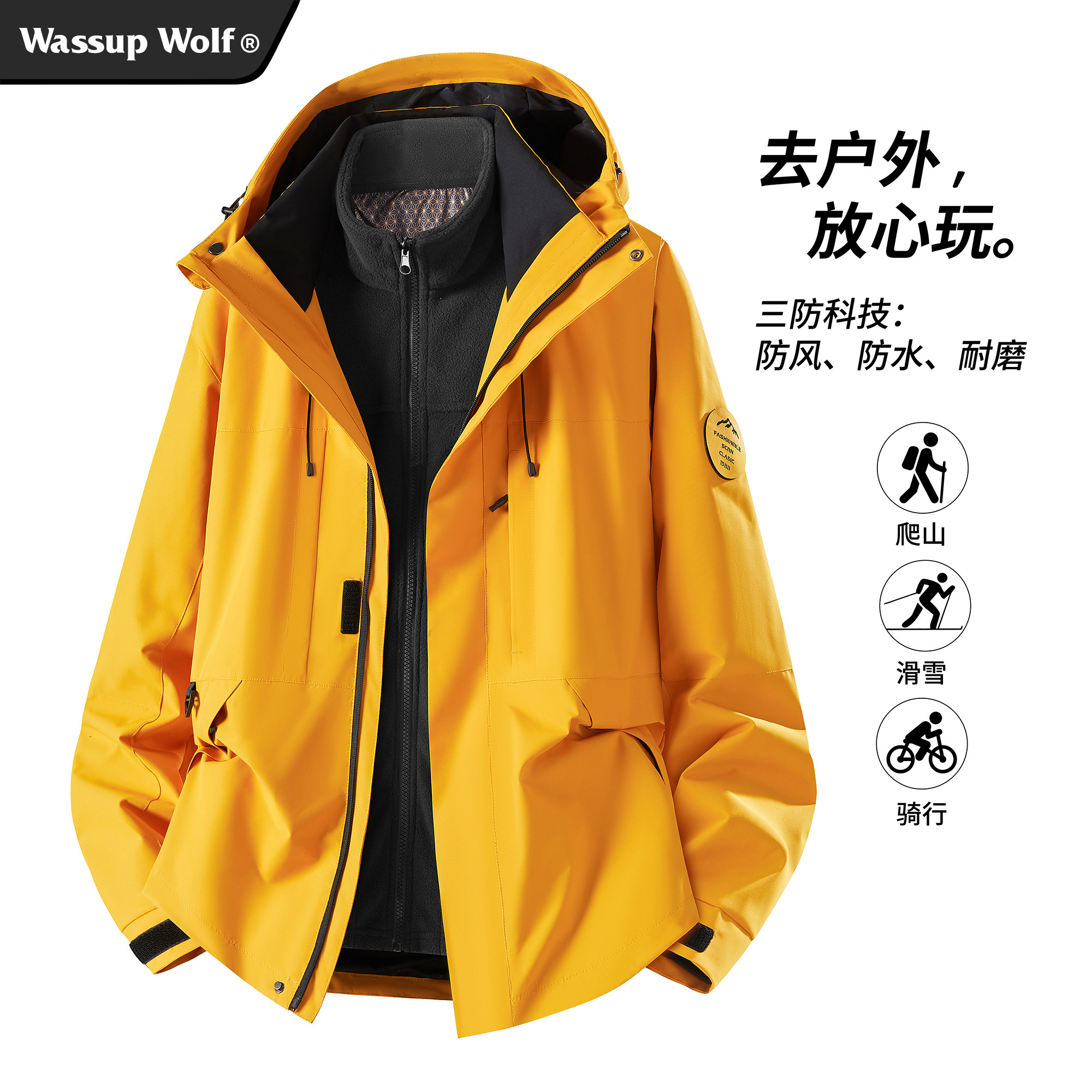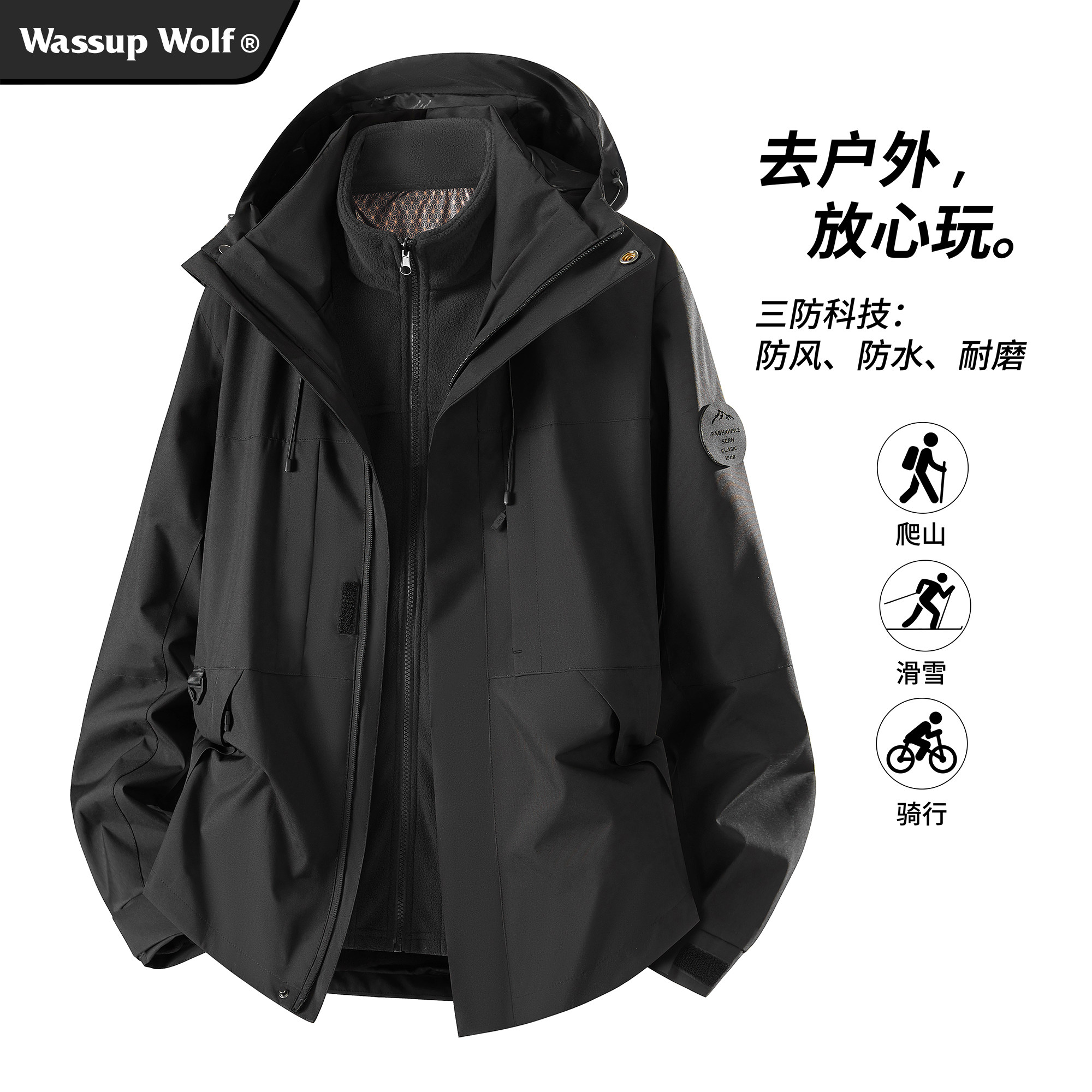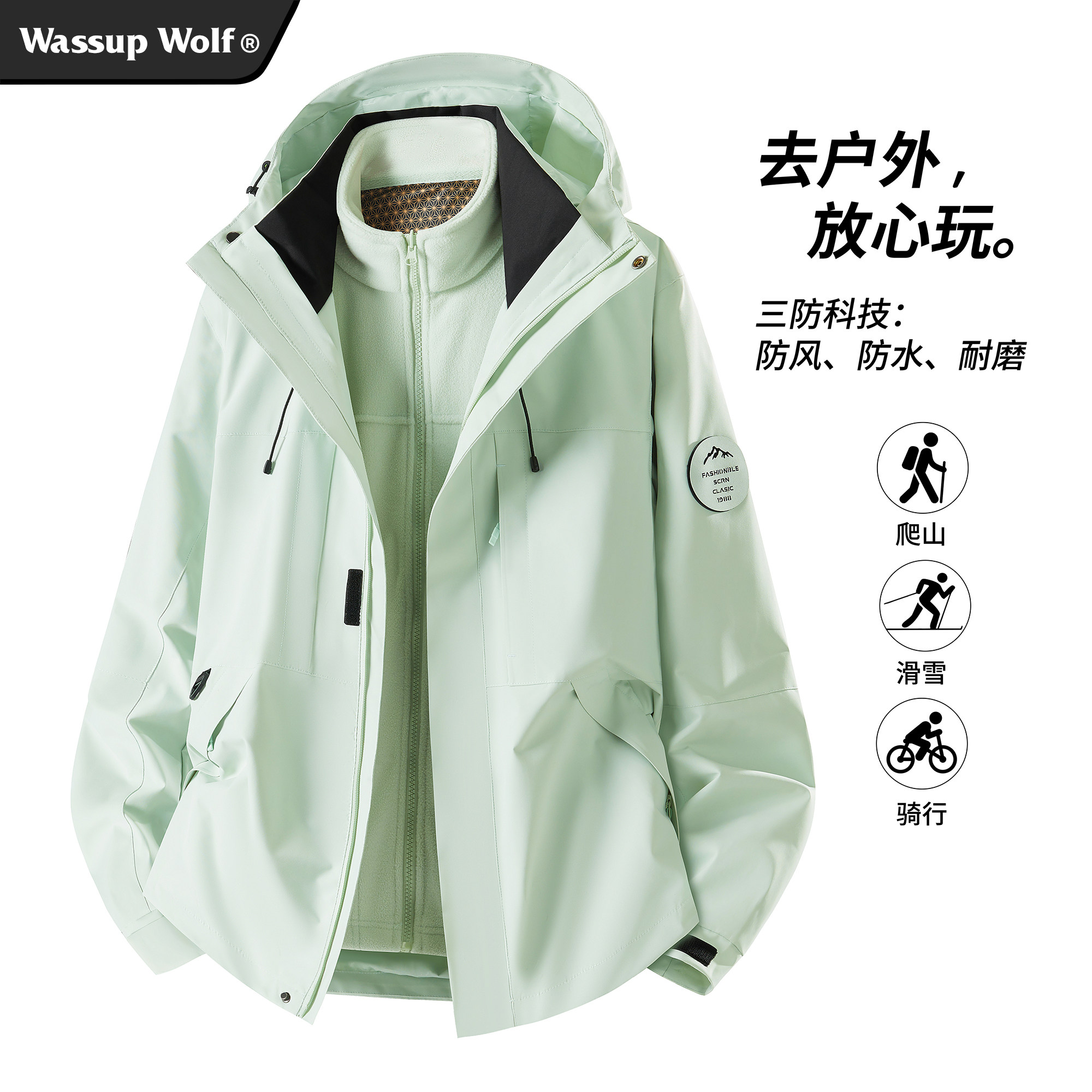 Wassup Wolf三合一冲锋夹克男女2025新款户外连帽外套软壳登山服