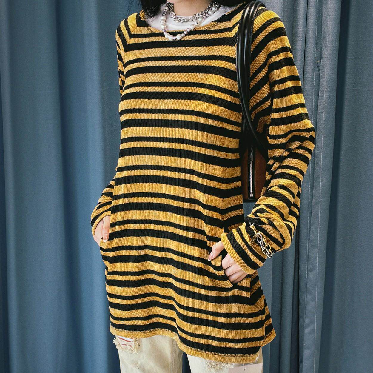 清货折5折 LOST GENERAL 黄黑条纹长袖T恤洞装饰浅灰色牛仔裤