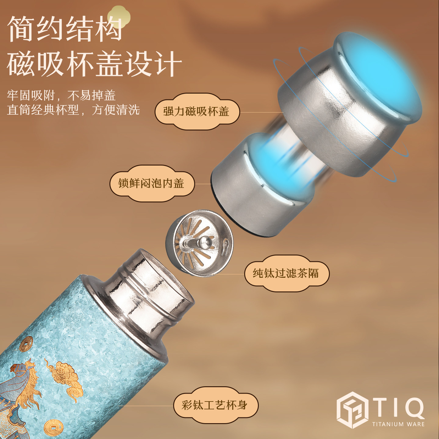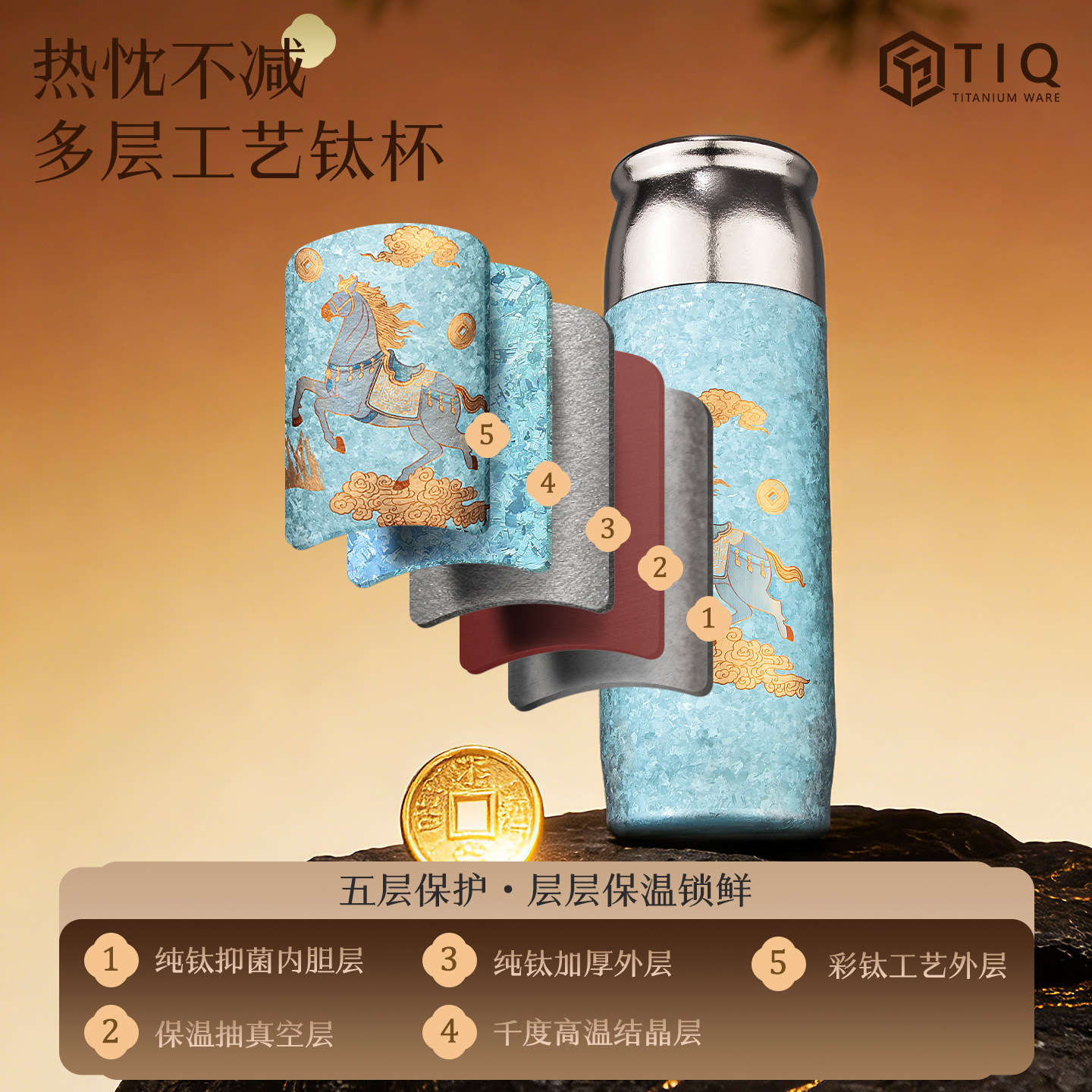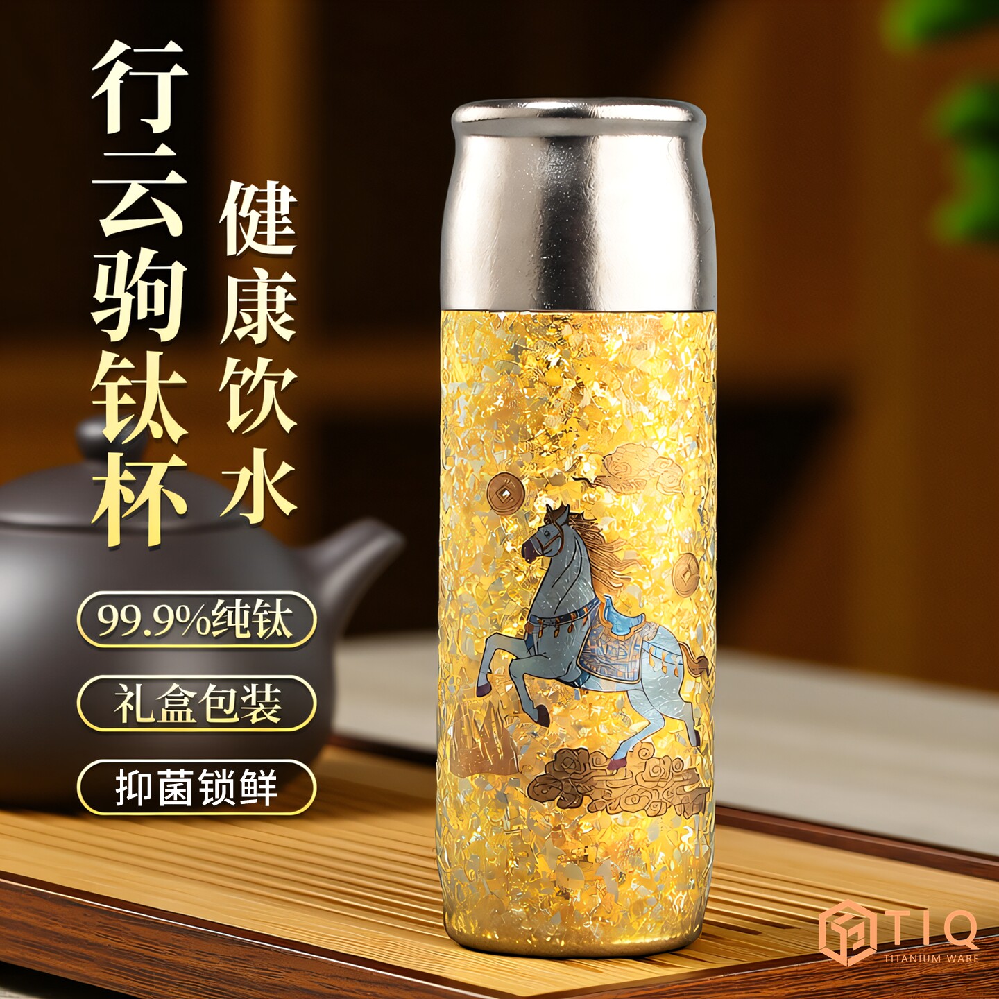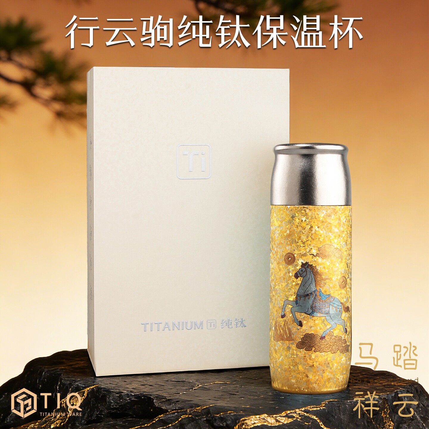 裕隆全纯钛行云驹保温杯国潮彩钛水杯抑菌茶水分离商务礼品杯送礼