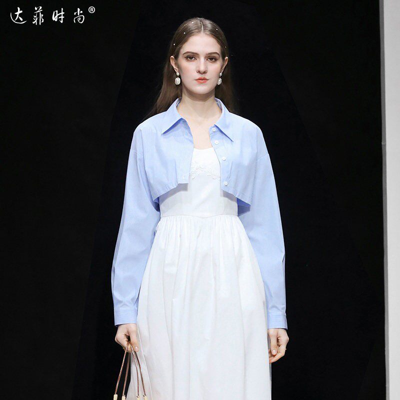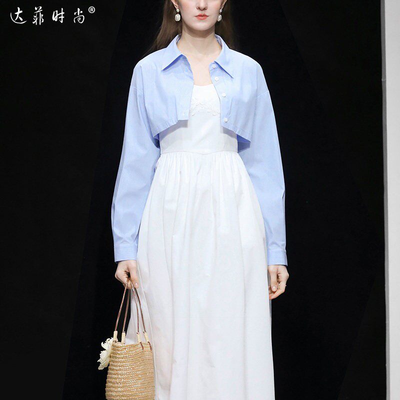 2026春季新款时尚百搭条纹衬衫+法式优雅吊带连衣裙清纯长裙套装
