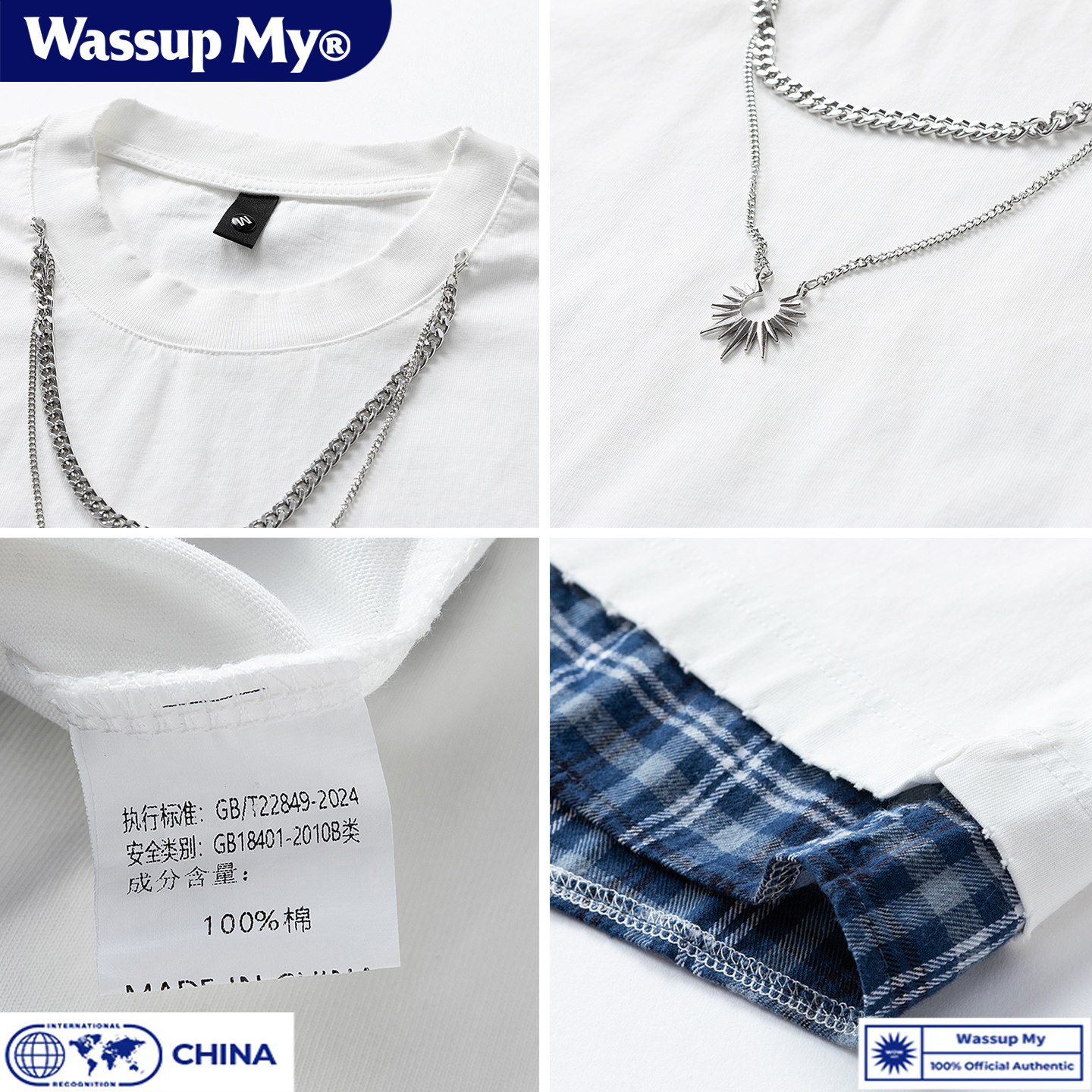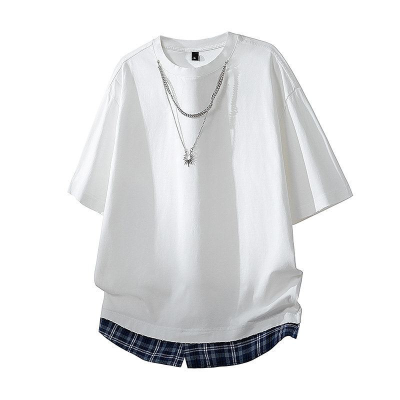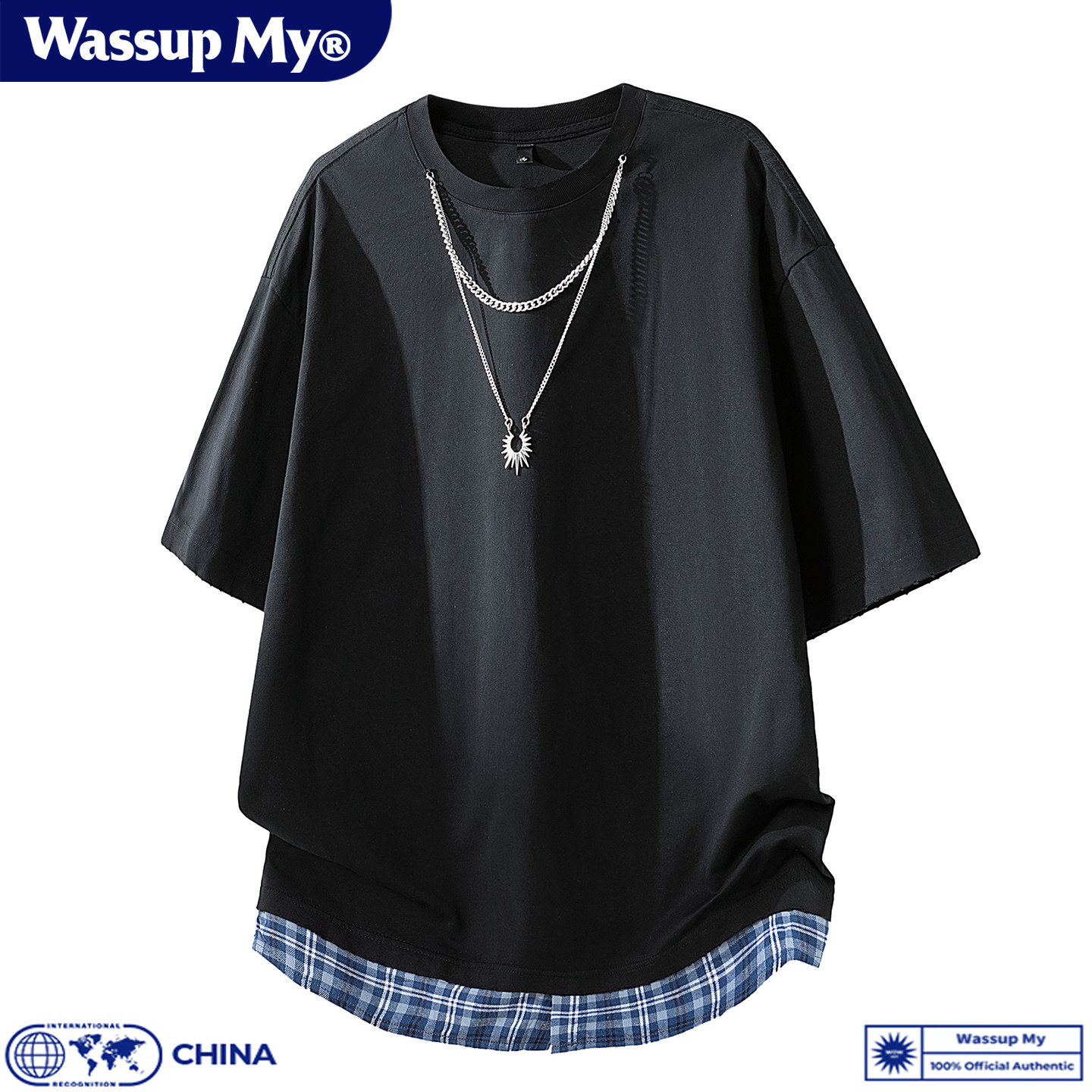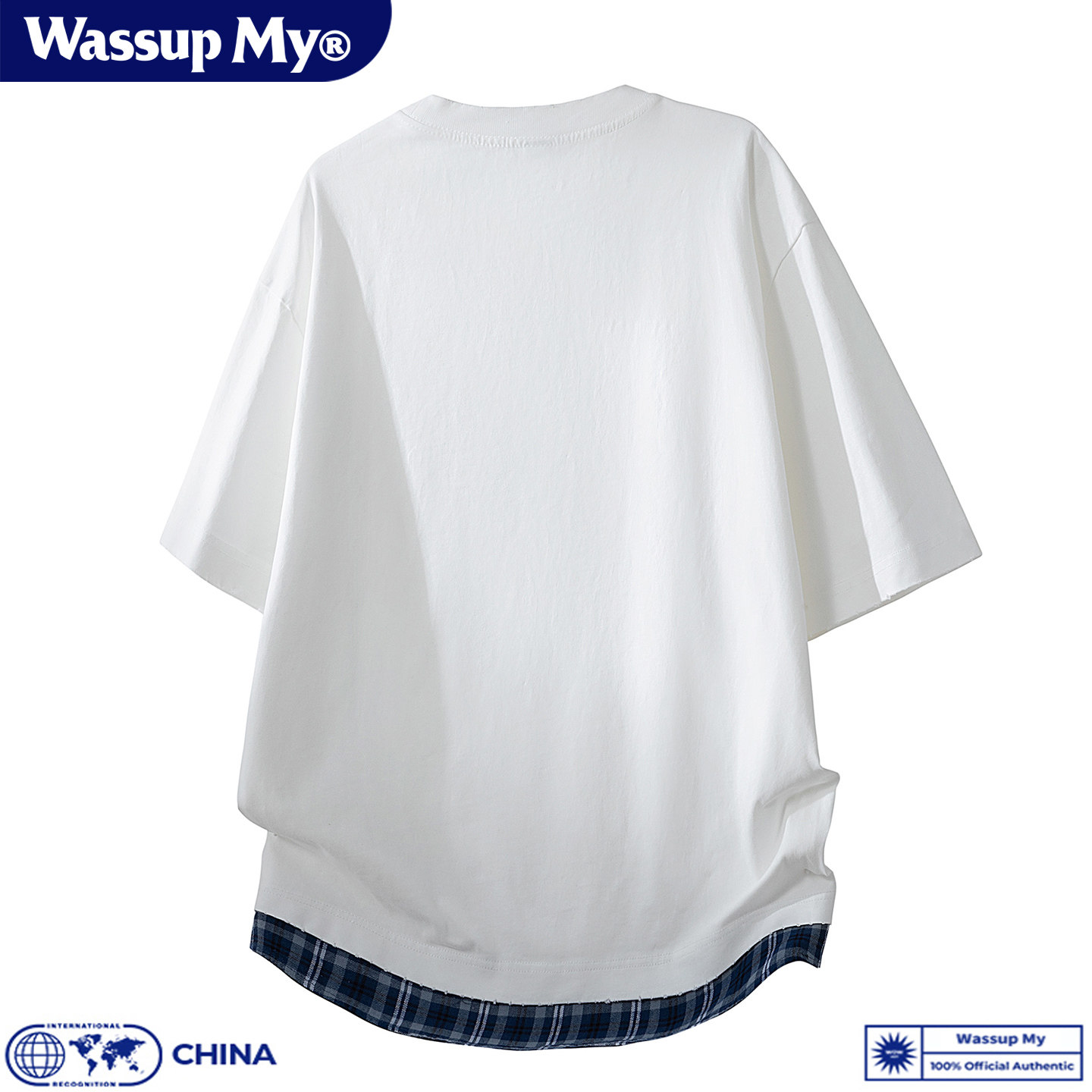 WASSUP MY潮牌假两件格子拼接纯棉短袖T恤男宽松圆领百搭休闲上衣