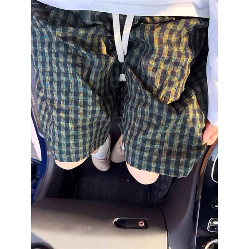 泡泡纱格子短裤男女夏季肌理感宽松百搭五分裤美式覆古直筒宽裤