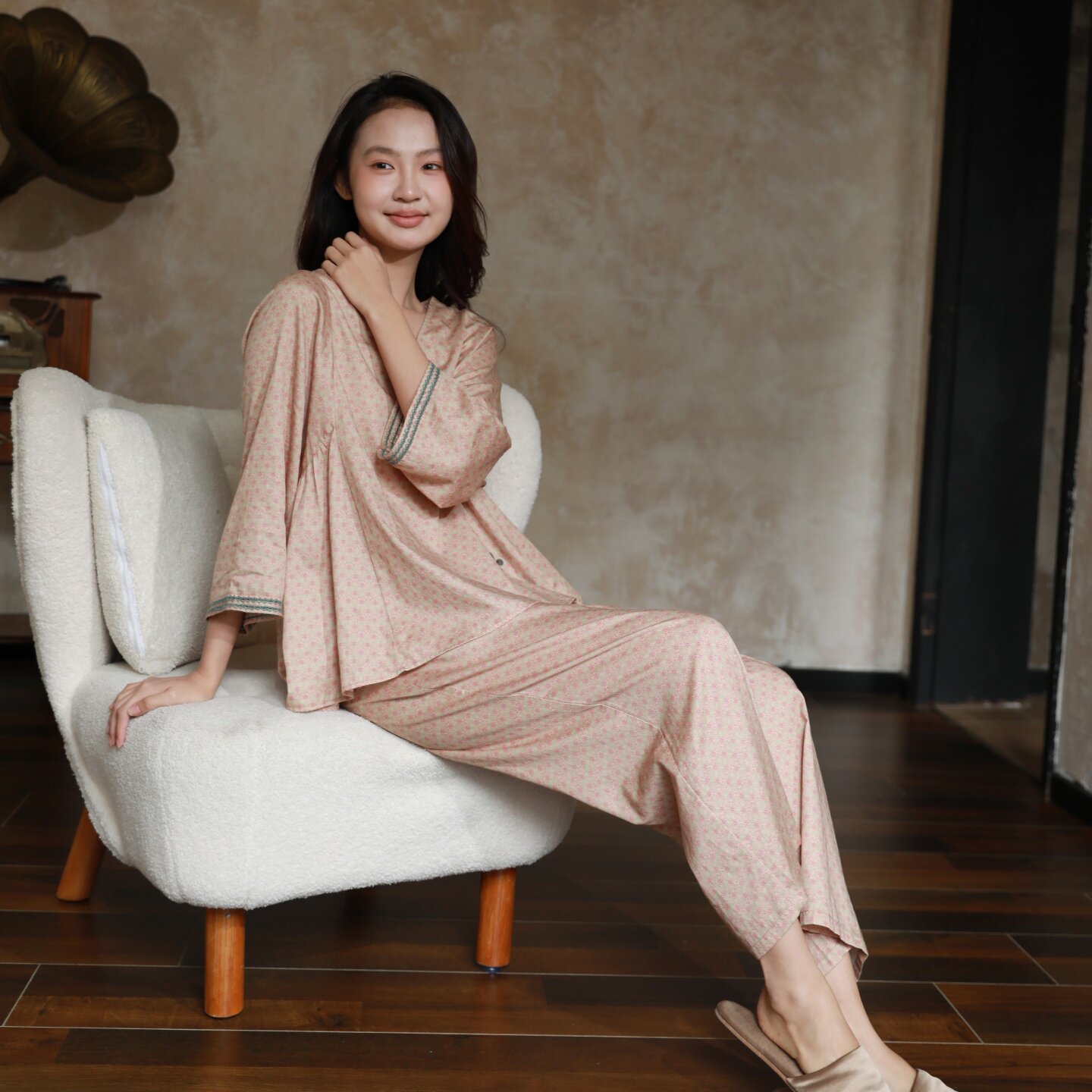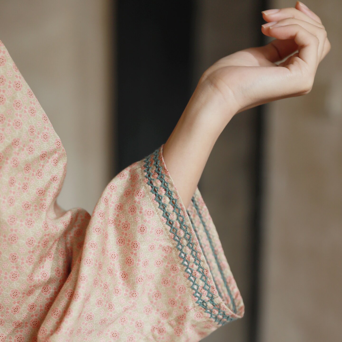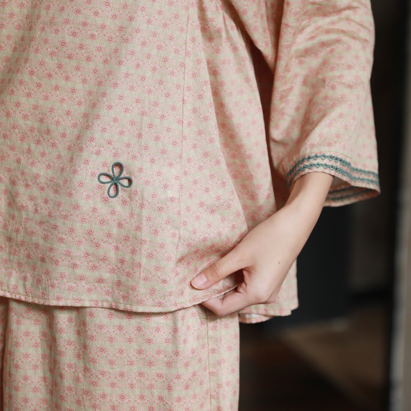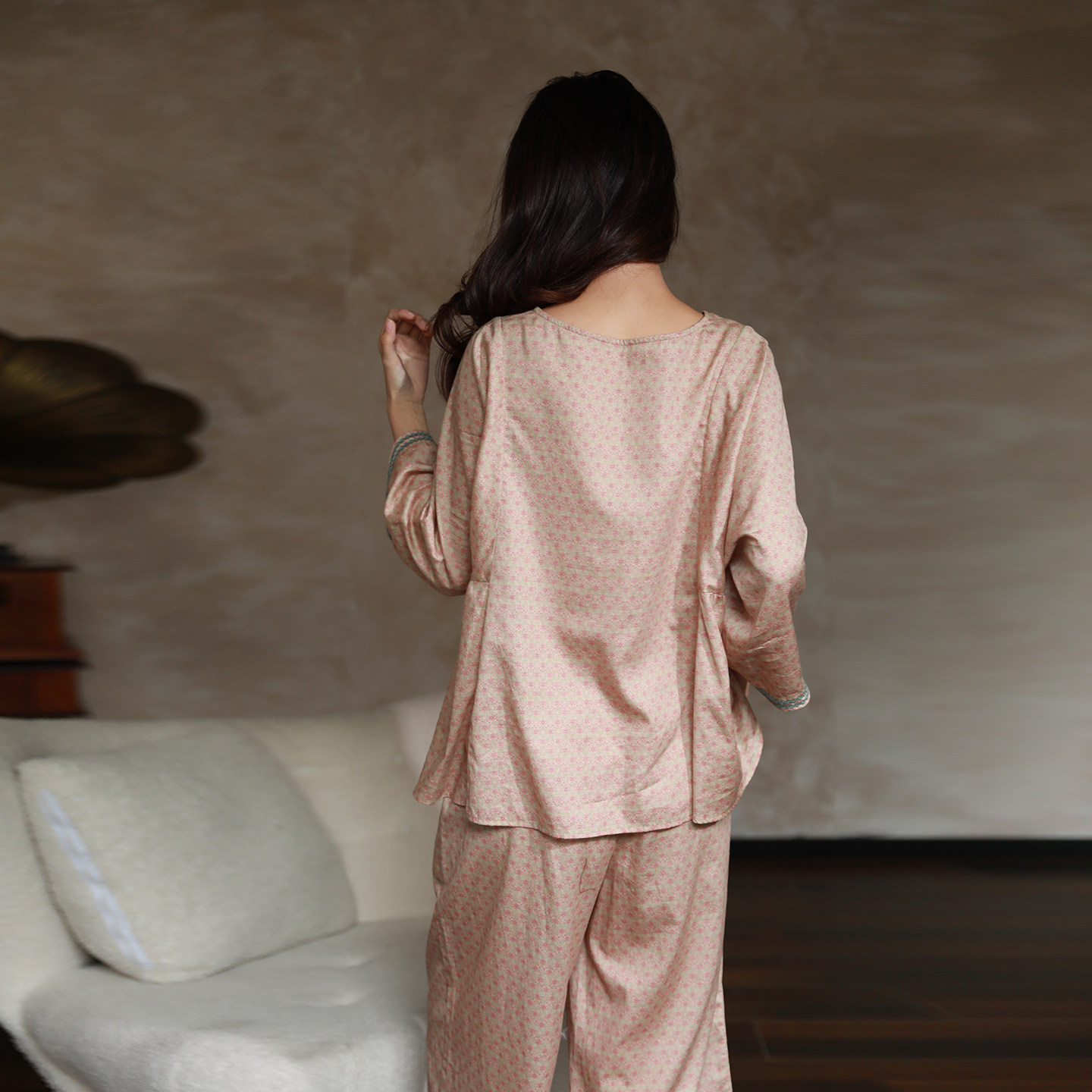 --------------------- 朵朵可可睡衣女2026春夏新品 纯棉贡缎印花 V领九分袖家居服套装 【原售价】569元 【现售价】430元 【推荐理由】