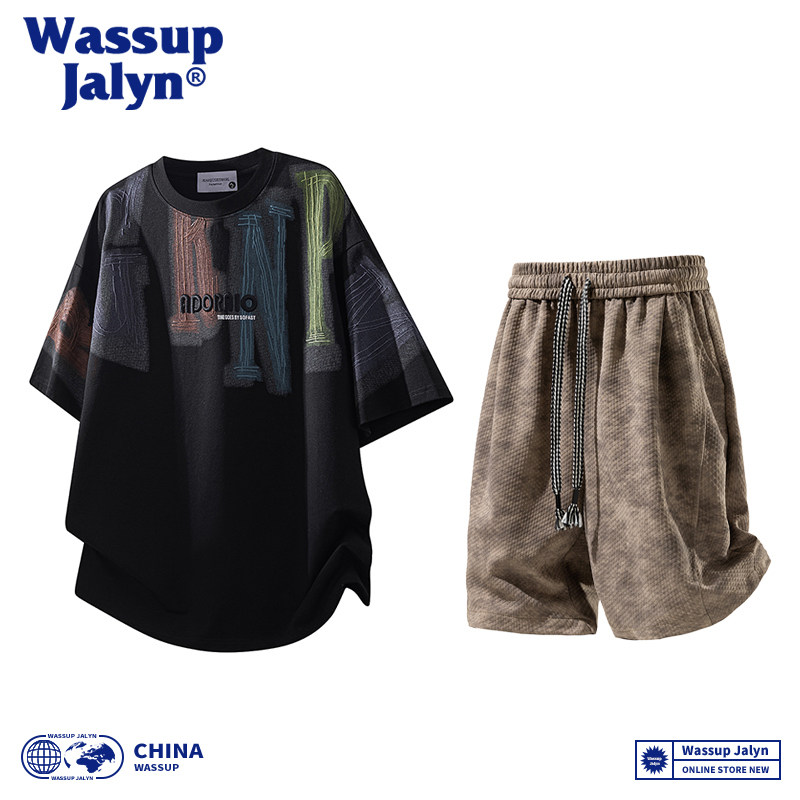 淘宝WASSUP JALYN潮牌运动套装男款美式休闲短袖T恤夏季沙滩短裤套装