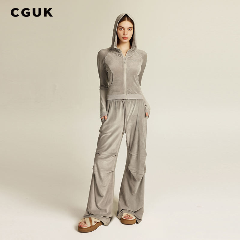 【林允同款】CGUK 新款女士丝绒修身连帽拼接外套丝绒捏褶阔腿裤