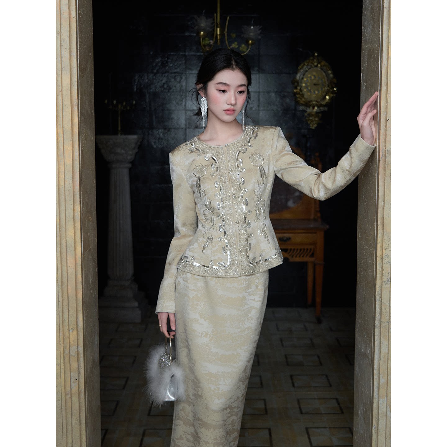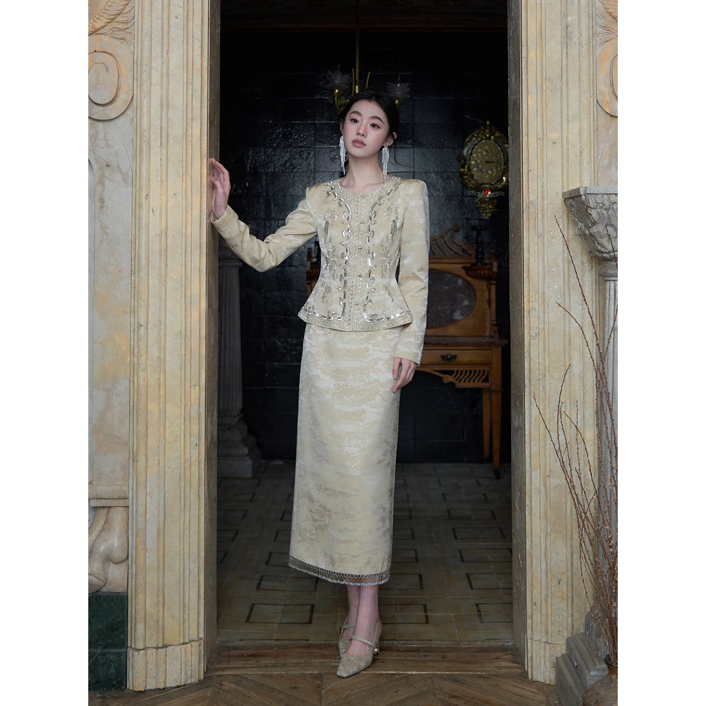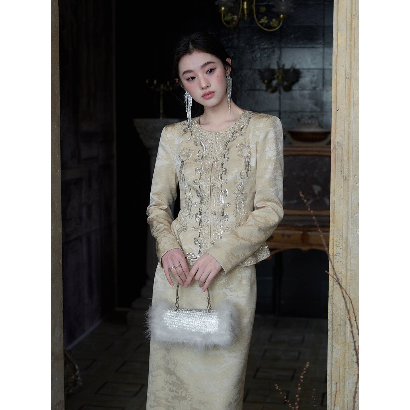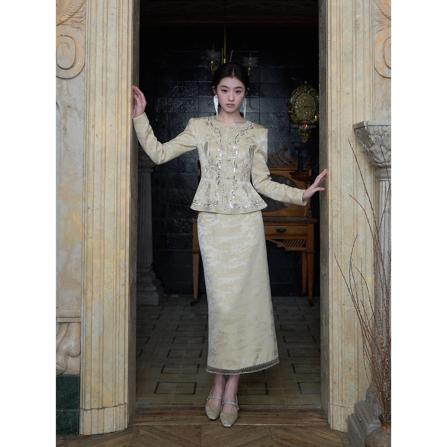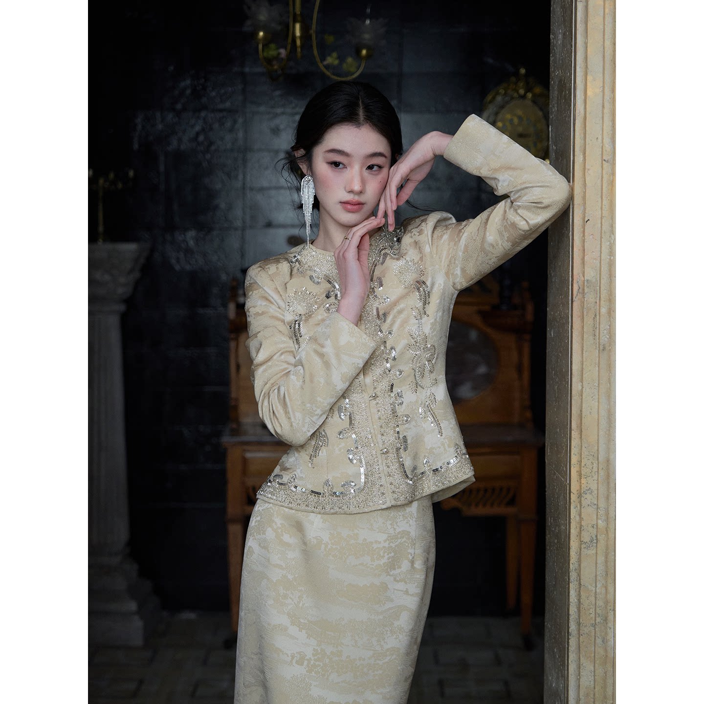 MOPASSANT【鎏华年】新中式春夏醋酸刺绣修身收腰拼接套装