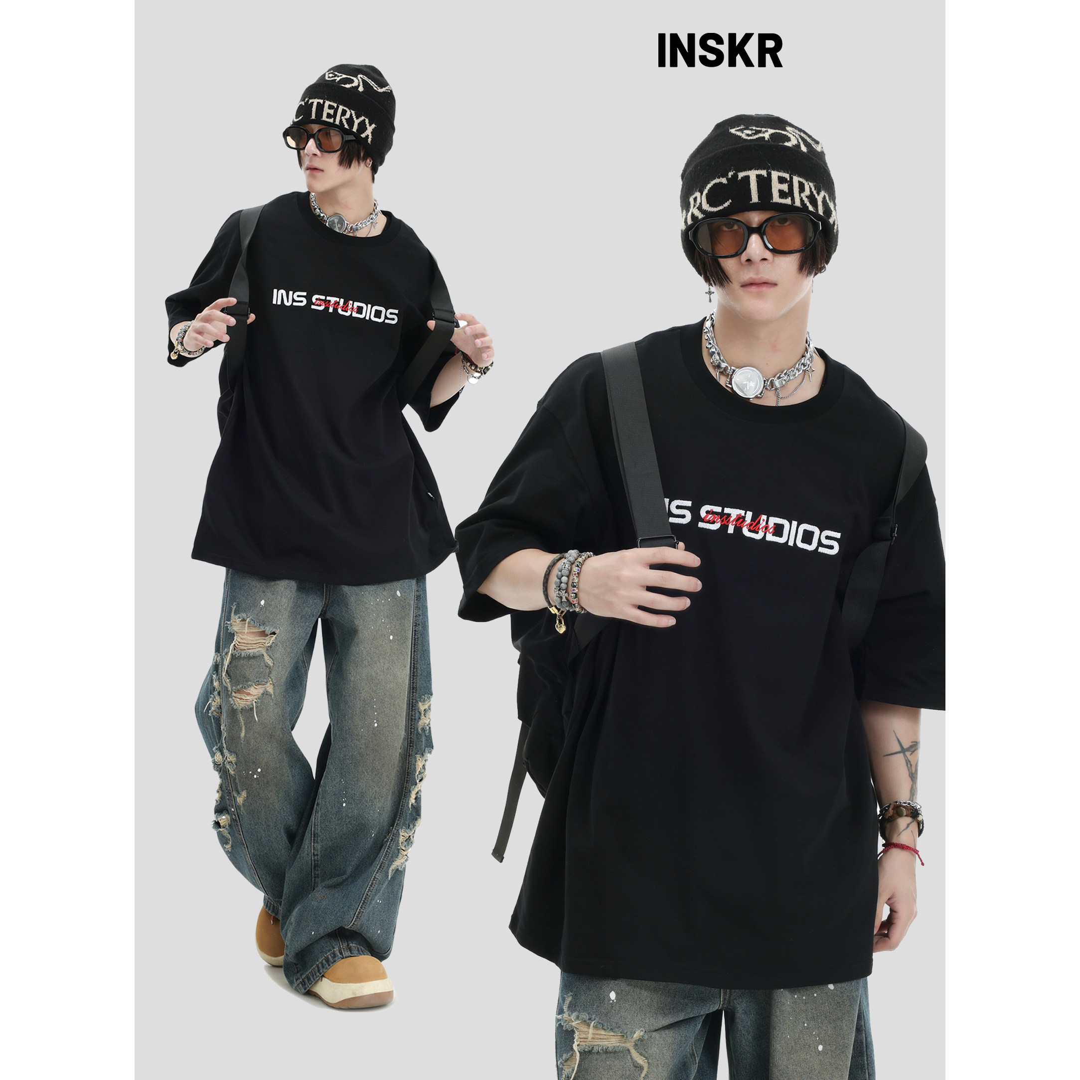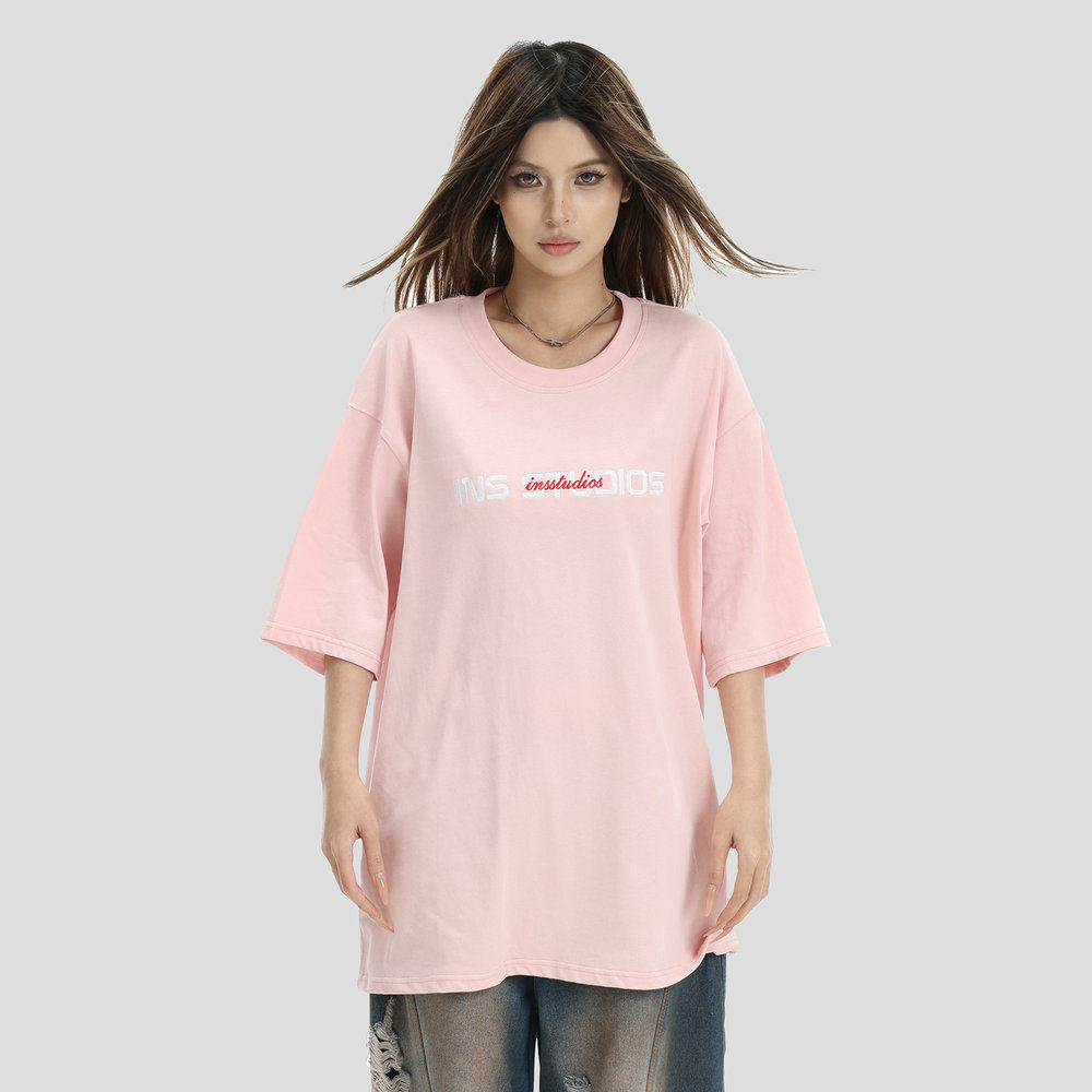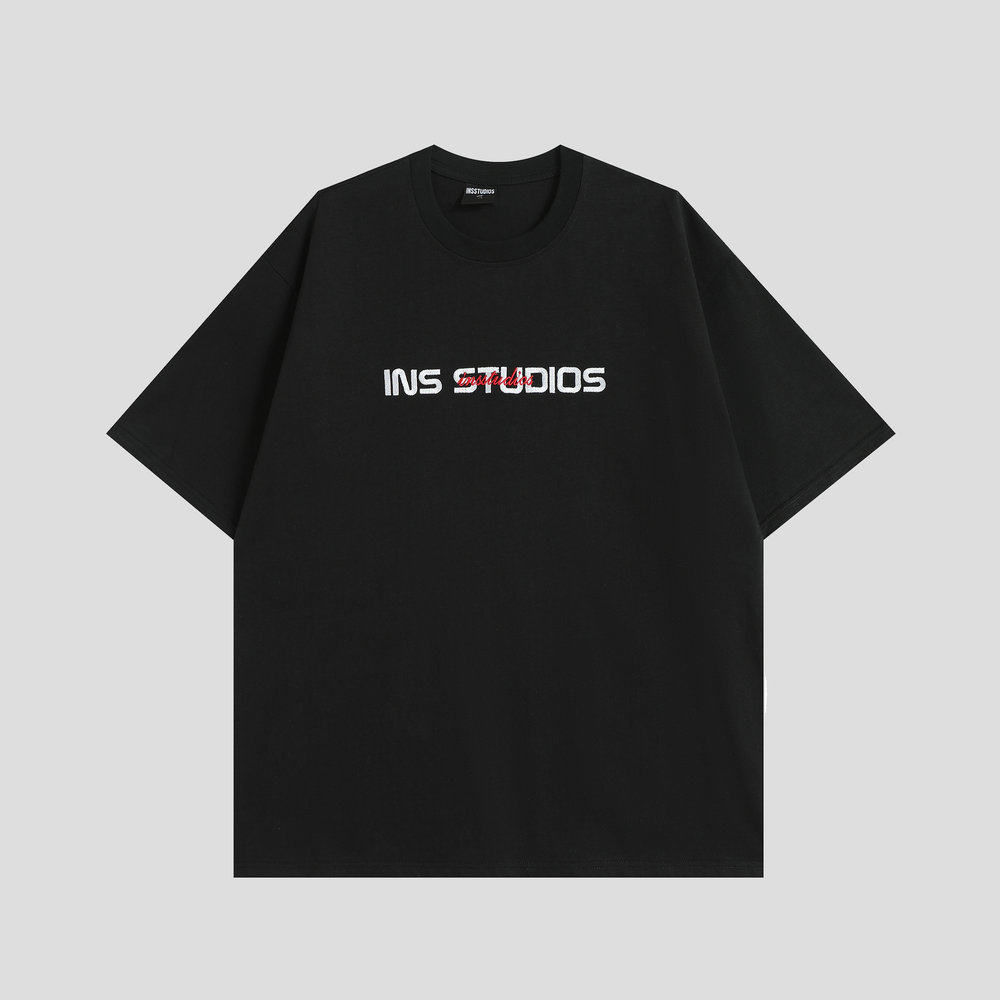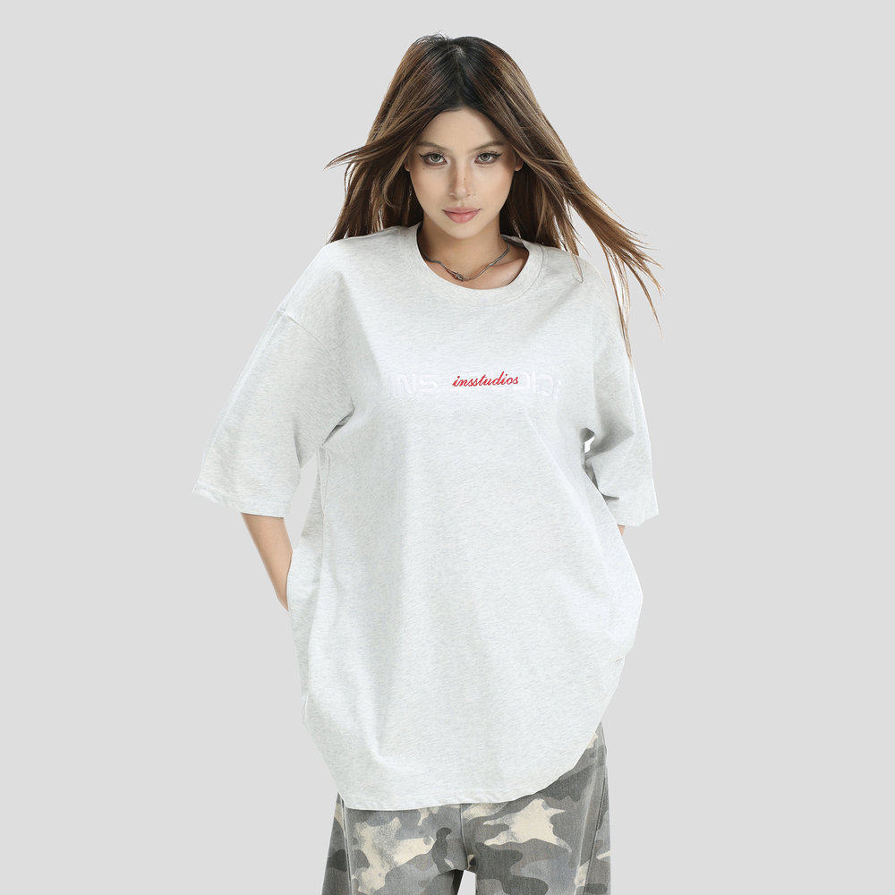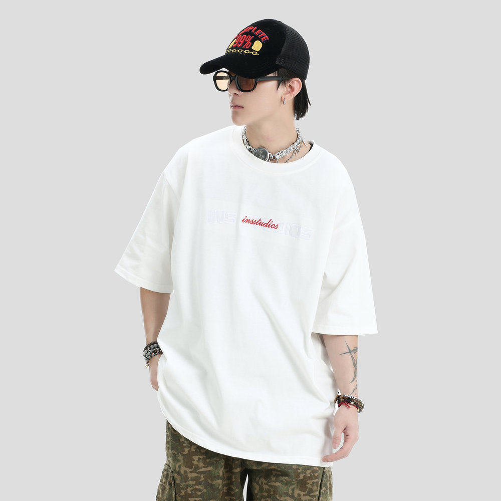 【INSKR】国潮牌情侣美式复古重叠刺绣LOGO短袖宽松纯棉半袖T恤男