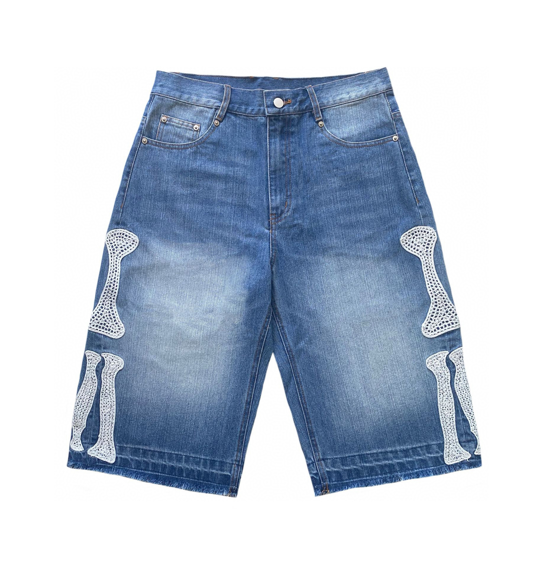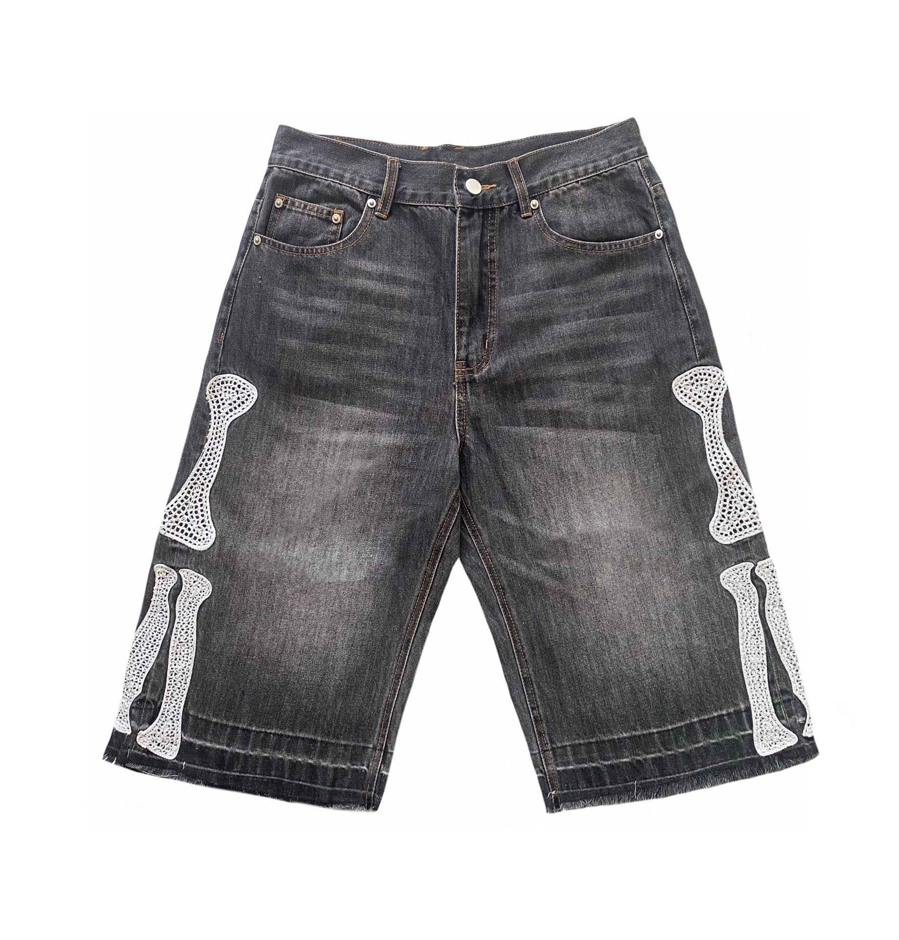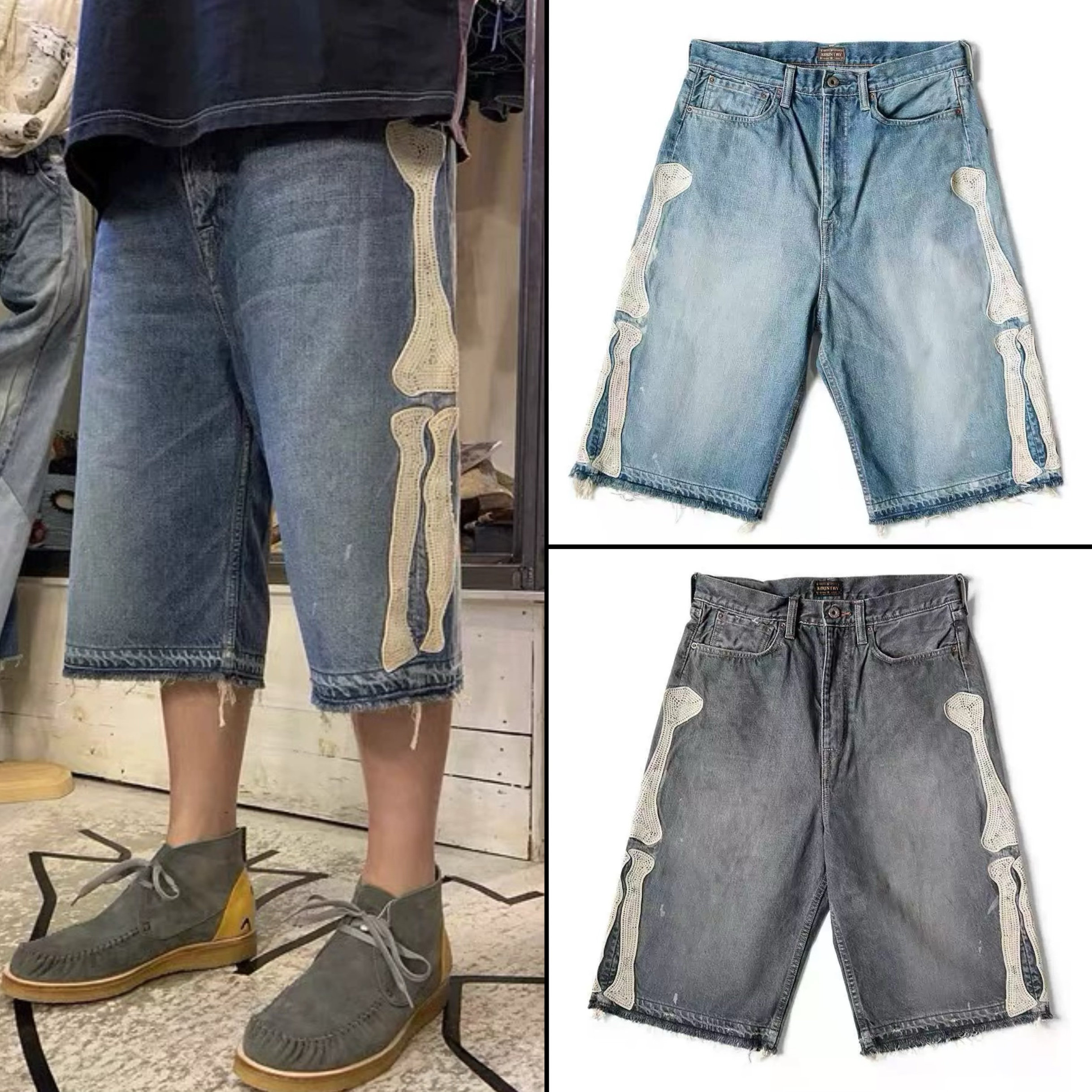 --------------------- KAPITAL平田和宏 宽松休闲裤刺绣骨头洗水做旧毛边牛仔短裤男女款 【原售价】178元 【现售价】178元 【推荐理由】