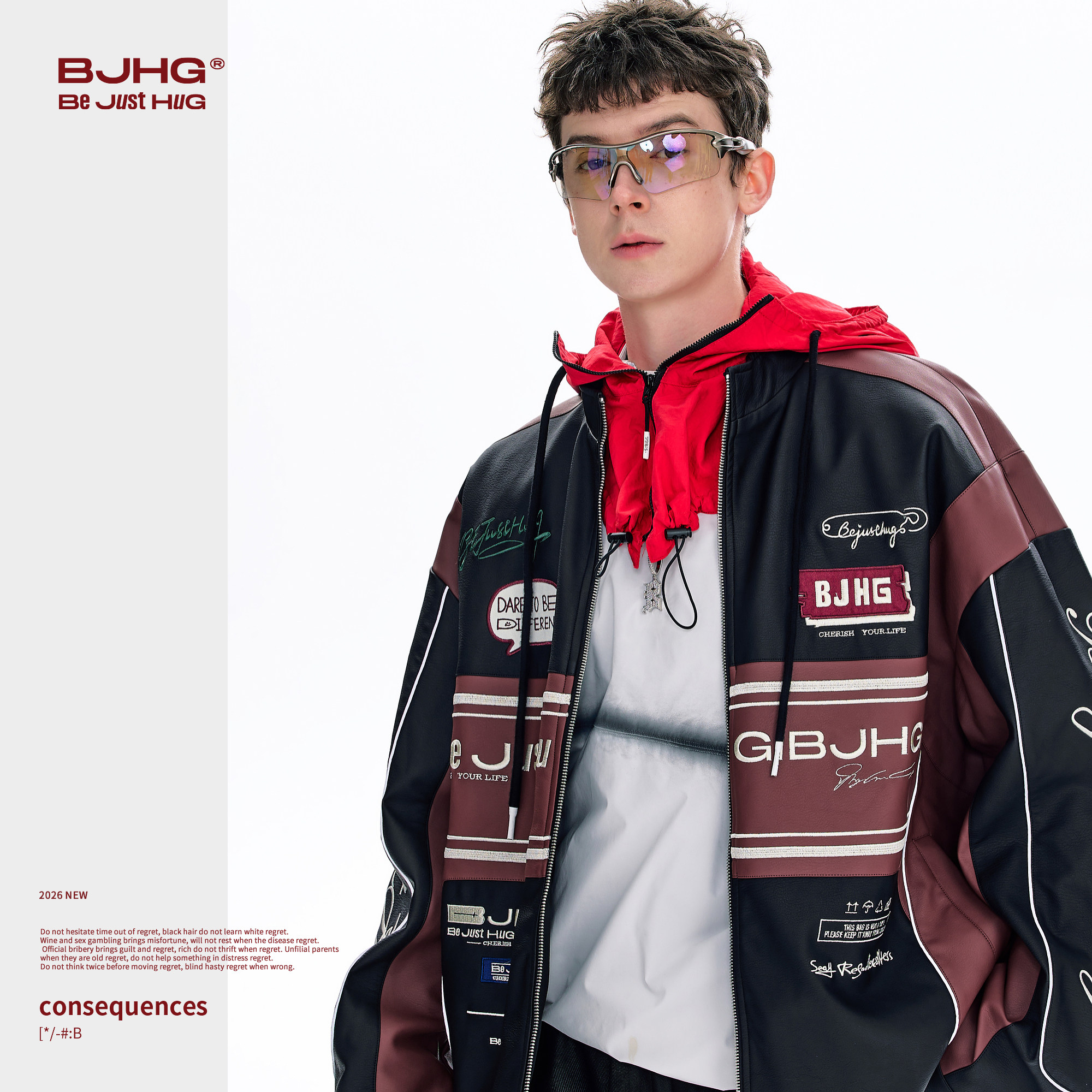 BJHG不计后果机车风夹克外套男款春季美式刺绣蛋白皮棒球服皮衣女