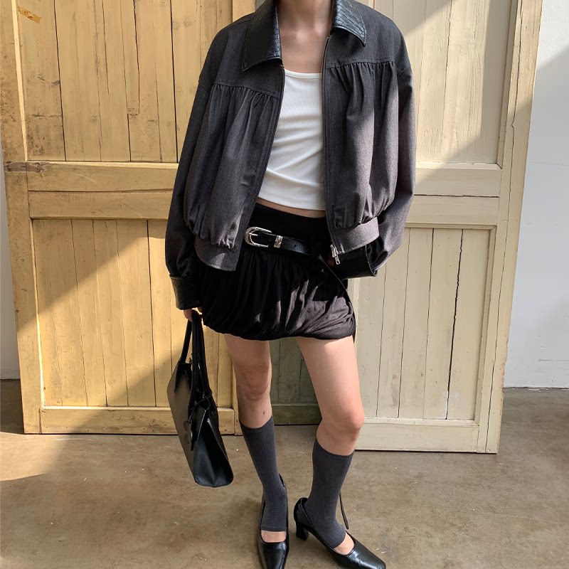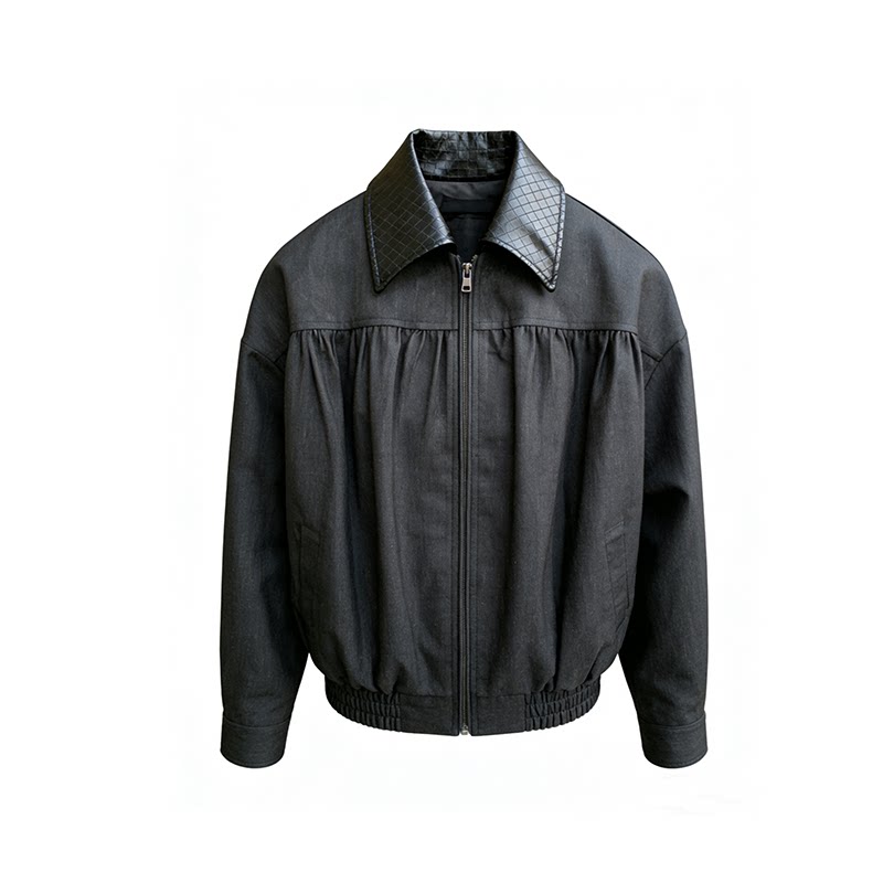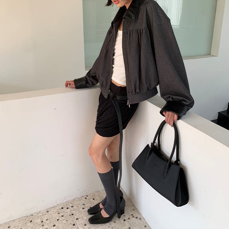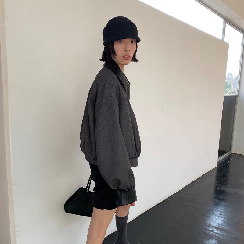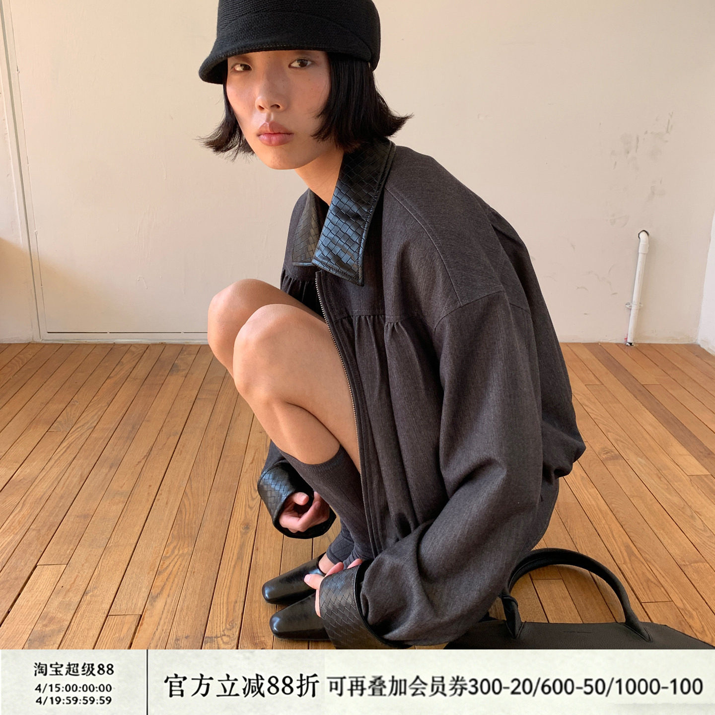 JCAESAR WOMEN 编织皮领短外套 抽褶花苞压纹拼接皮料 H型短宽