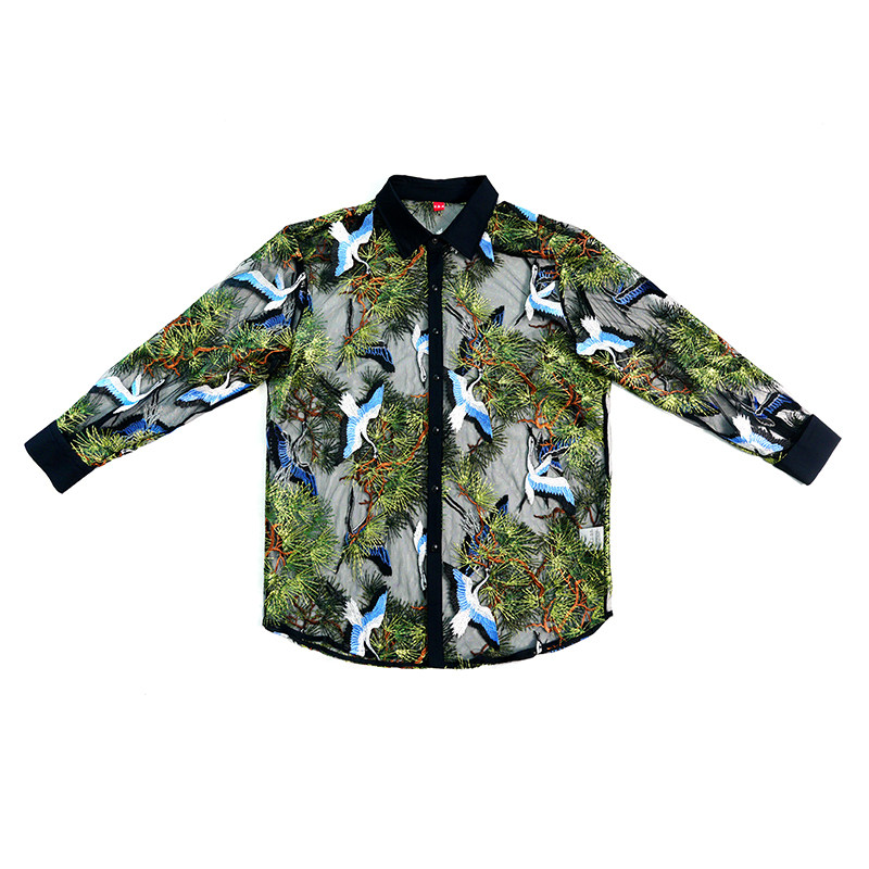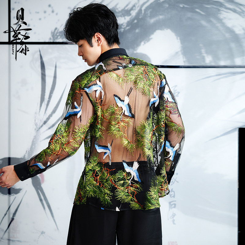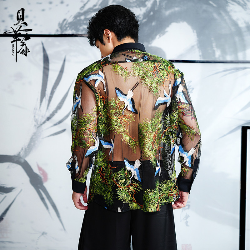 贝勒府<松柏仙鹤>中国风刺绣衬衫秋季半透明长袖衬衫外套送背心