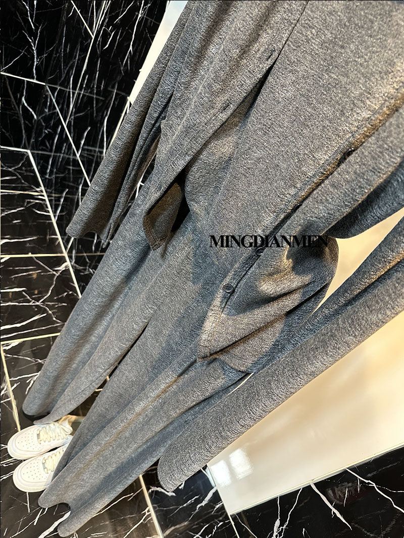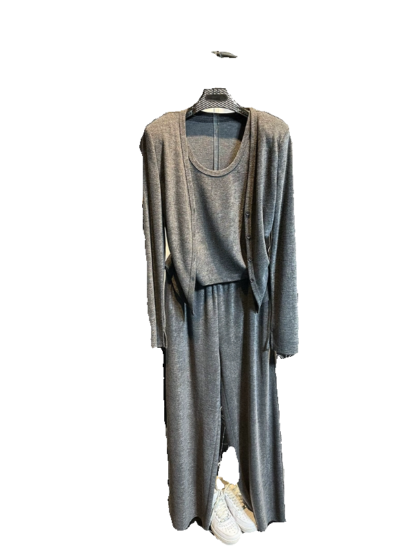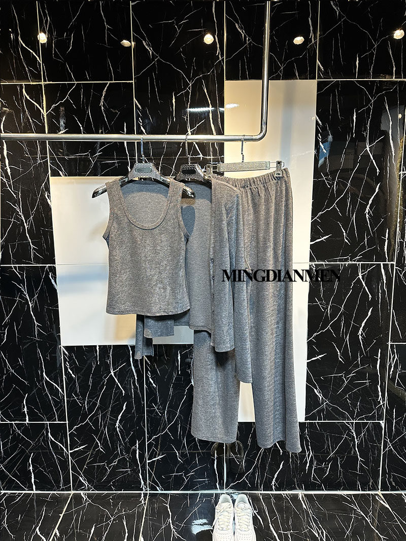 春秋高级感灰色系穿搭开衫背心休闲长裤2026气质显瘦百搭三件套装