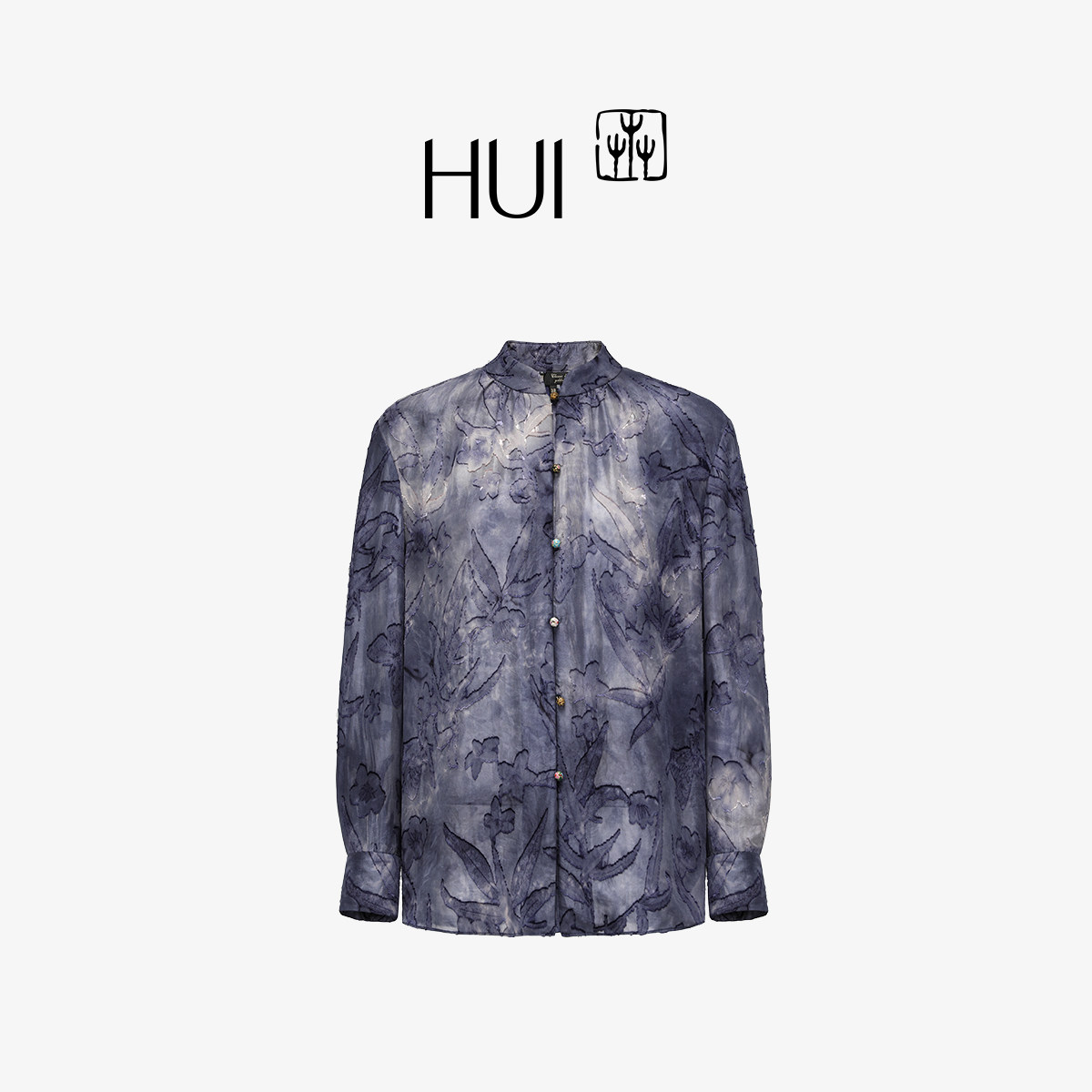 HUI卉琉璃瓦蓝真丝烧花中式立领景泰蓝珠非遗衬衫上衣2026春新款