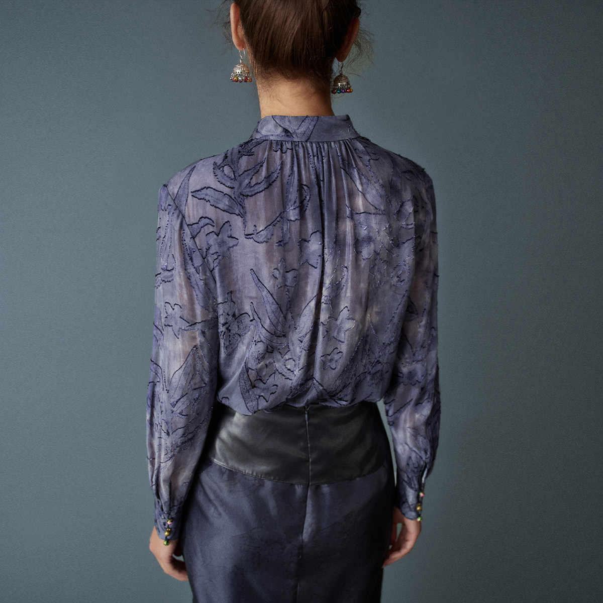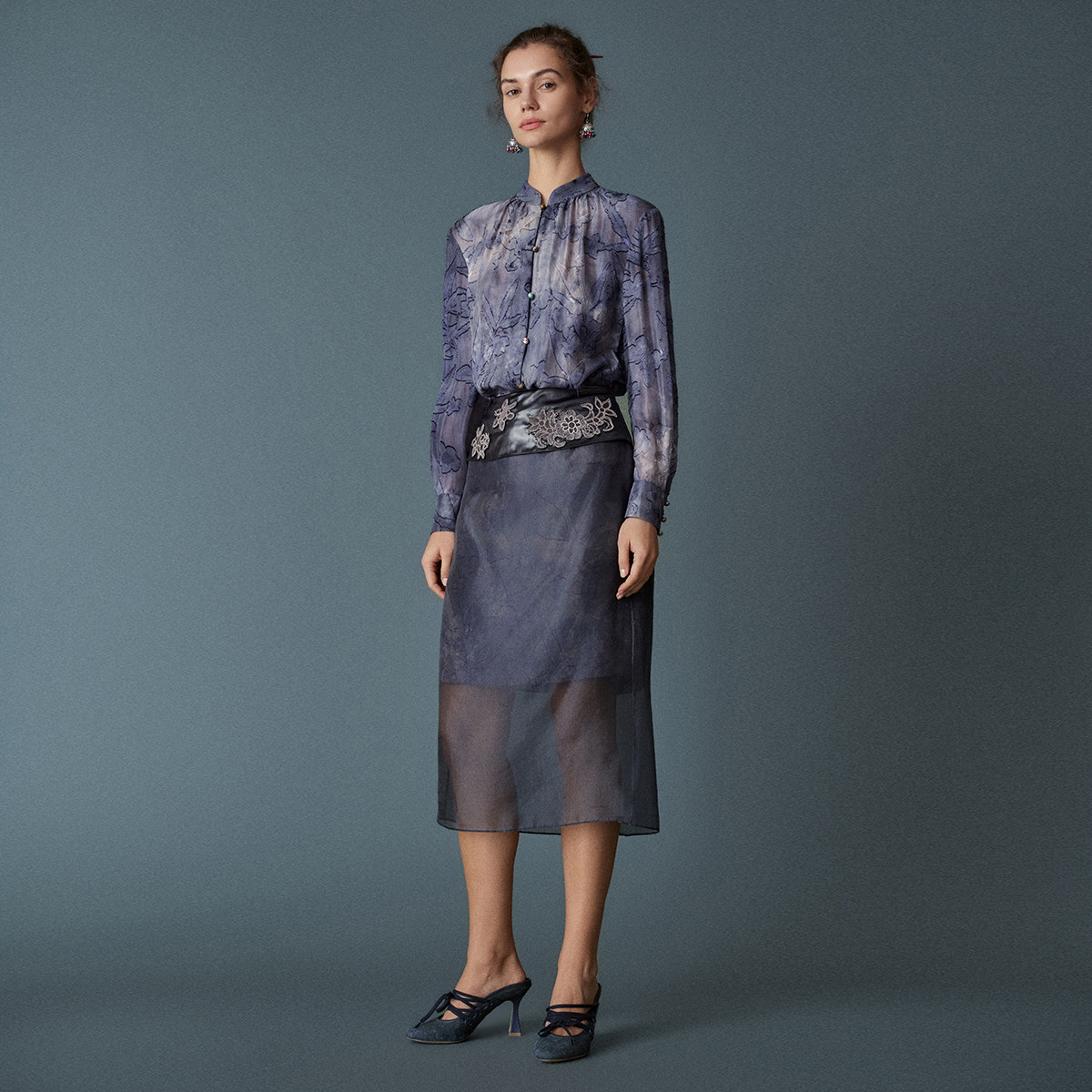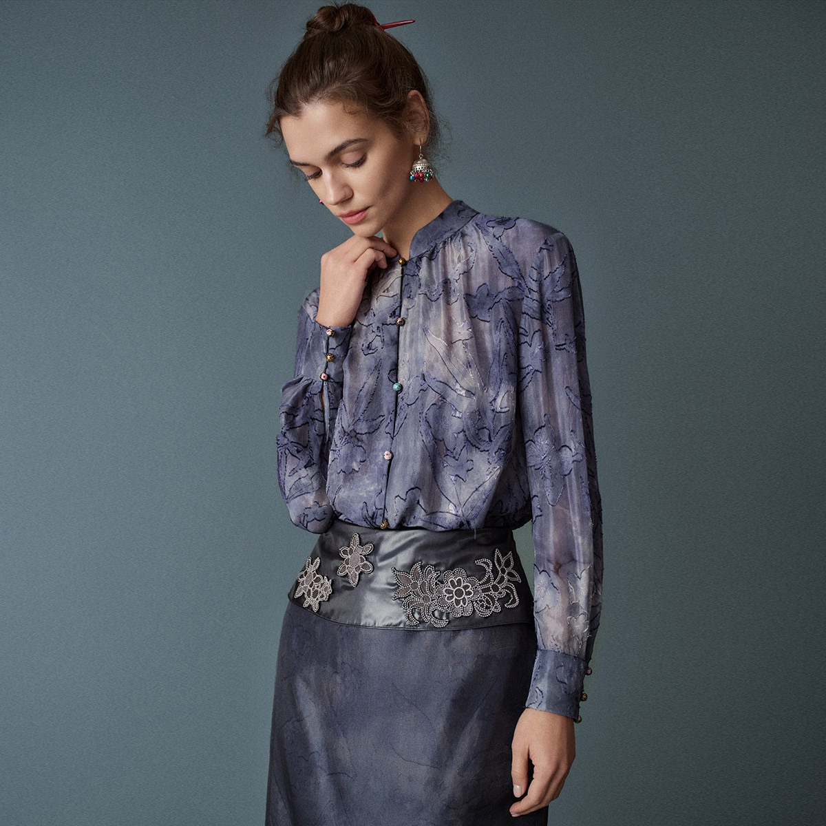 --------------------- HUI卉琉璃瓦蓝真丝烧花中式立领景泰蓝珠非遗衬衫上衣2026春新款 【原售价】3199元 【现售价】2879元 【推荐理由】
