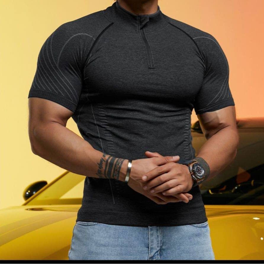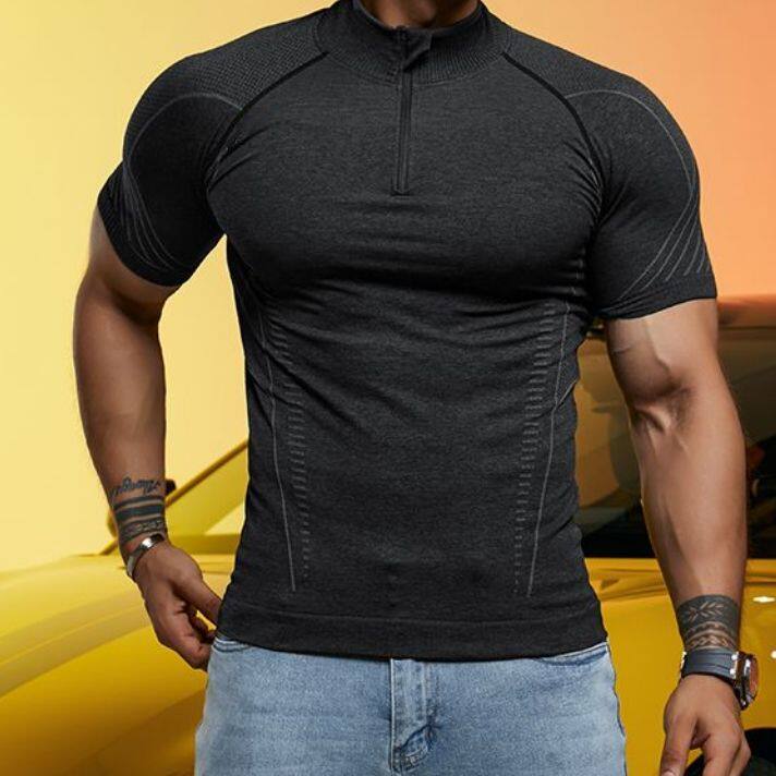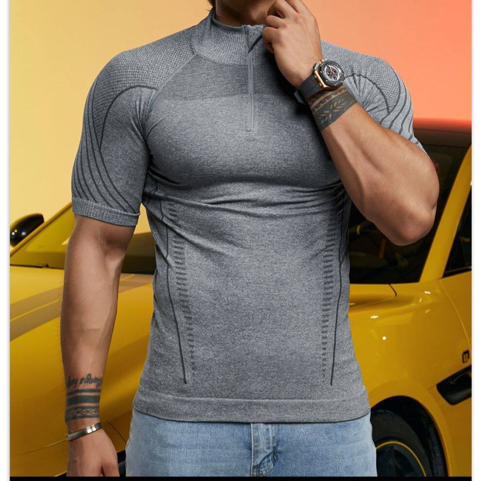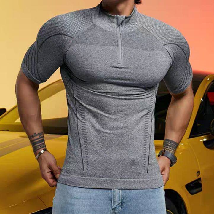 灰色健身运动半拉链短袖T恤衫男装2026夏季修身透气速干训练上衣