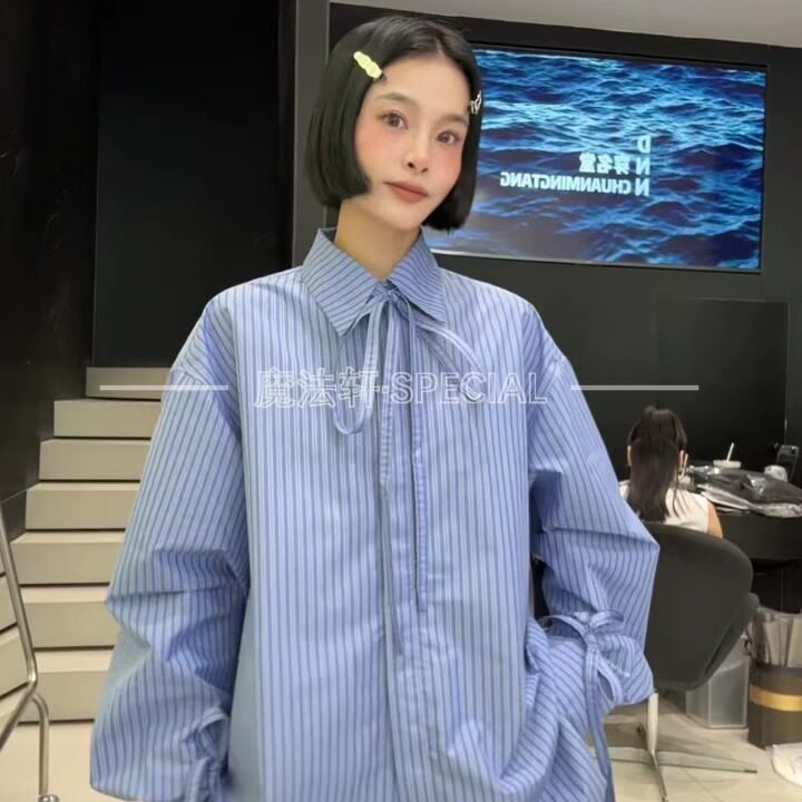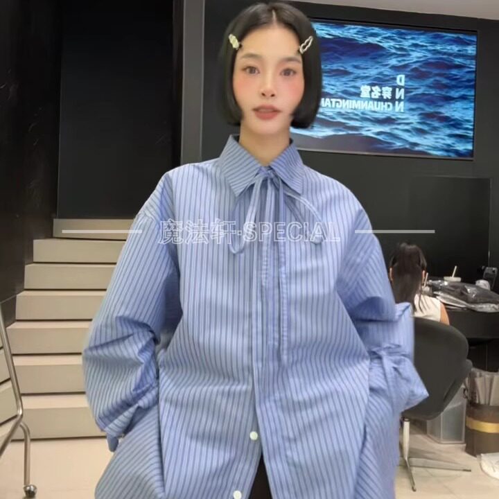 【现货】条纹衬衫女长袖2025新款翻领蝴蝶结中长款宽松欧货上衣q