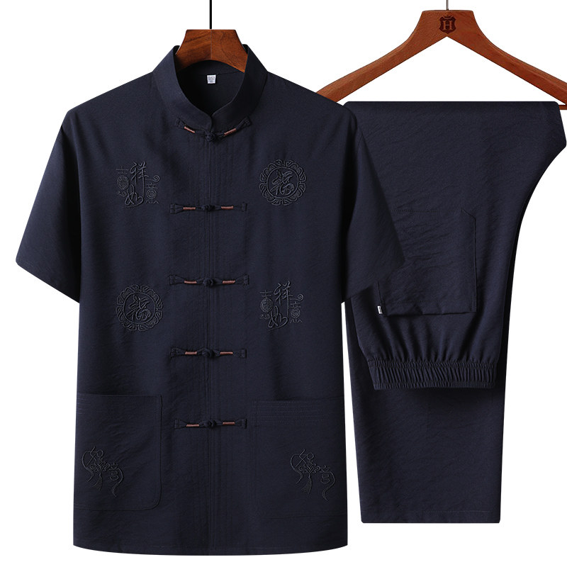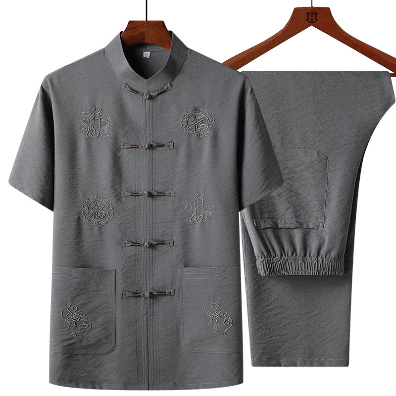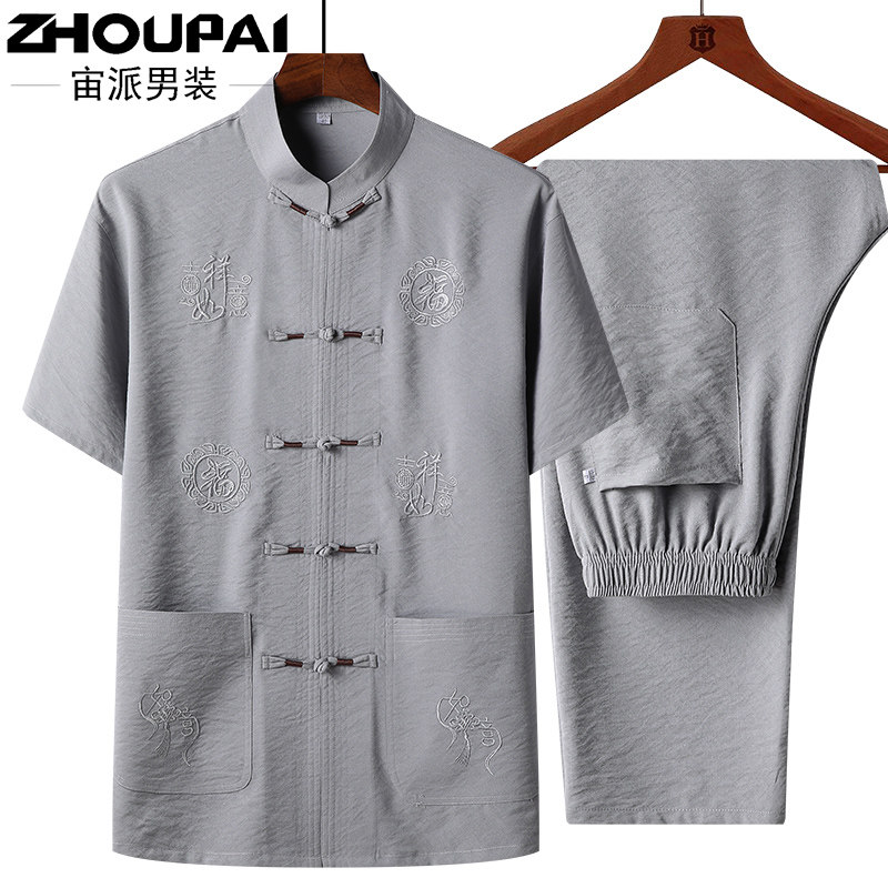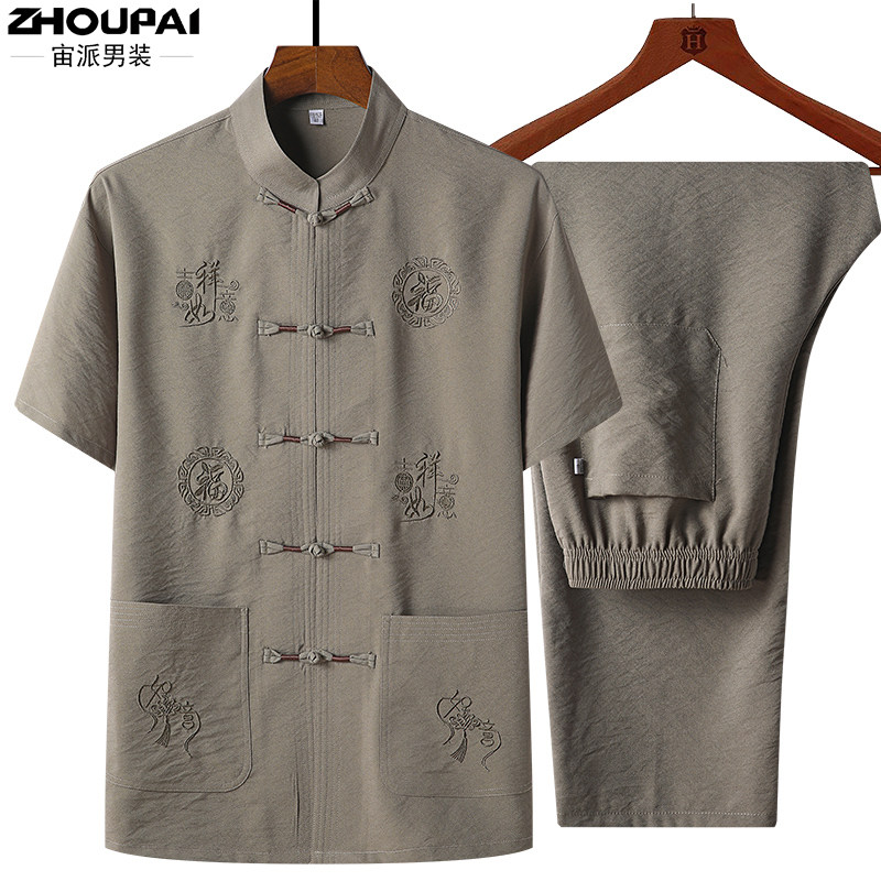 中老年唐装男士爸爸夏装亚麻套装中国风爷爷薄款宽松中式老人衣服